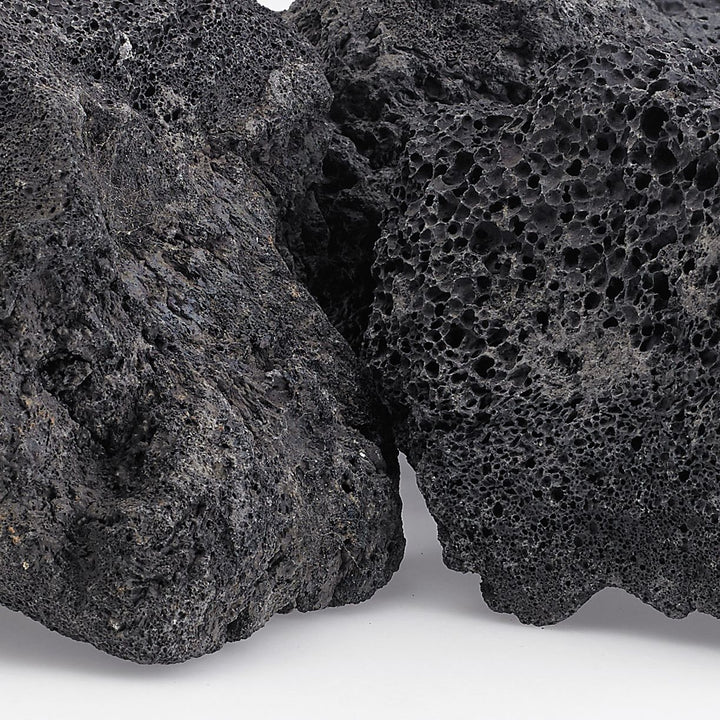 - Natural black lava rock with porous, rugged texture