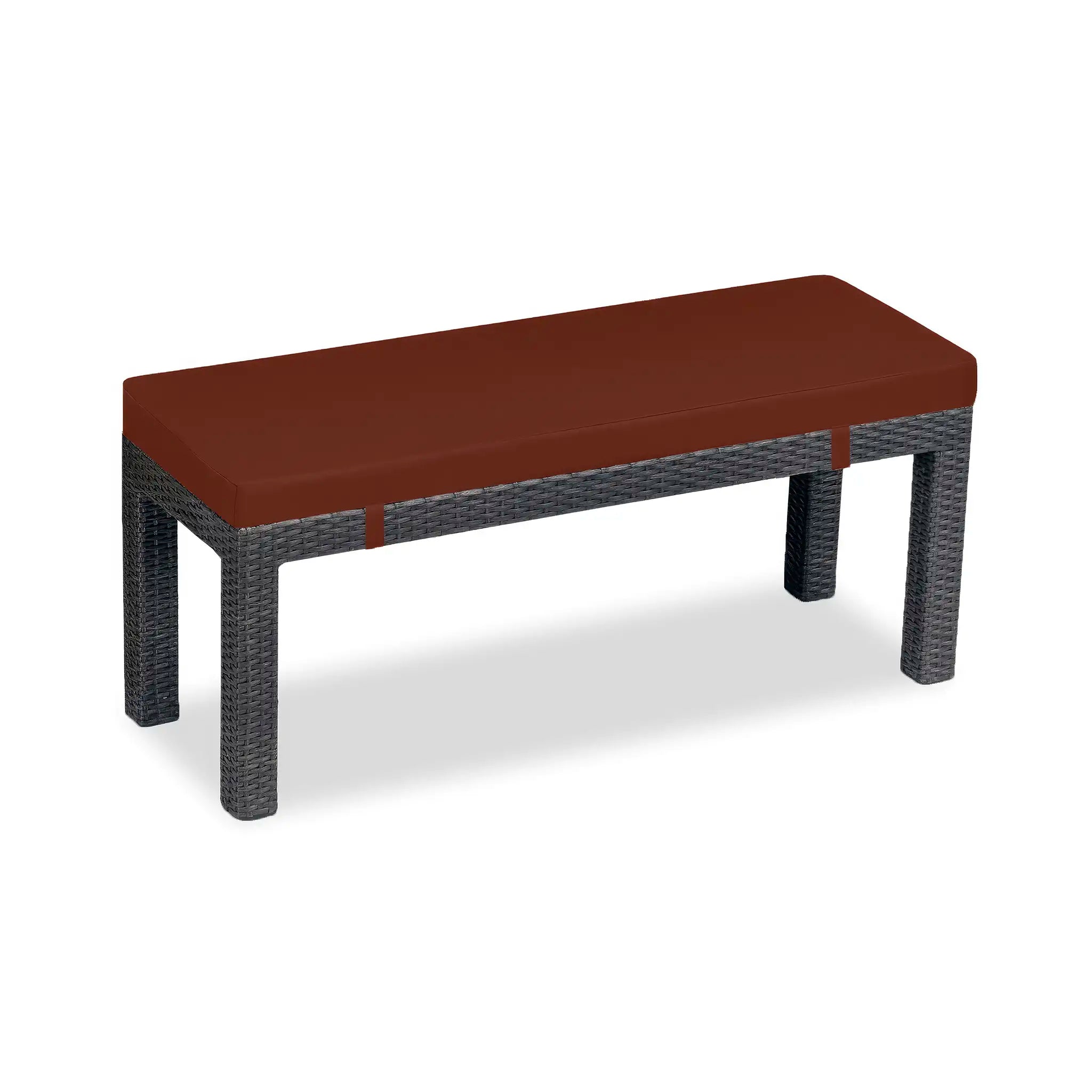 The bench is woven with High-Density Polyethylene (HDPE) wicker, which is hand-woven to ensure a superior quality finish. HDPE wicker is known for its resistance to cracking, fading, and wear, offering long-lasting durability in various weather conditions. The color is infused into the HDPE material, preventing fading over time, and it is finished in a rich, textured Chestnut color that gives the piece a warm, natural appearance.