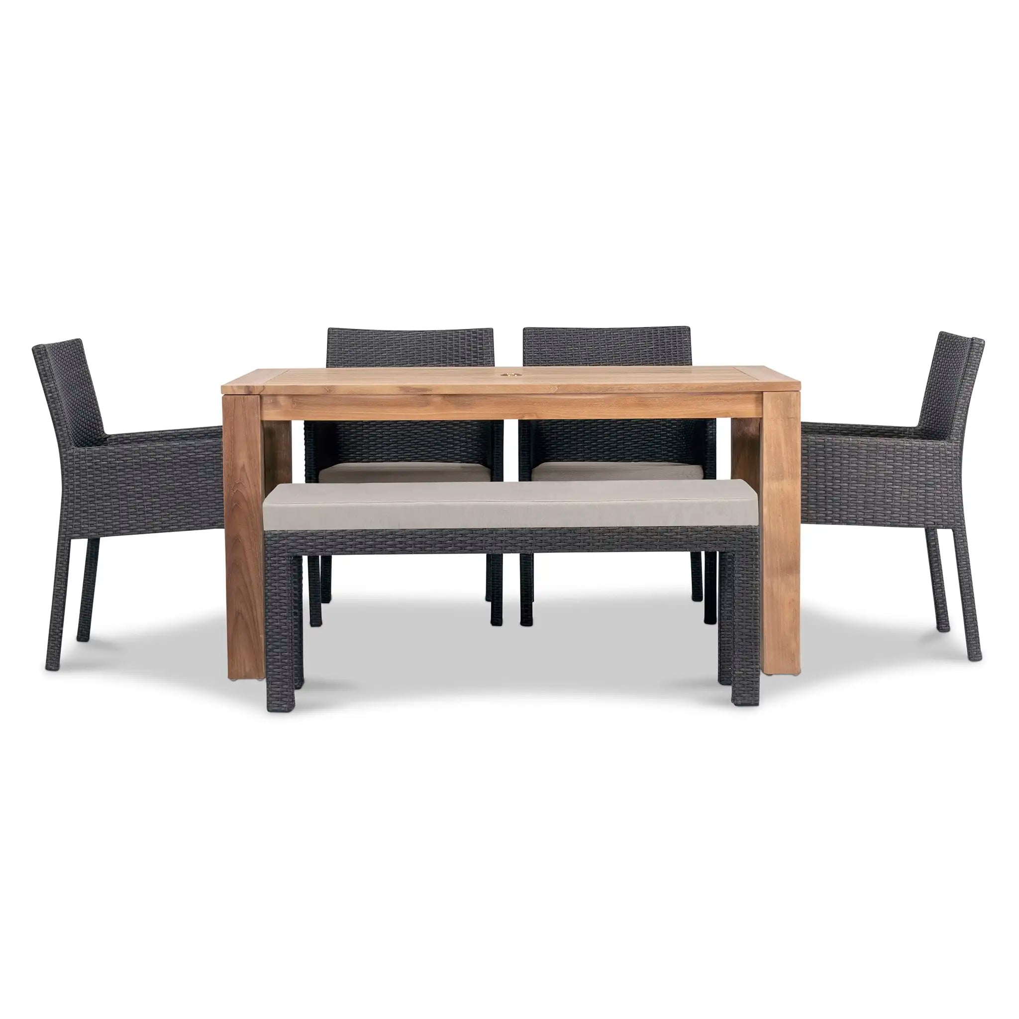Create the perfect outdoor gathering hotspot with the Harmonia Living Arden Teak 6 Piece Aluminum Bench Dining Set , designed to bring a cozy, rustic charm to your modern outdoor setting. This dining set features a striking combination of premium materials and expert craftsmanship, offering both style and durability that can endure across seasons. The fully-welded aluminum frames are treated with a powder-coated finish, ensuring that the structure remains strong and resistant to the elements over time. The hand-woven wicker is made from High-Density Polyethylene (HDPE), a highly durable material that resists cracking and fading. Infused with color, the HDPE wicker maintains its vibrant Chestnut hue, offering a natural, textured appearance that enhances the rustic appeal of your outdoor dining space.