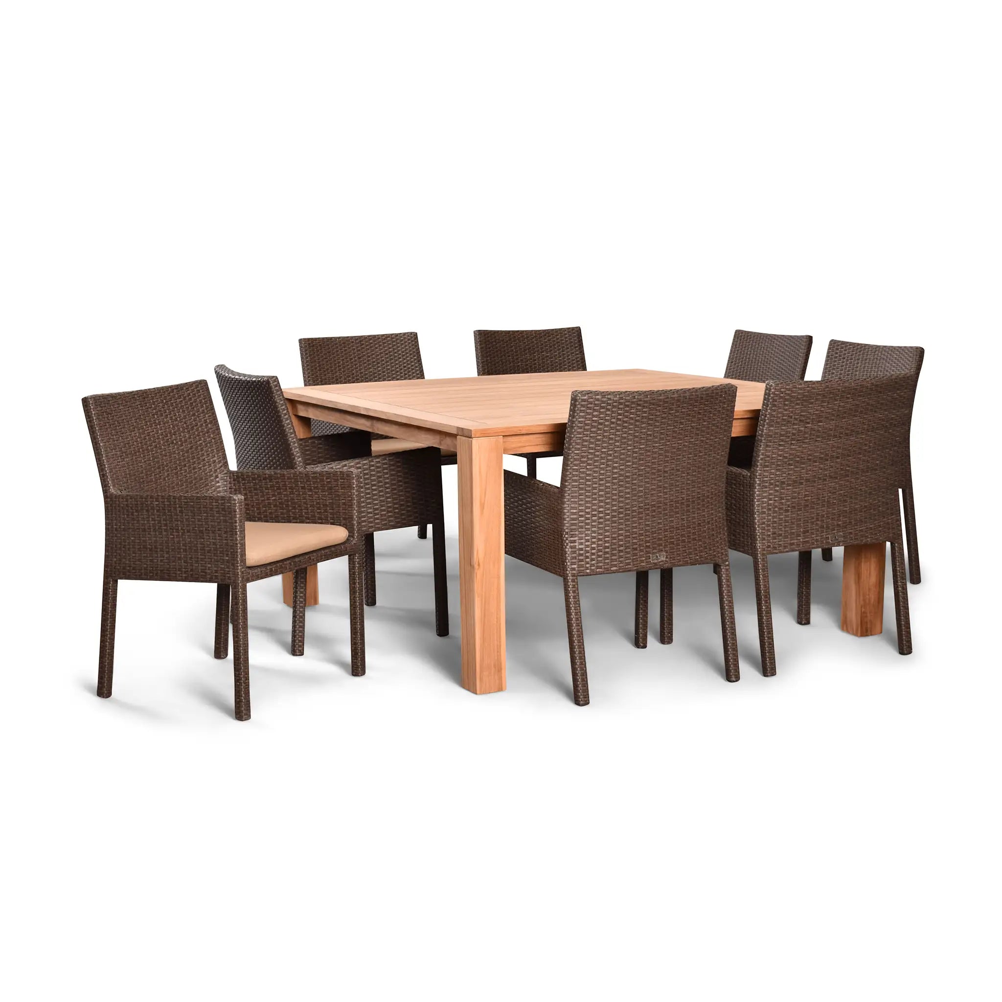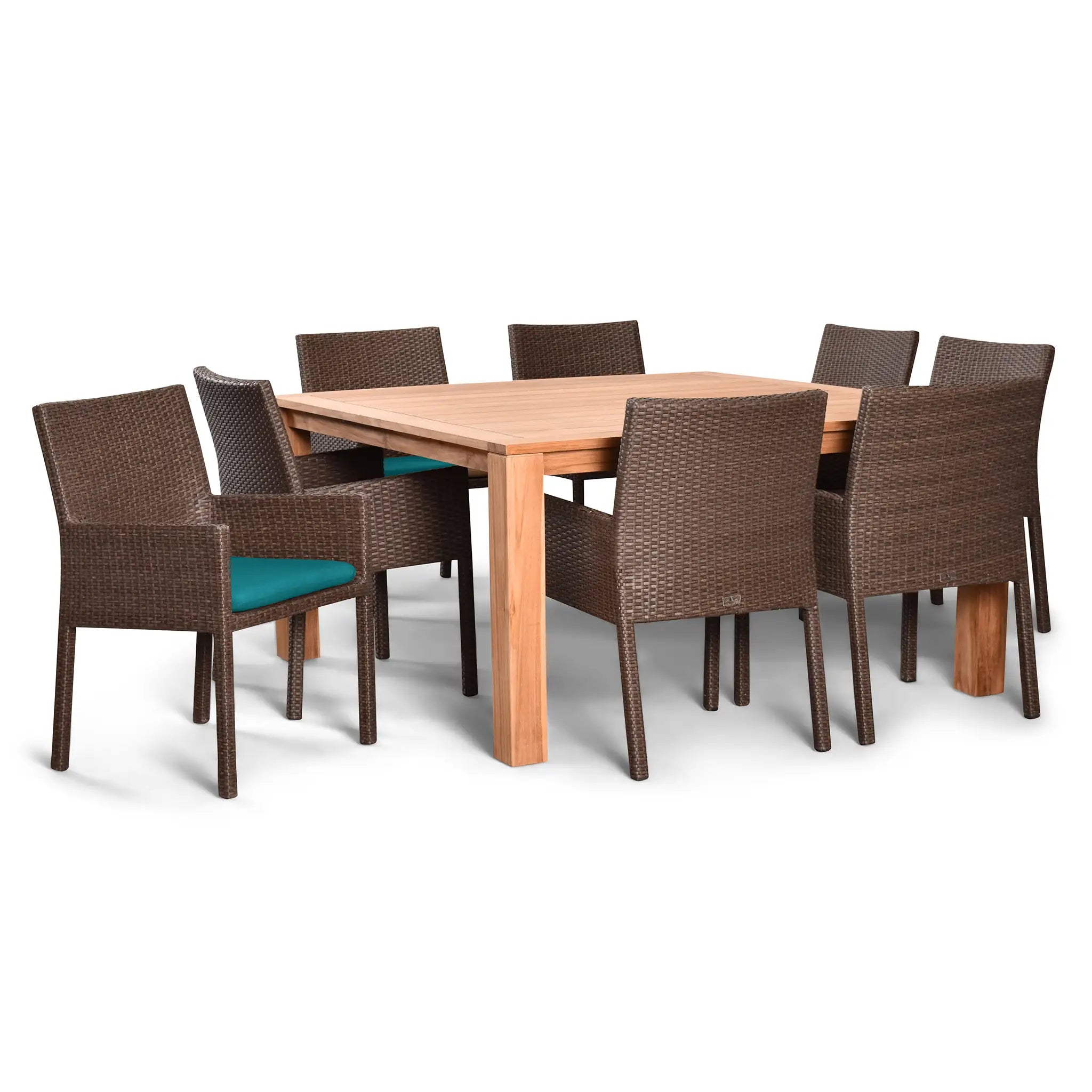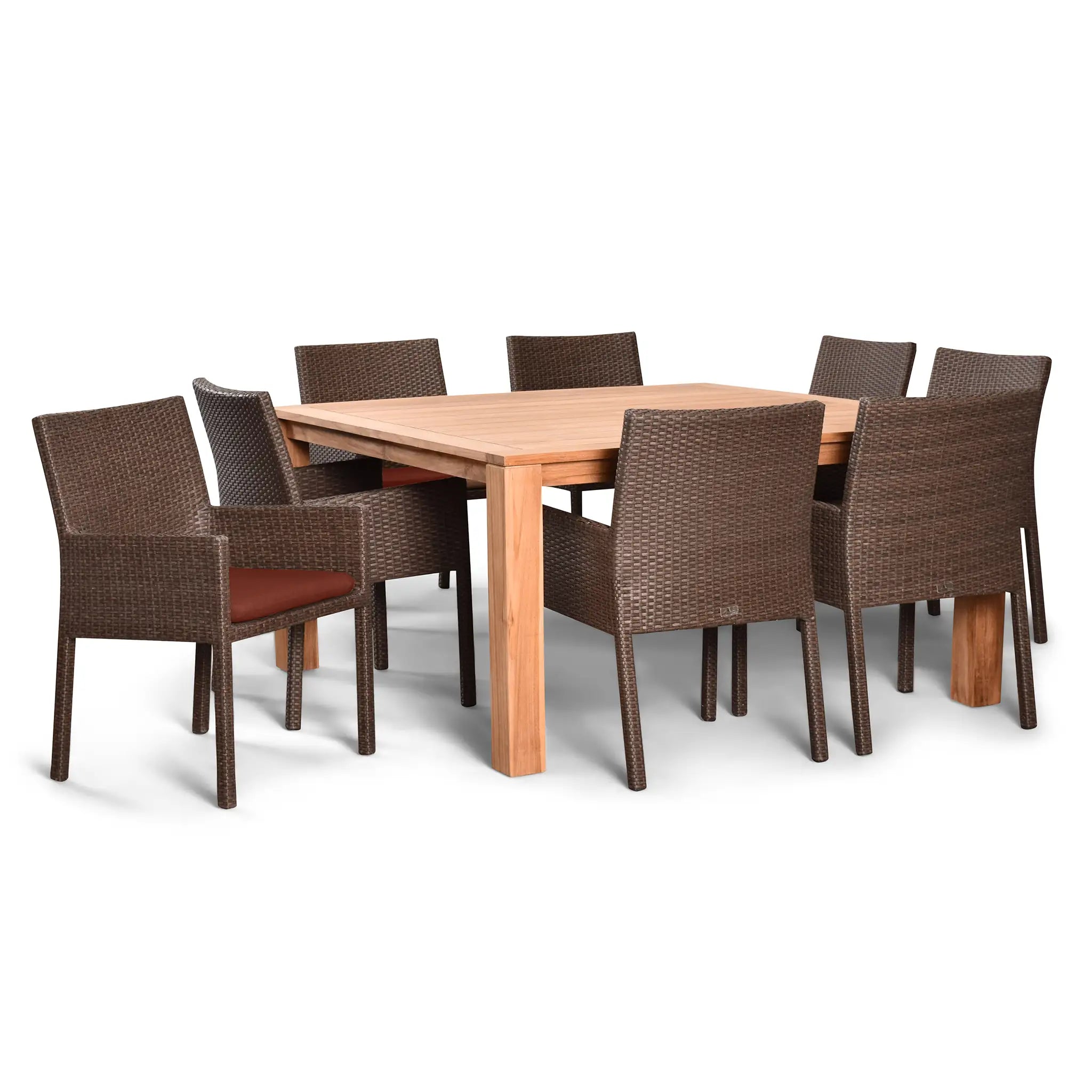 The table in this set is constructed from sustainably harvested, Grade A teak wood, known for its natural resistance to moisture, rotting, and pests. This makes it perfectly suited for outdoor environments and various climates, ensuring that it will remain a beautiful centerpiece for years to come. The combination of durable materials, fine craftsmanship, and stunning design makes the Arden Teak 9 Piece Square Dining Set a must-have addition to any outdoor space.