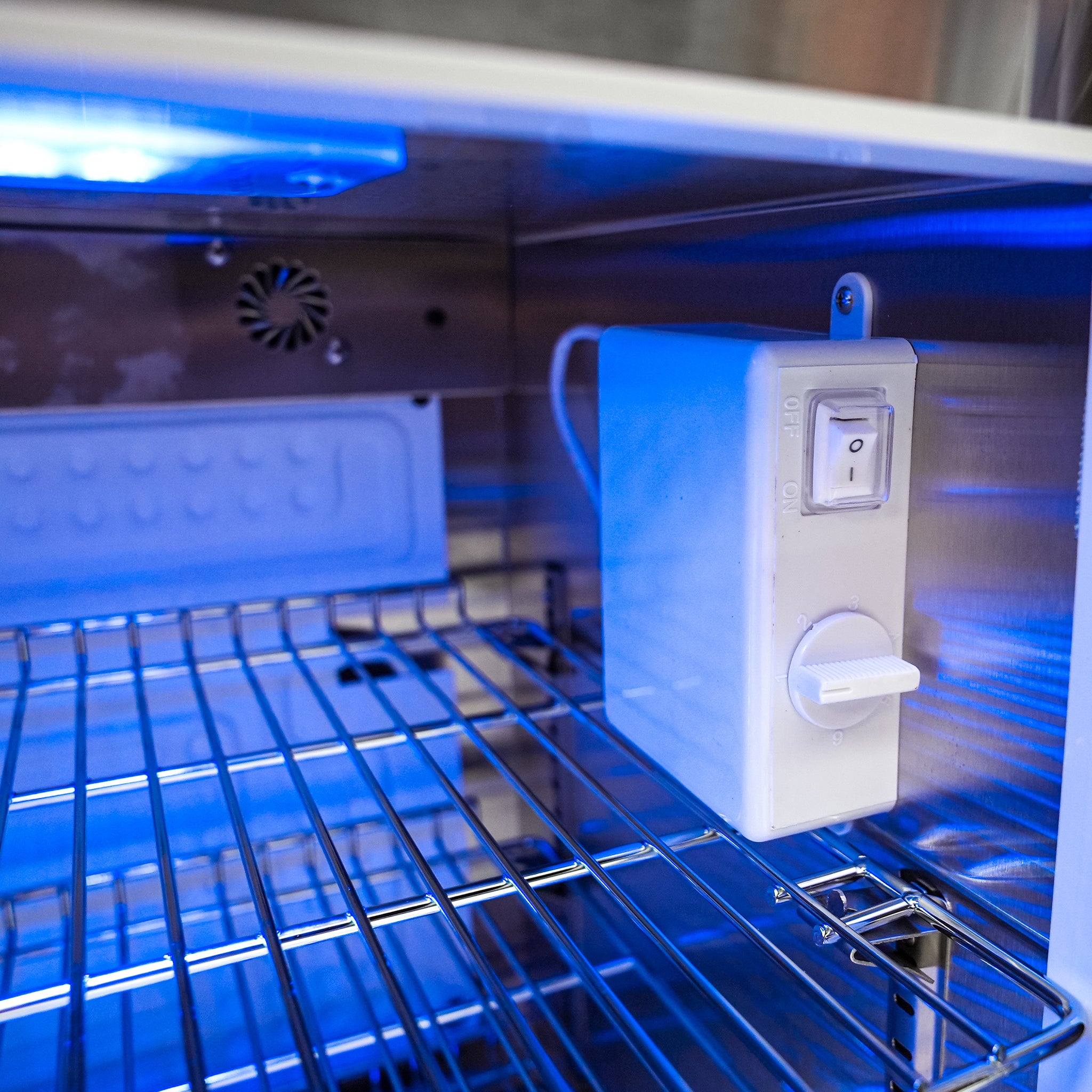 - Control knobs with on/off color changing LED lights