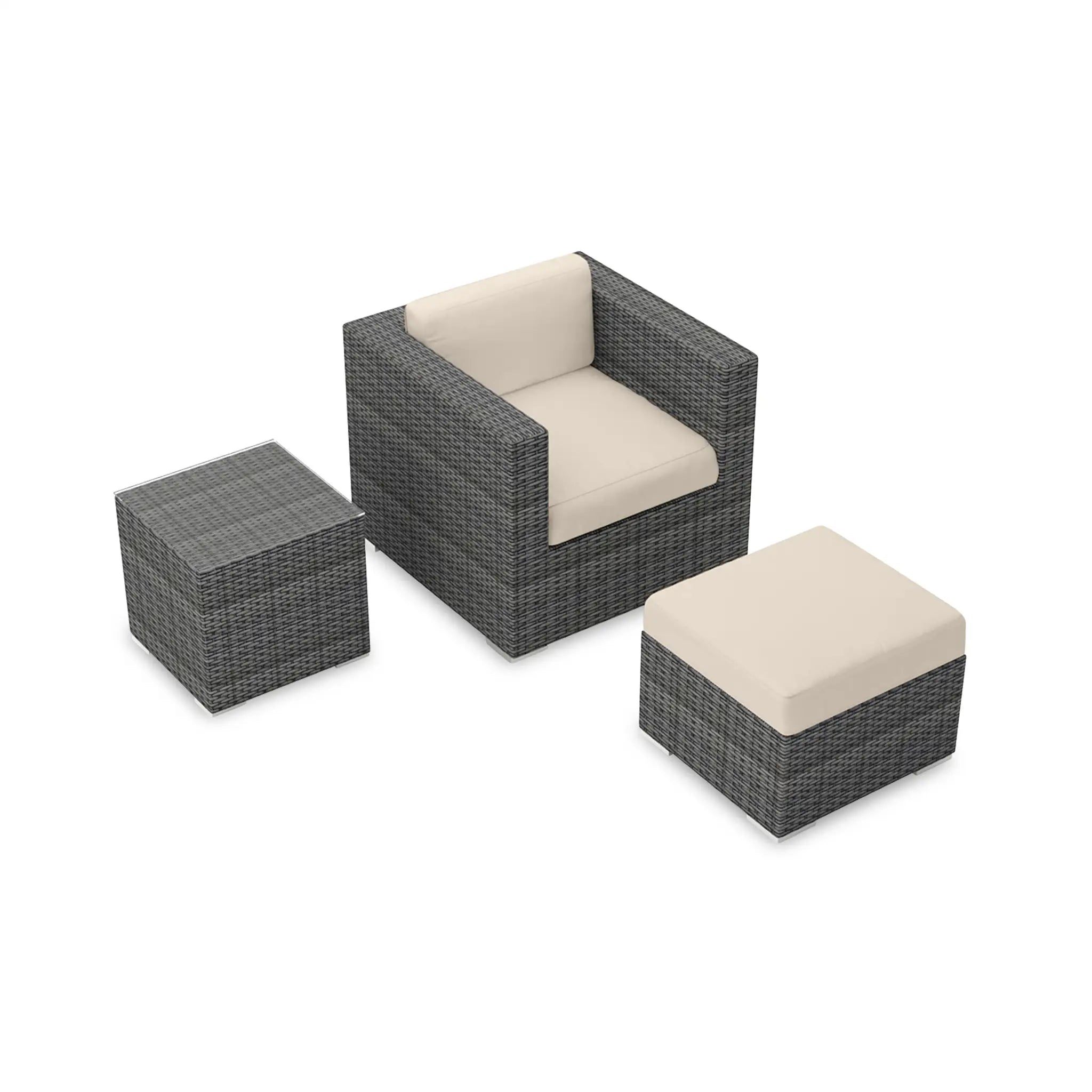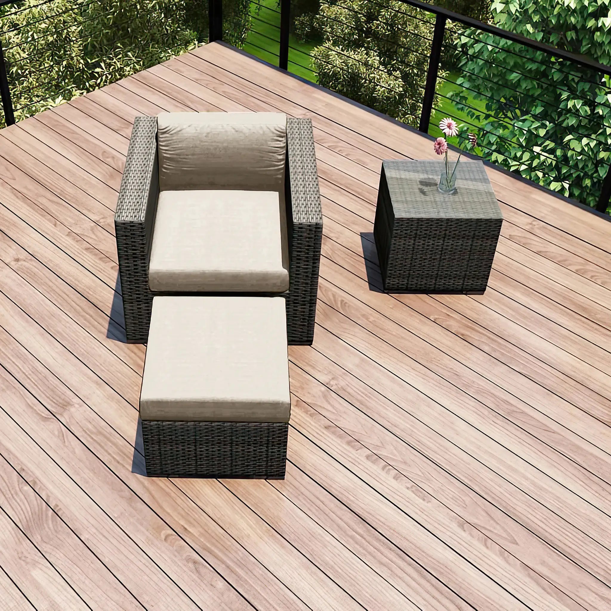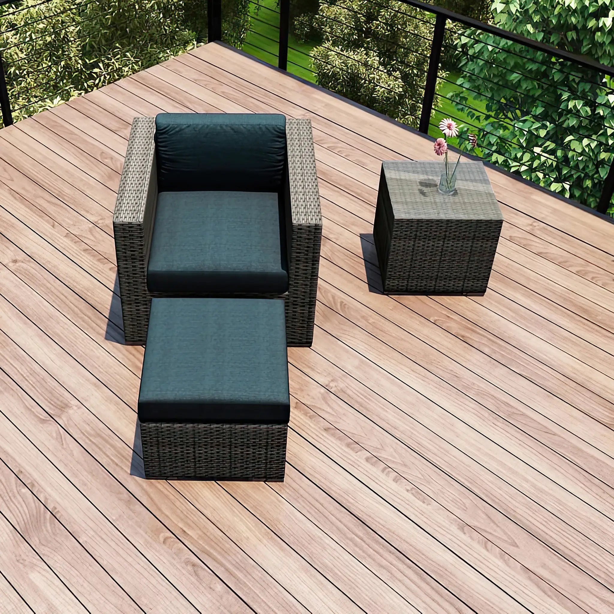 The hand-woven High-Density Polyethylene (HDPE) wicker offers both resilience and beauty. Unlike traditional wicker, HDPE is resistant to cracking, ensuring that the set retains its integrity season after season. The color is infused directly into the HDPE material, helping to prevent fading and ensuring long-lasting vibrancy. The wicker is finished in a Slate color, giving the set a sleek, sophisticated look that complements a wide range of outdoor styles, while the texture of the wicker adds a natural feel to the overall design.