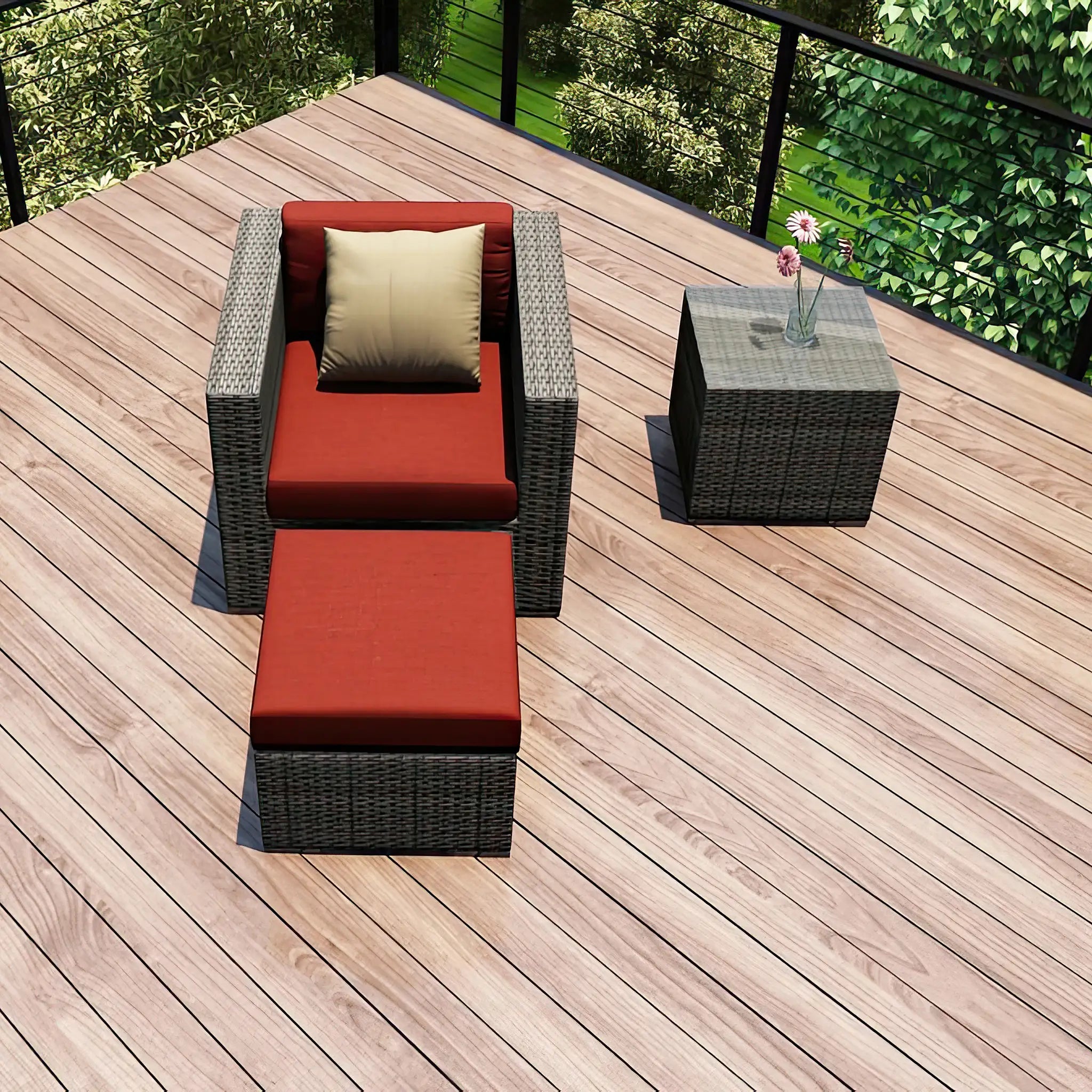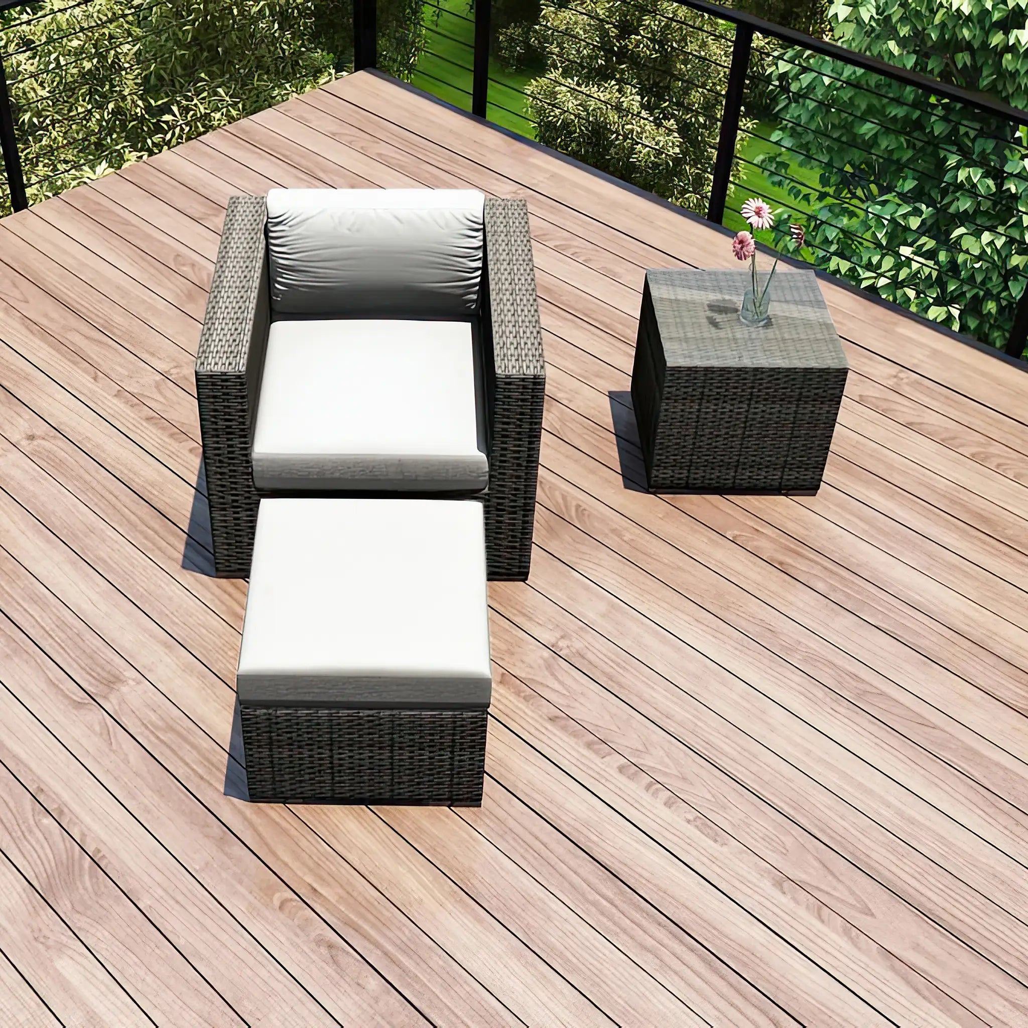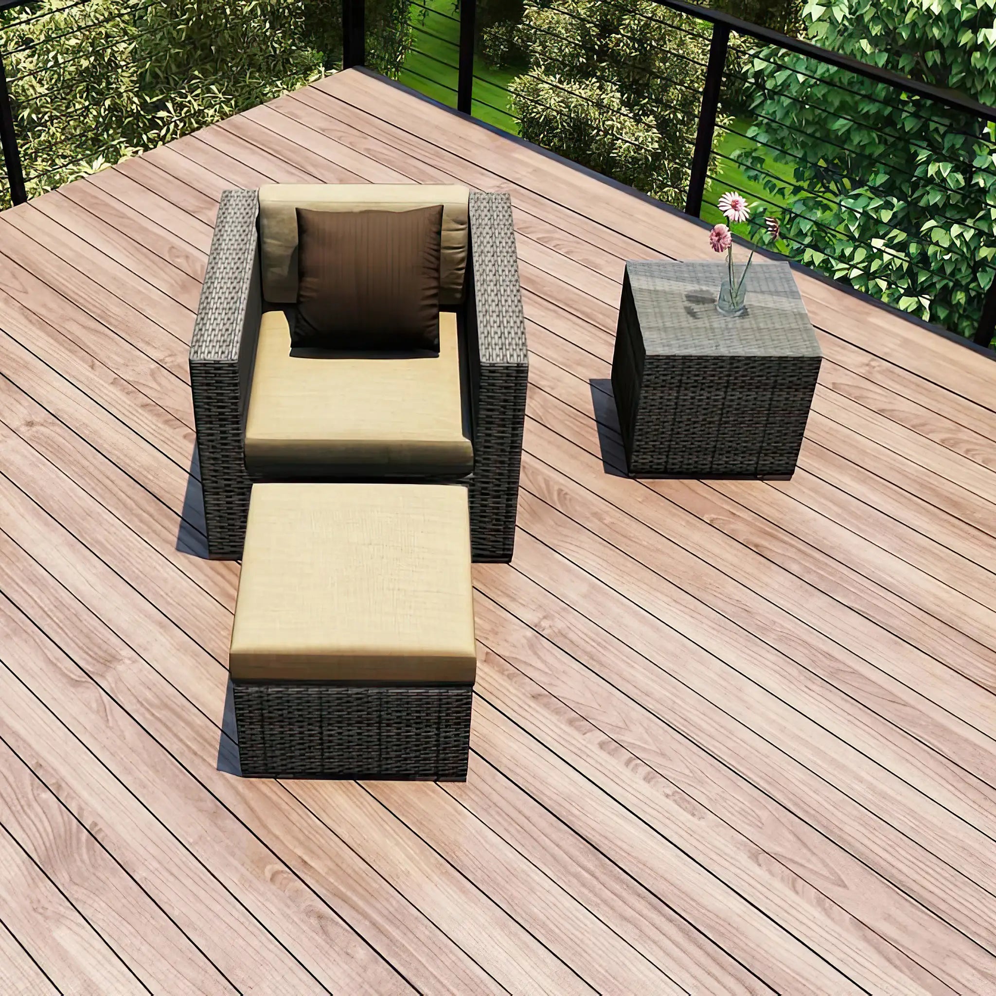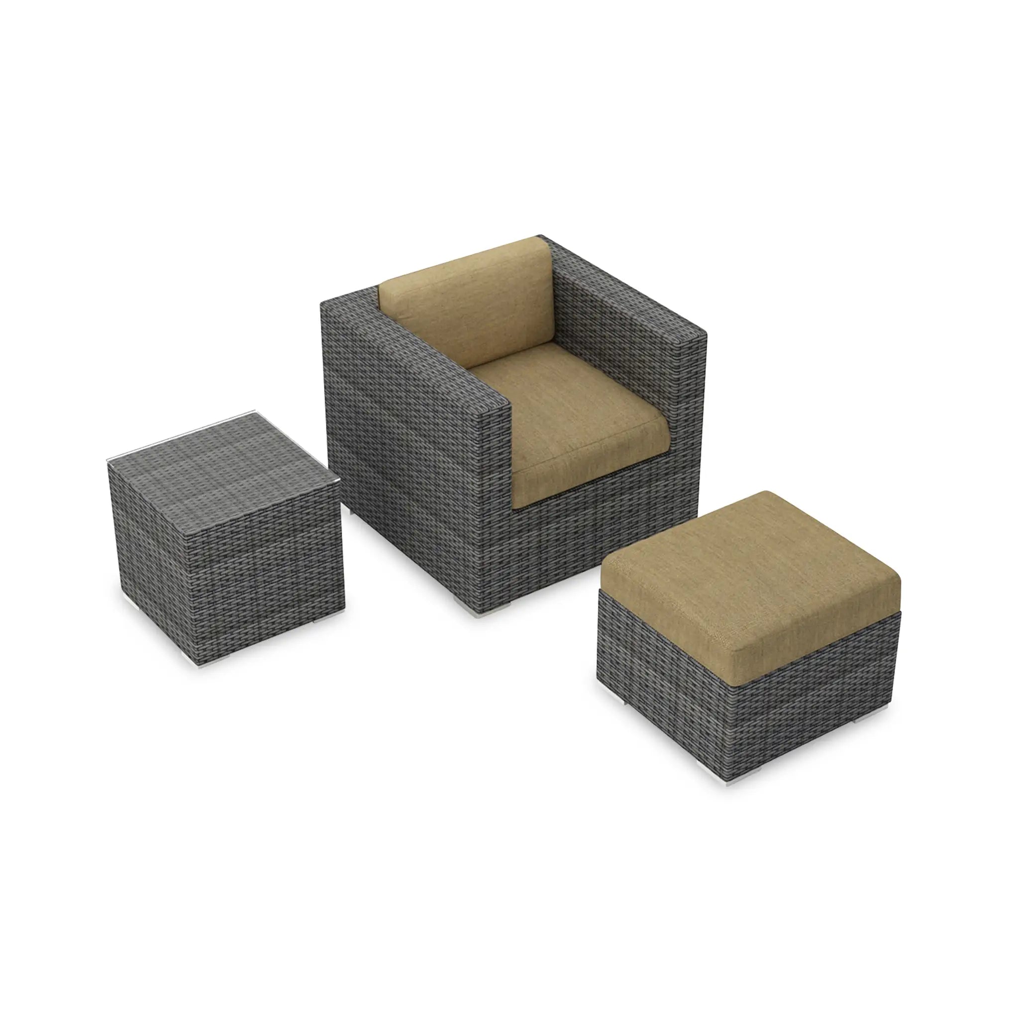 The hand-woven High-Density Polyethylene (HDPE) wicker offers both resilience and beauty. Unlike traditional wicker, HDPE is resistant to cracking, ensuring that the set retains its integrity season after season. The color is infused directly into the HDPE material, helping to prevent fading and ensuring long-lasting vibrancy. The wicker is finished in a Slate color, giving the set a sleek, sophisticated look that complements a wide range of outdoor styles, while the texture of the wicker adds a natural feel to the overall design.