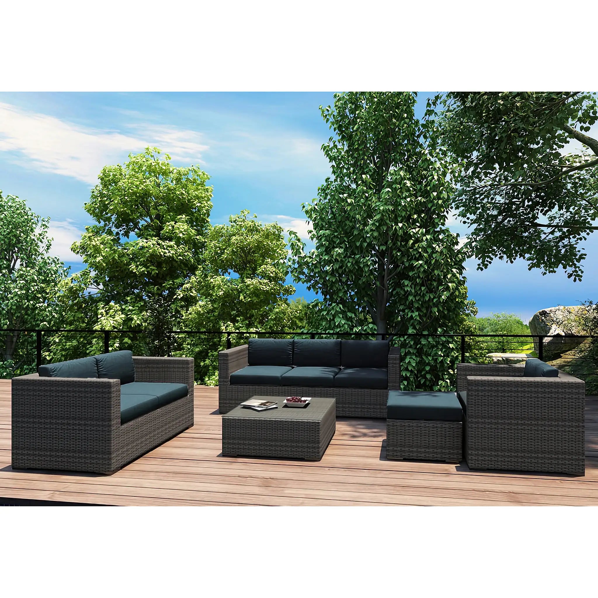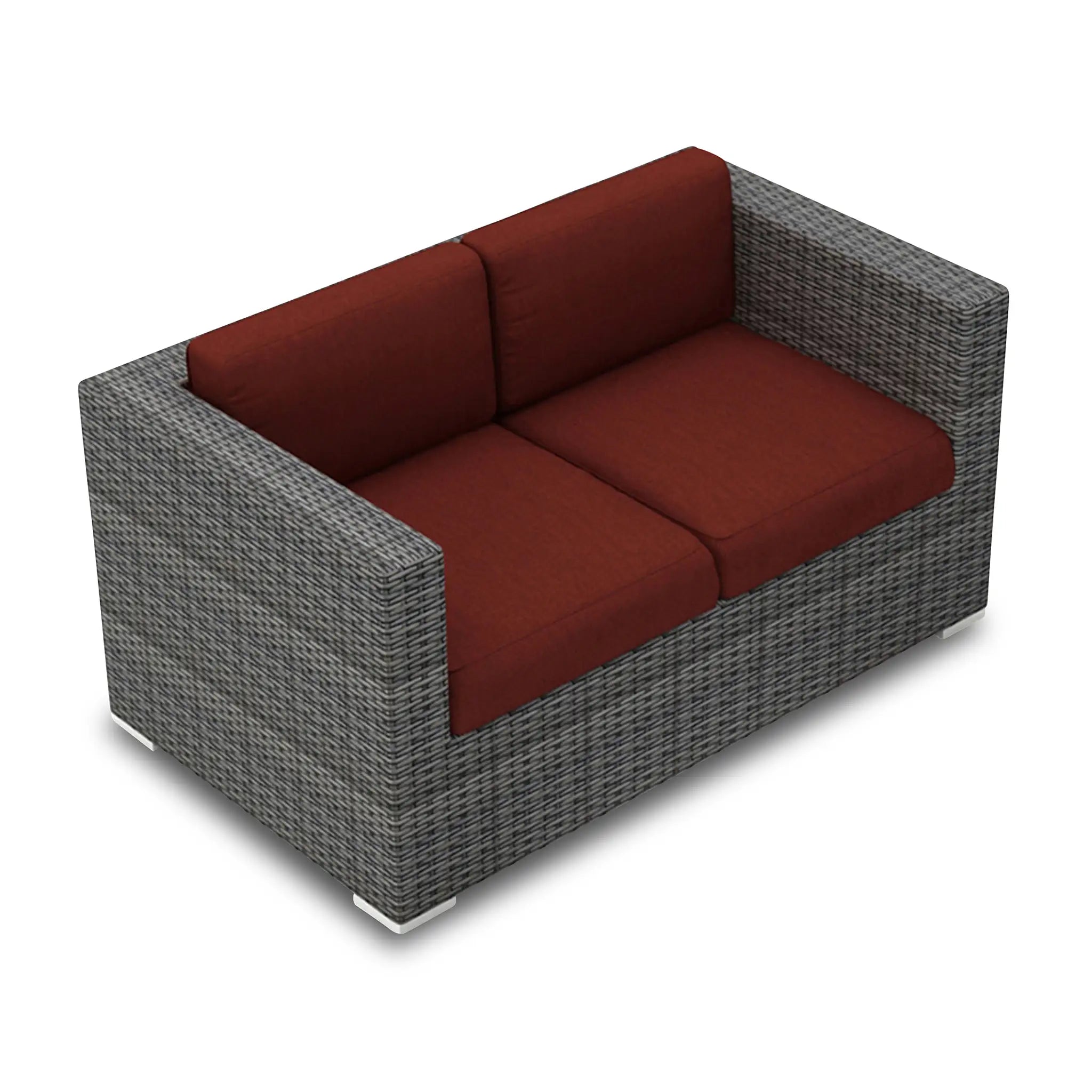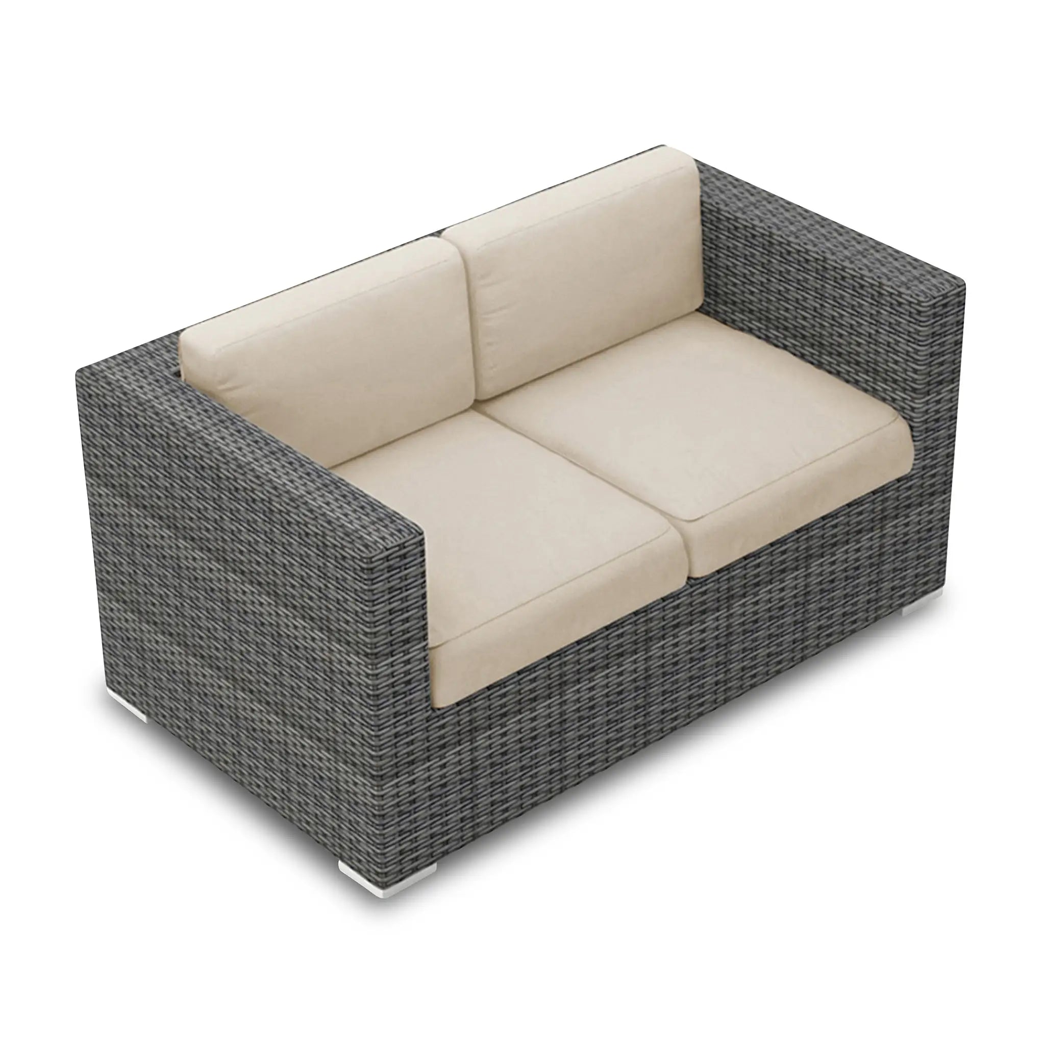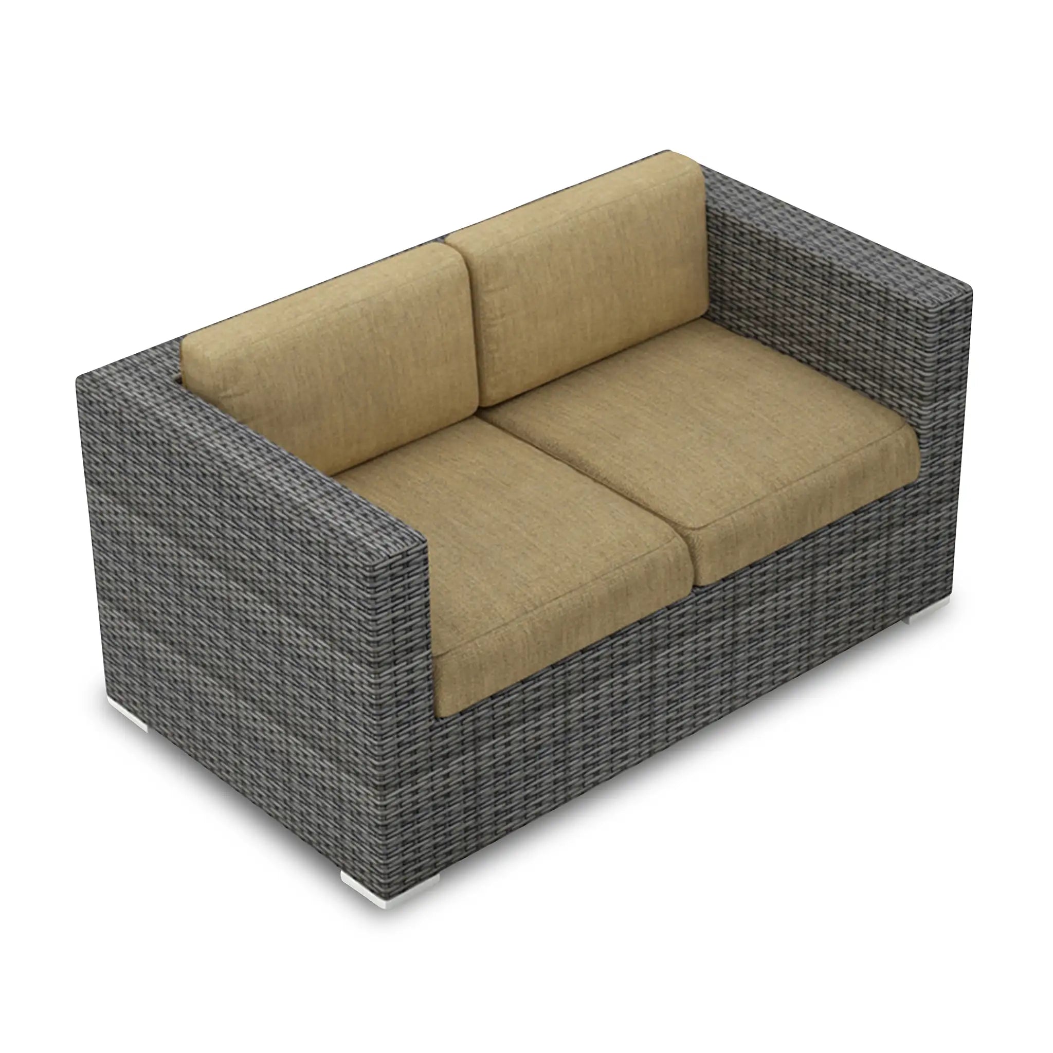 Constructed with fully-welded aluminum frames, the sofa set is treated with a powder-coated finish to ensure long-lasting performance through all seasons. The powder-coating protects the frame from wear and tear, while the hand-woven High-Density Polyethylene (HDPE) wicker offers resistance to cracking and weather damage. The HDPE wicker is infused with color to prevent fading, maintaining its beautiful, natural look. The set is finished in a beautifully textured Slate color, providing a sophisticated appearance that mimics the natural look of traditional wicker.
