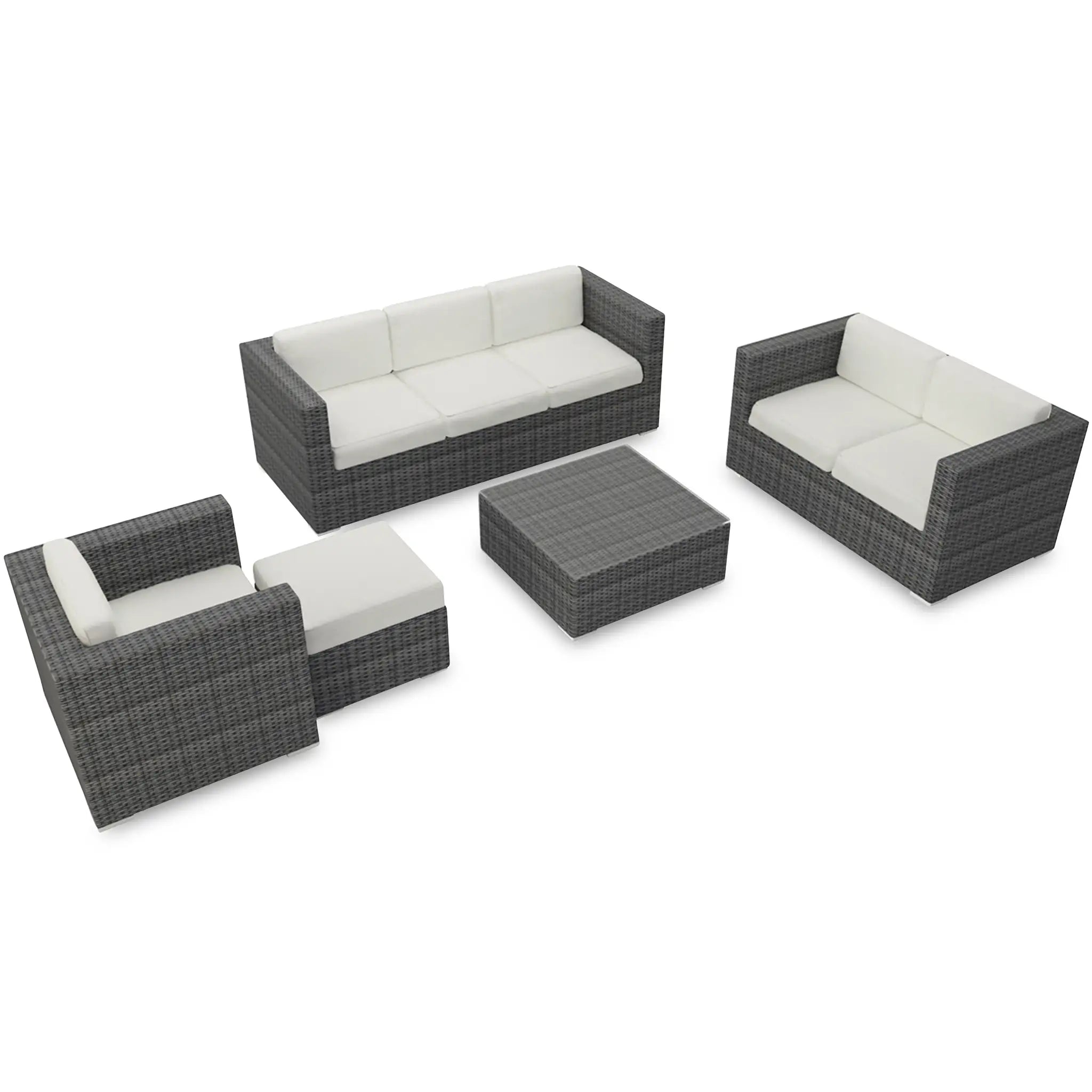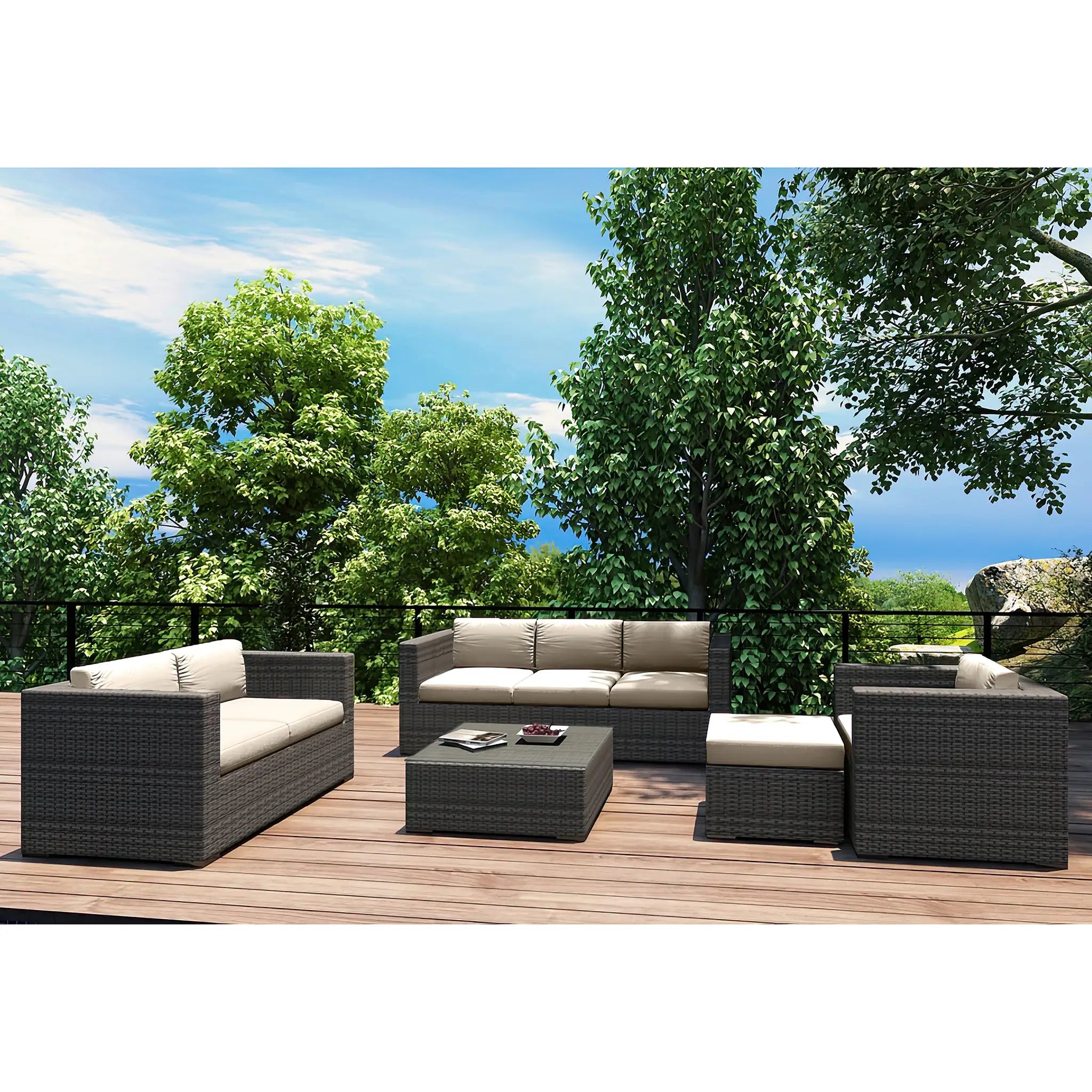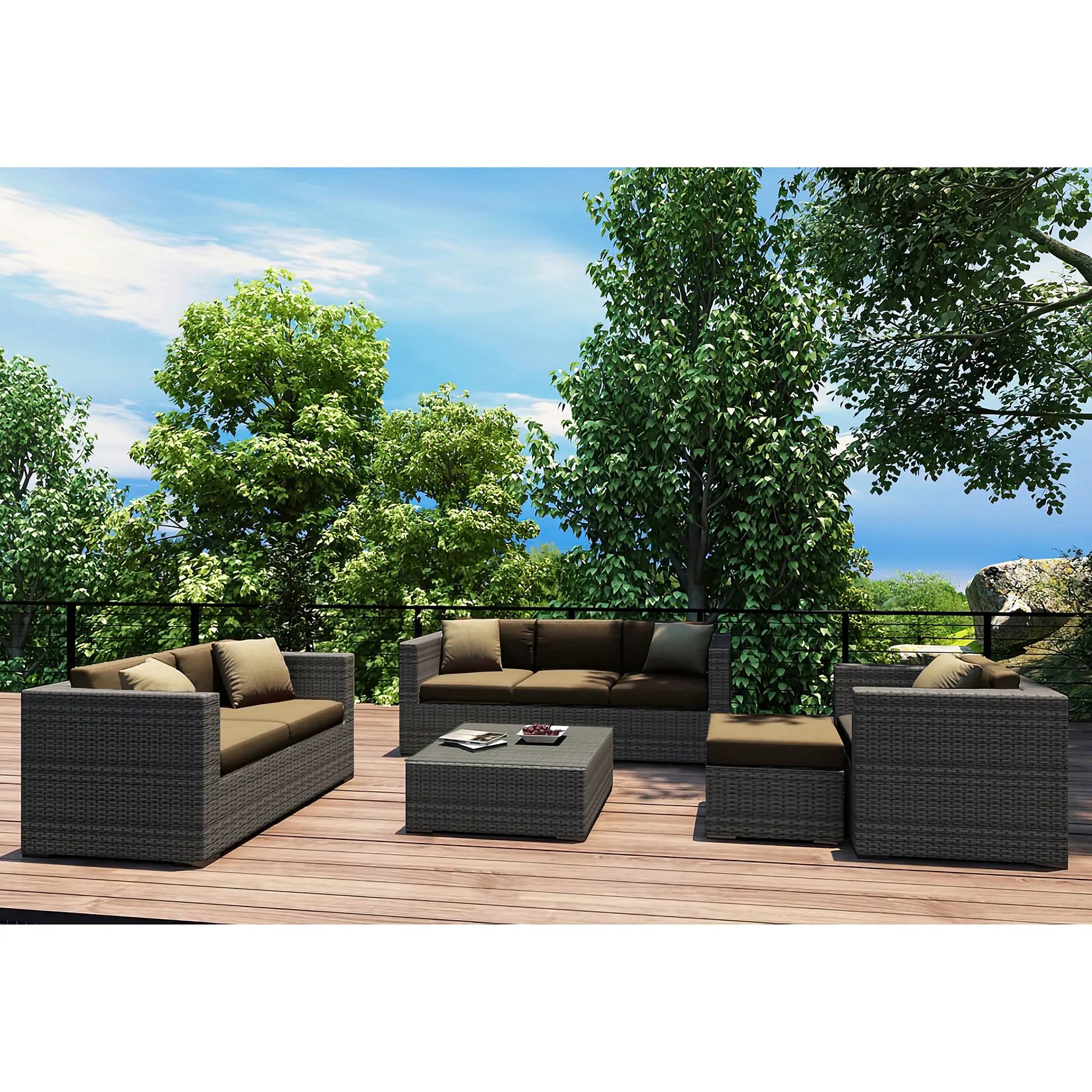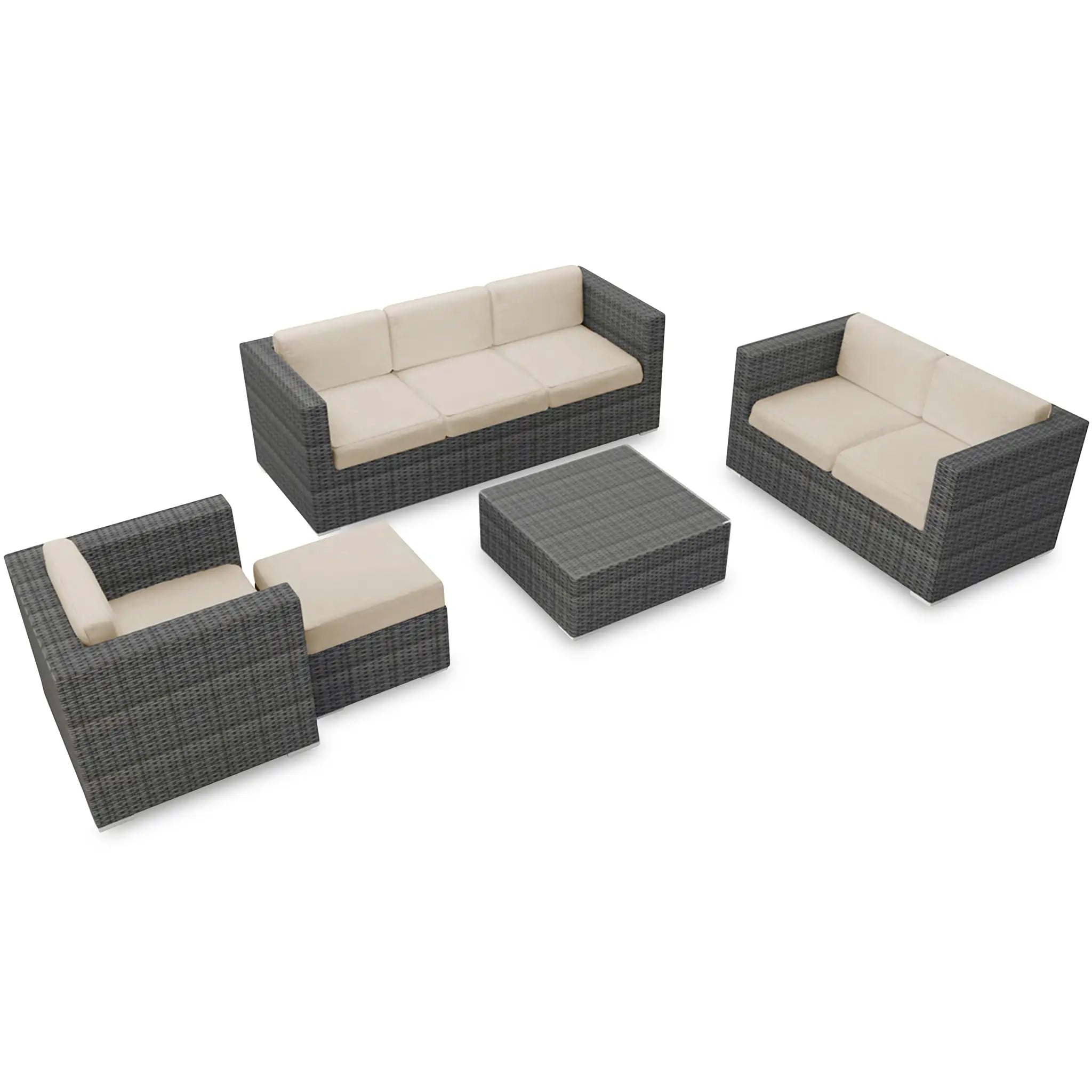 Constructed with fully-welded aluminum frames, the sofa set is treated with a powder-coated finish to ensure long-lasting performance through all seasons. The powder-coating protects the frame from wear and tear, while the hand-woven High-Density Polyethylene (HDPE) wicker offers resistance to cracking and weather damage. The HDPE wicker is infused with color to prevent fading, maintaining its beautiful, natural look. The set is finished in a beautifully textured Slate color, providing a sophisticated appearance that mimics the natural look of traditional wicker.