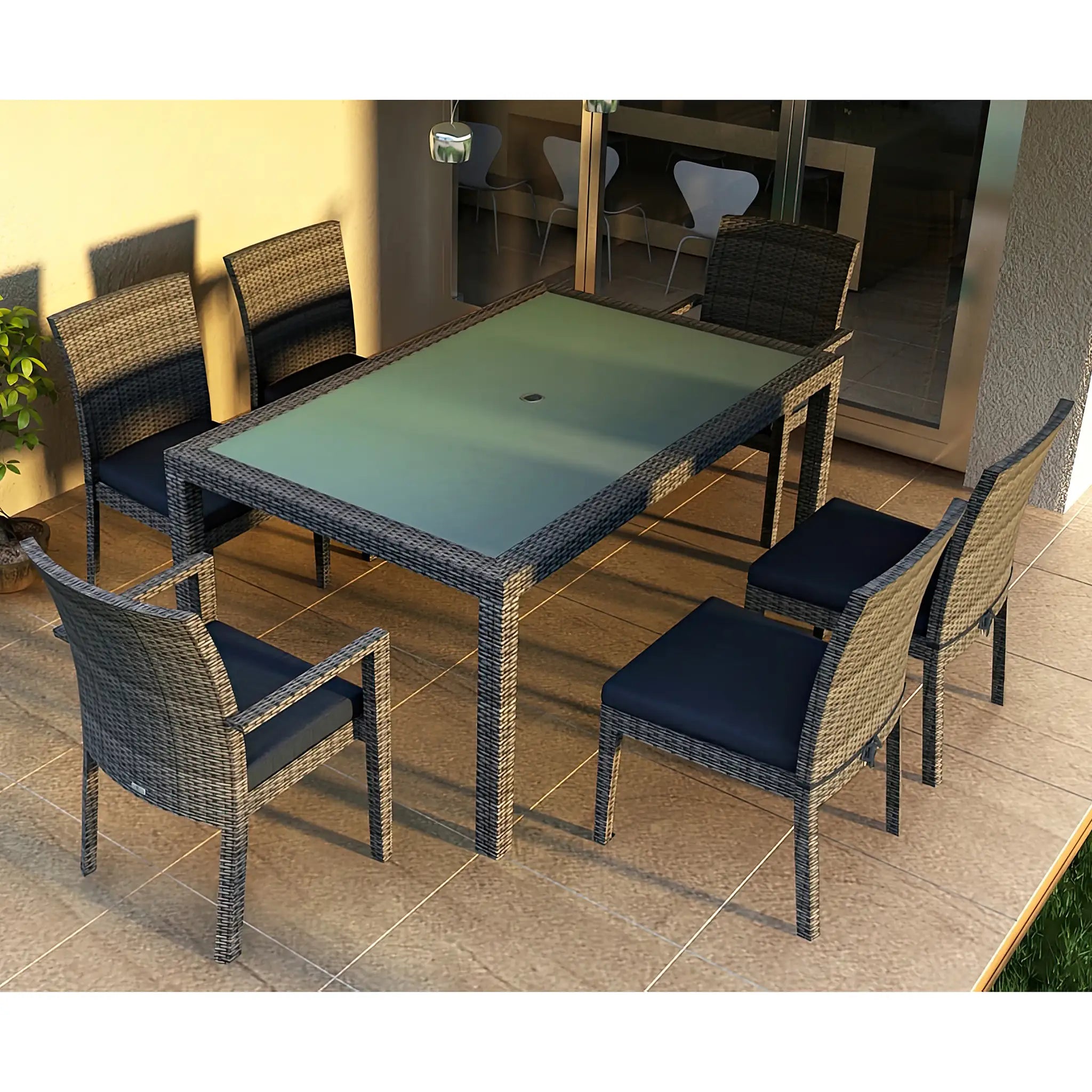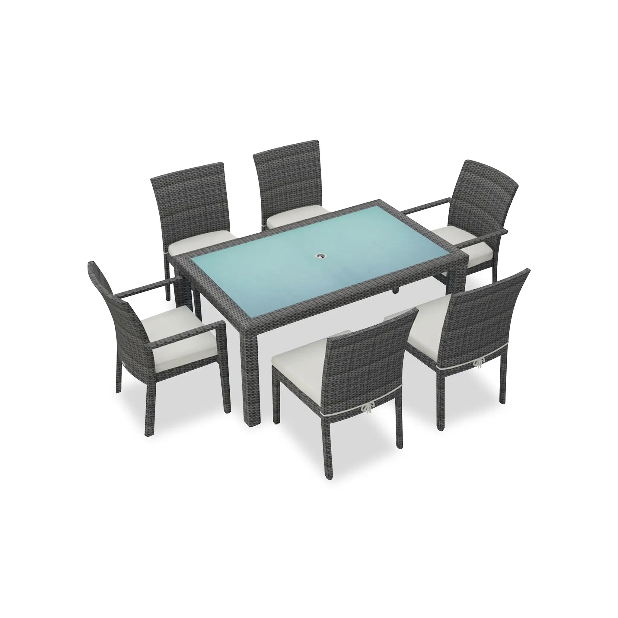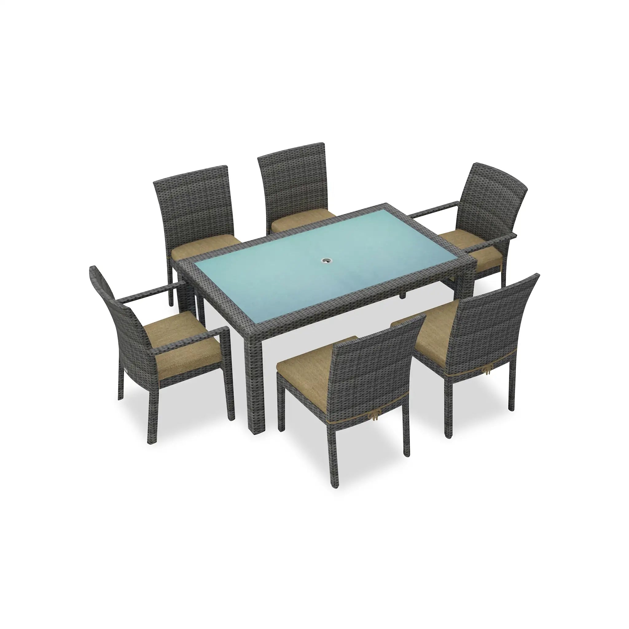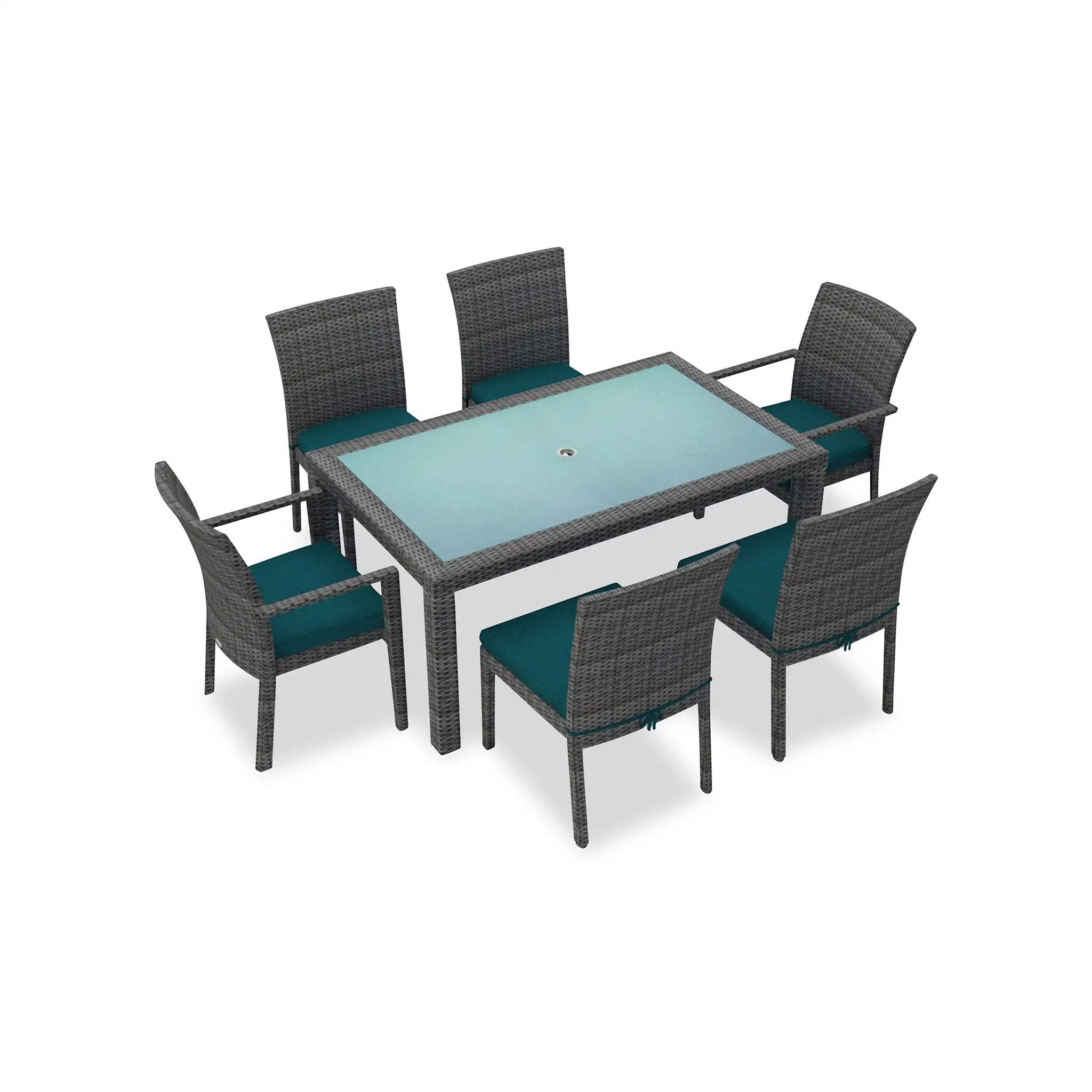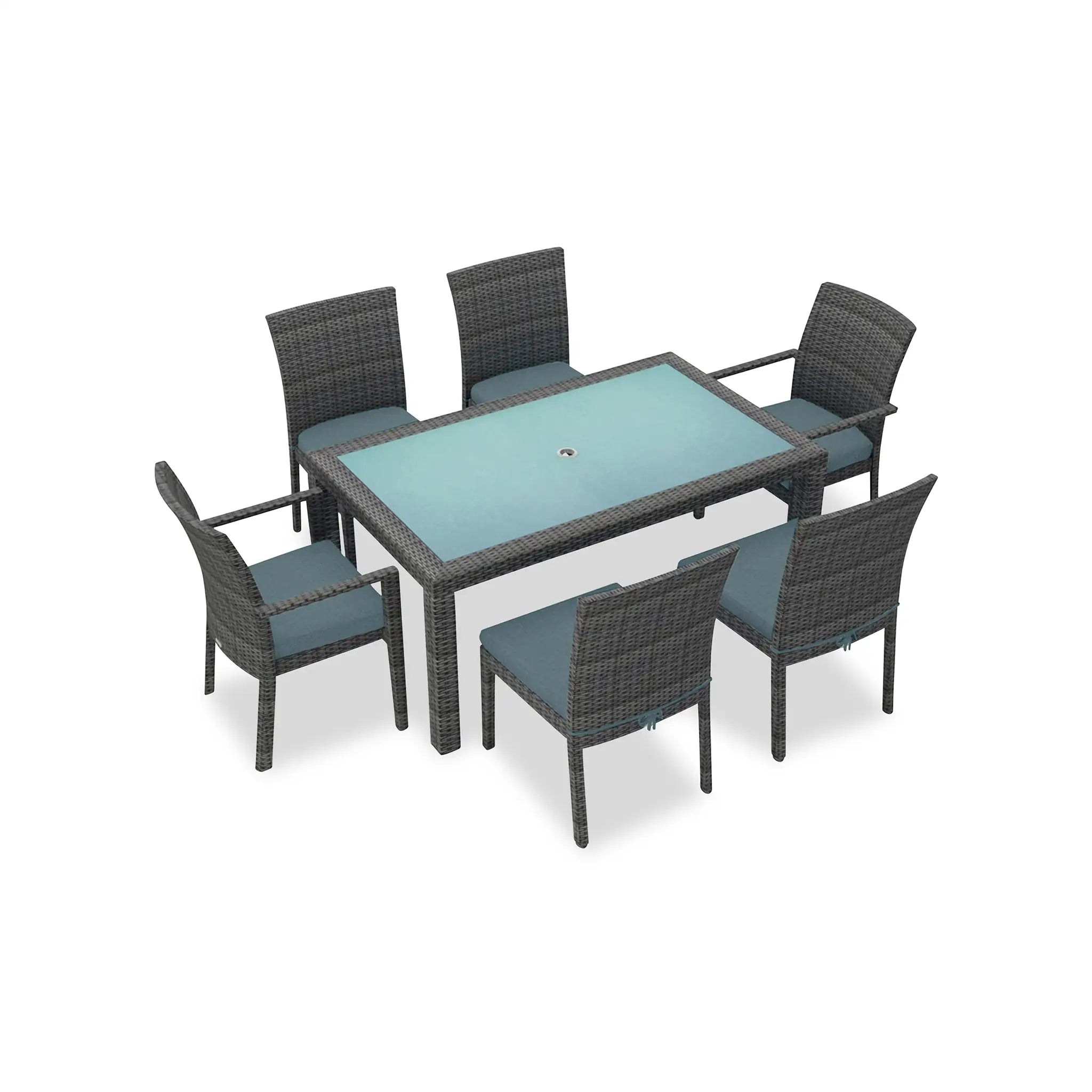 The Harmonia Living District 7 Piece Aluminum Dining Set combines modern design with durable craftsmanship, making it the perfect addition to your outdoor dining space. Featuring fully-welded aluminum frames treated with a powder-coated finish, this set offers long-lasting performance throughout the seasons. The hand-woven High-Density Polyethylene (HDPE) wicker is resistant to cracking and is infused with color to prevent fading, finished in a beautifully textured Slate color for a sophisticated, natural look.