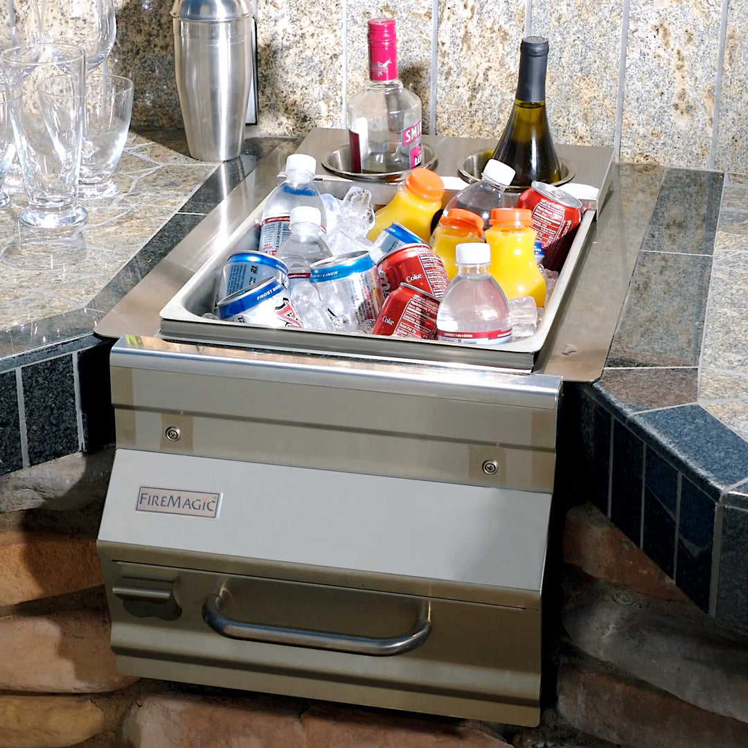 Fire Magic Bar Caddy installed into an outdoor kitchen space filled with soda, water, and alchoholic drinks.