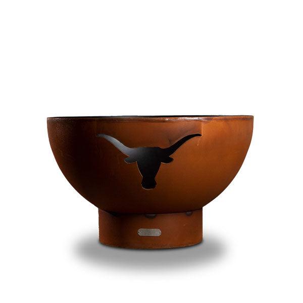 Available in gas or wood-burning options, you can configure this piece to meet the needs of your outdoor entertaining space. This elegant fire pit is handcrafted in the USA by expert metalworkers, is made of sturdy carbon steel and is finished in iron oxide patina that ages over time to create a rustically beautiful fire feature. You will notice your fire pit changing color as part of the natural aging process from a burnt orange color to a deep, rich mahogany. Like a farmer's prized cattle, each Longhorn is "branded" with a unique number, written on a brass plate and fastened to the side of this stunning piece. This fire pit is exceptionally durable, crafted from 1/4" thick mild carbon steel, and requires no maintenance. Even in harsh, cold environments, this fire pit can be left to out to pasture year-round without worry. The interiors of the bowl are hand rolled with a dense high temperature-resistant coating and have a 1.5" diameter rain drain in the bottom to prevent harmful standing water.