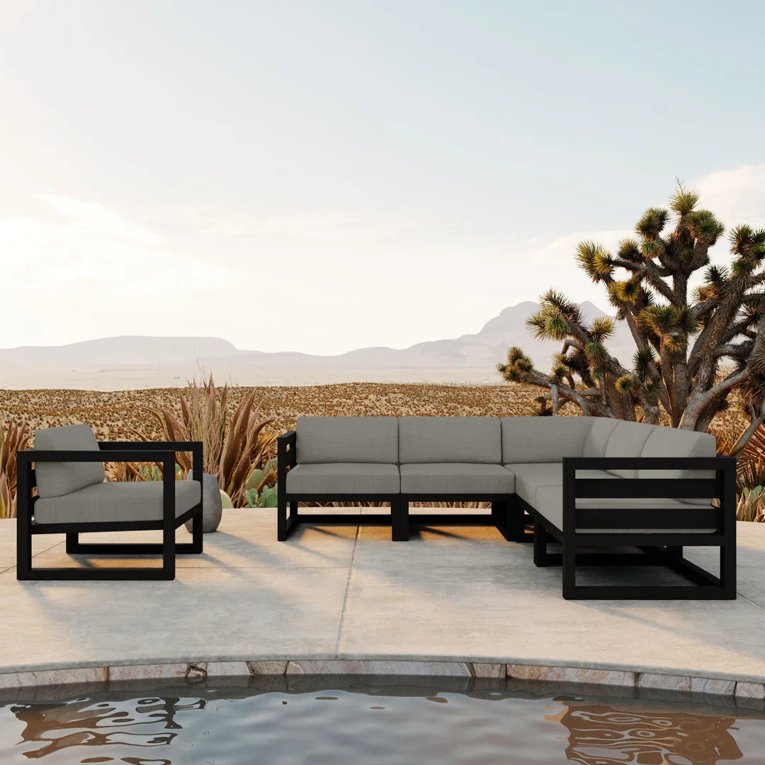 An inspired blend of Midcentury Modernism and contemporary design, the Harmonia Living Avion 6 Piece Aluminum Sectional Set adds an artful touch to your outdoor space. With its sleek silhouette and extra-spacious deep seating, this collection provides the perfect balance of style and comfort, offering an inviting setting for relaxation. Whether you're enjoying a quiet moment or hosting friends and family, the Avion set delivers a modern, sophisticated atmosphere for any occasion.
