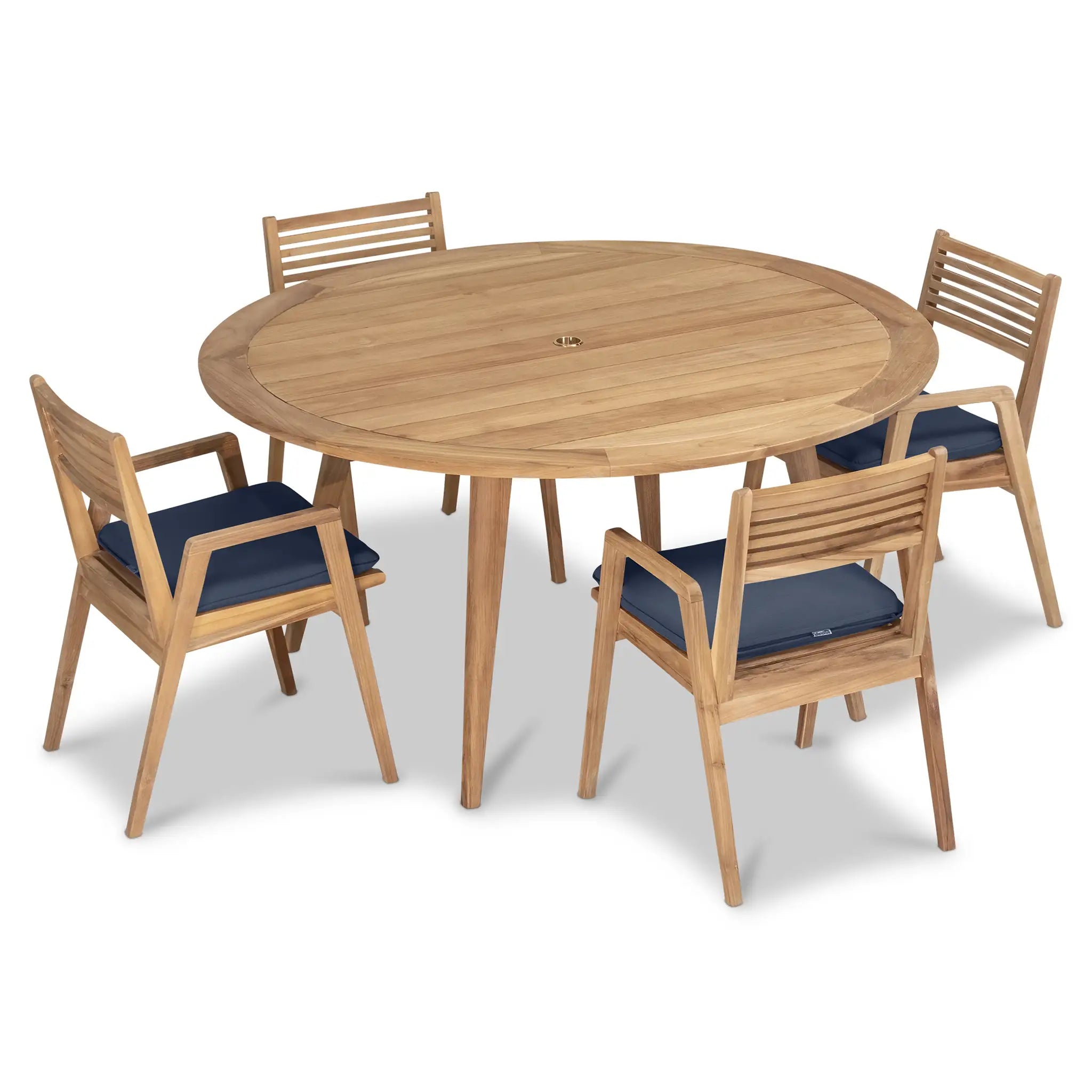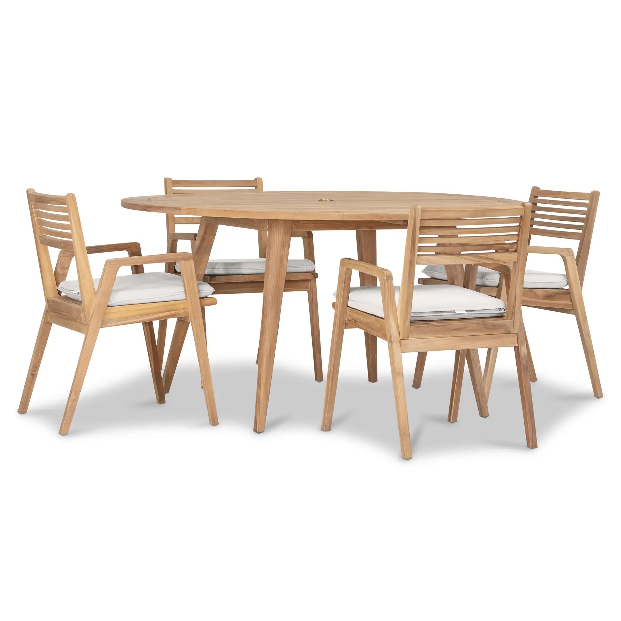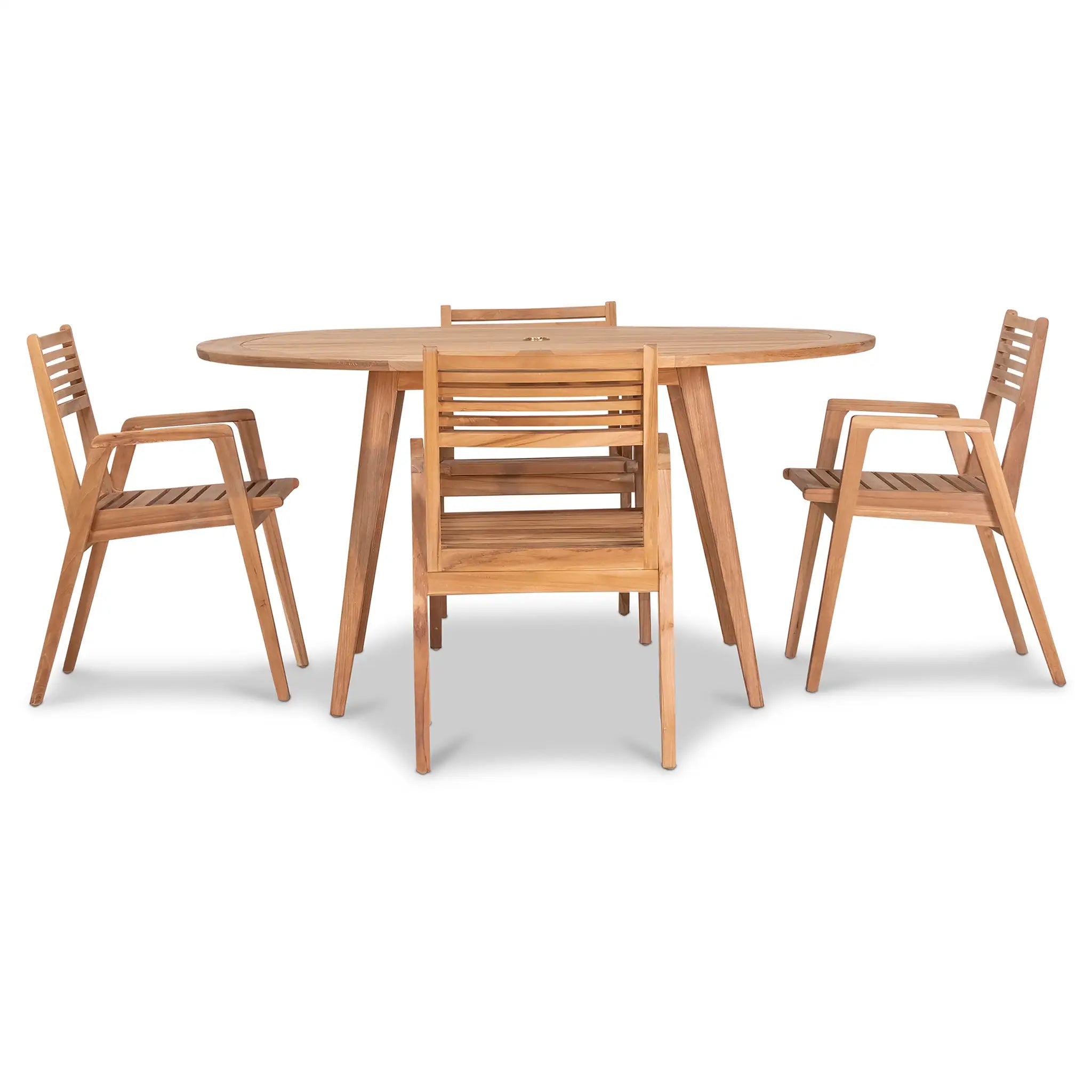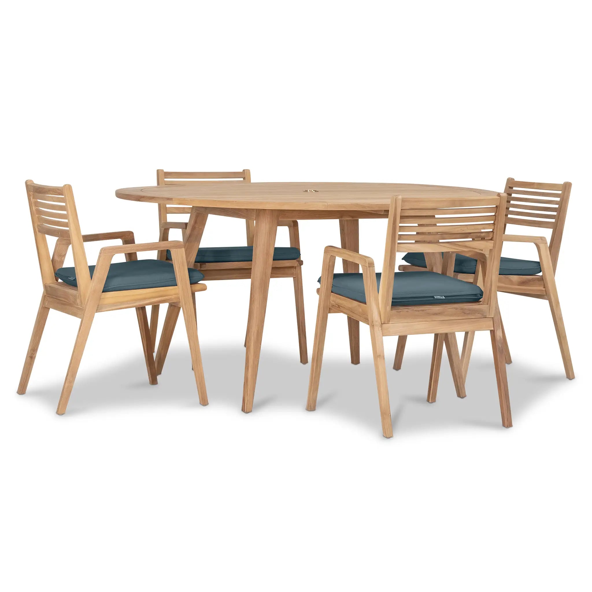 At the heart of this dining set is the Tango Round Dining Table, a beautifully crafted centerpiece with a Mid-Century Modern design that remains both classic and timeless. Constructed from Grade A teak wood, the table is naturally resistant to moisture, rotting, and pests, making it exceptionally well-suited for a variety of climates. The teak's rich natural grain and warm tone bring an organic, inviting feel to the space, while its sturdy construction ensures lasting strength and stability. Designed for both casual meals and elegant gatherings, the round shape fosters intimate conversation and a welcoming atmosphere, making it an excellent choice for small patios, balconies, or dining nooks.