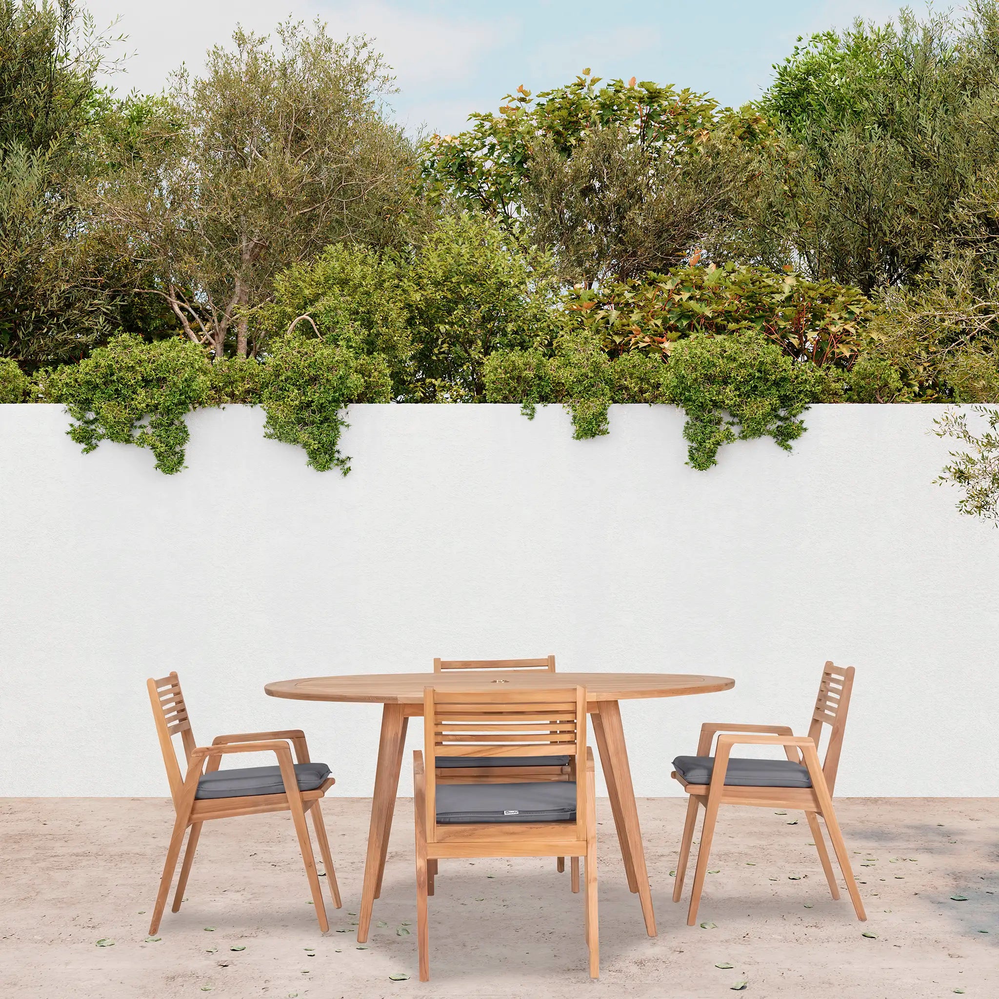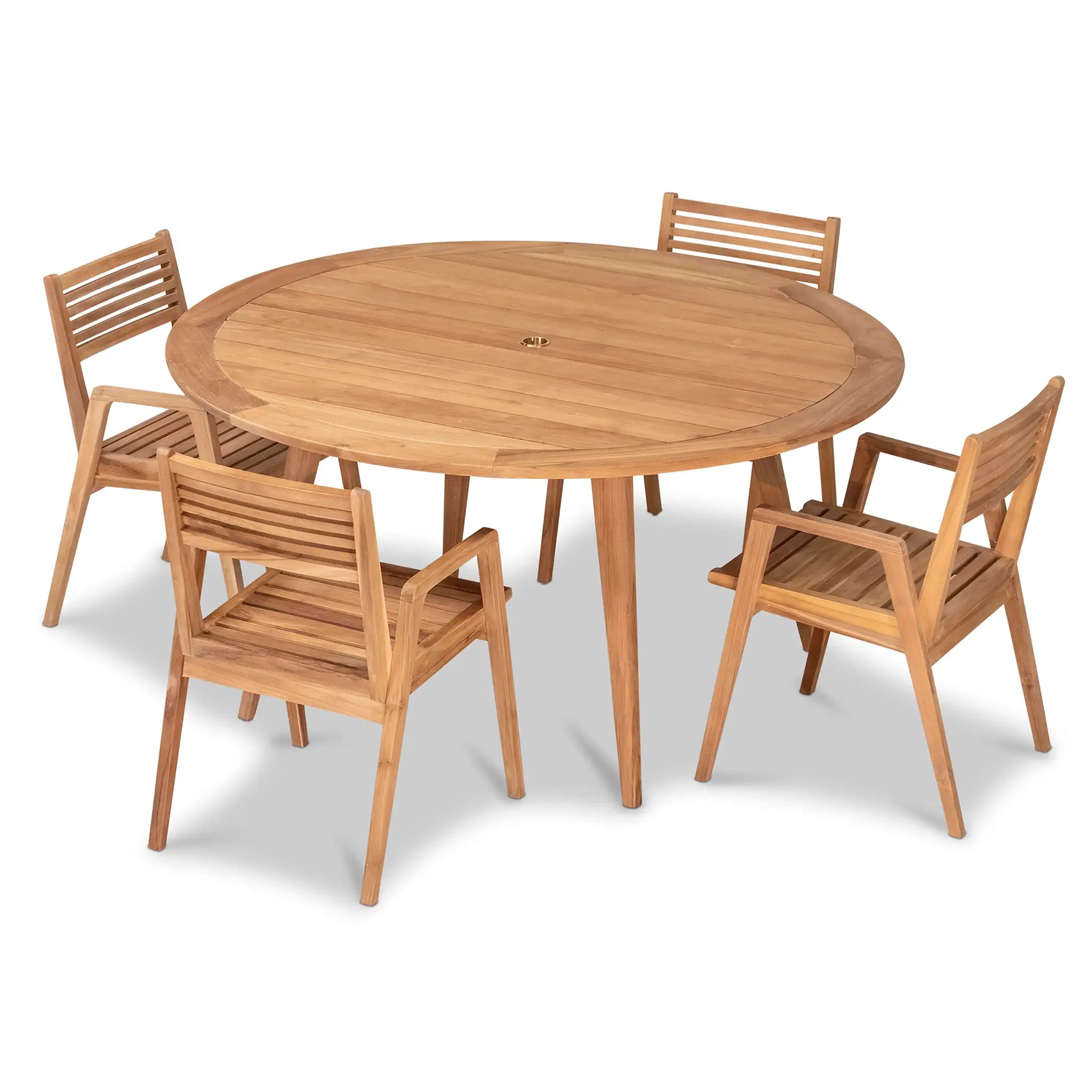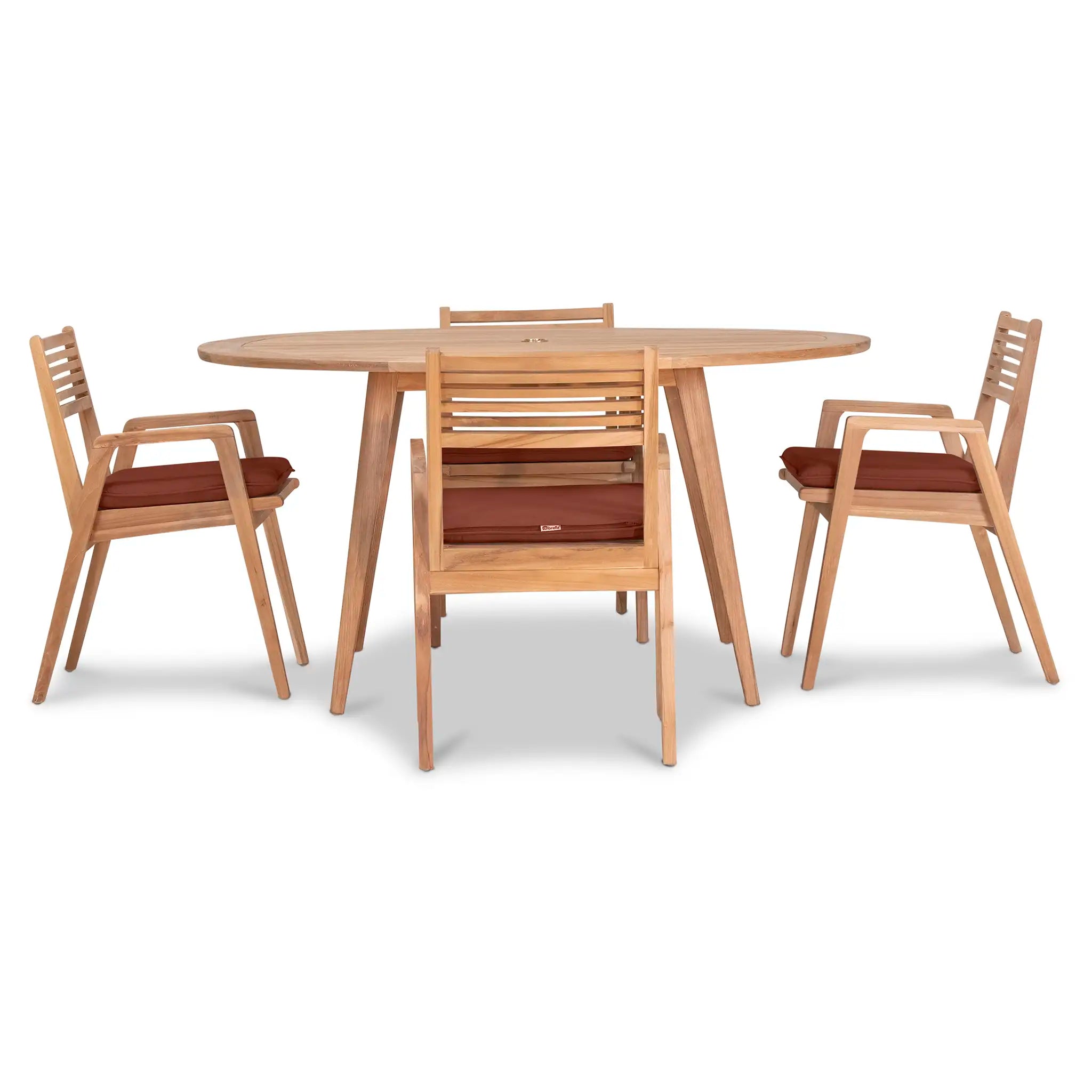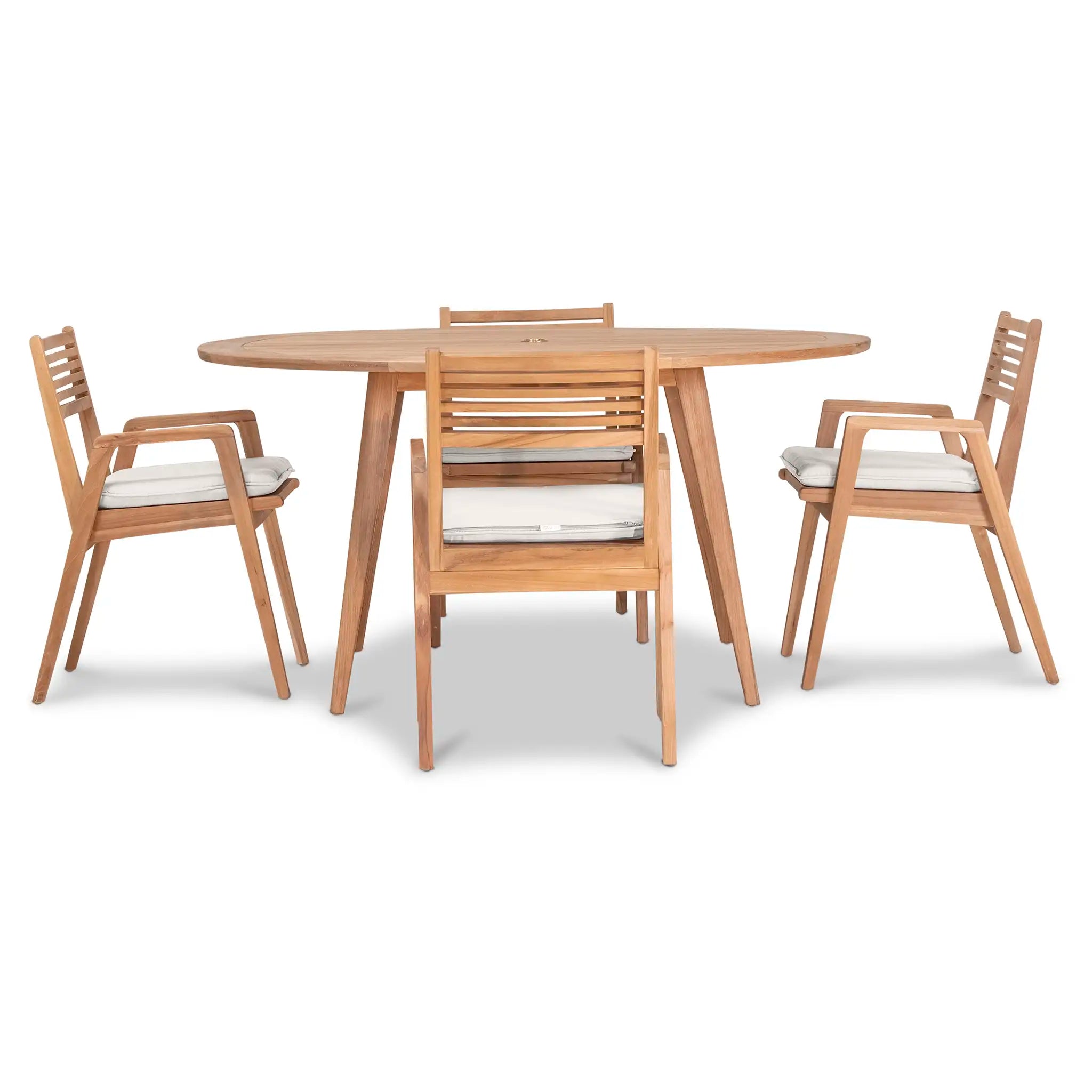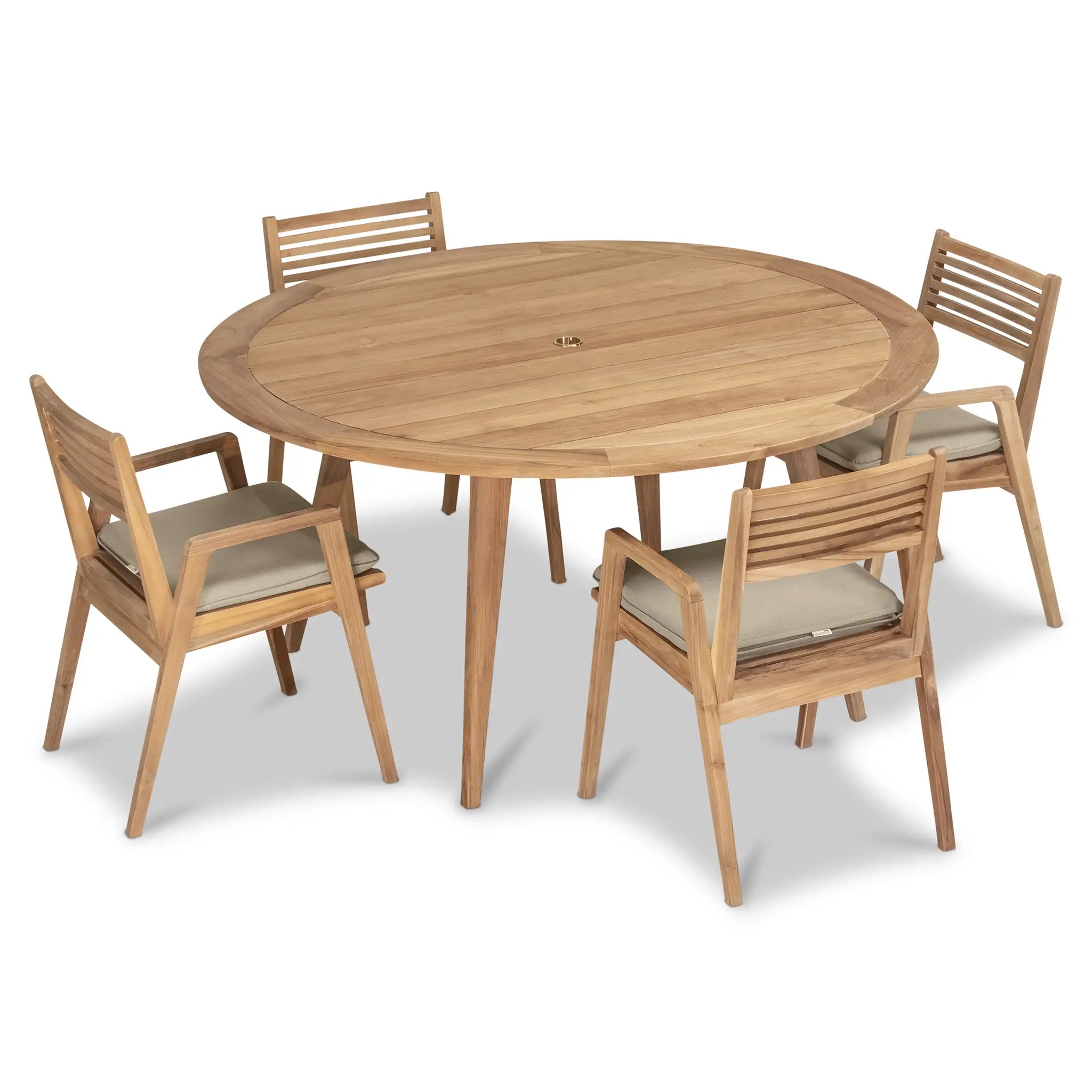 At the heart of this dining set is the Tango Round Dining Table, a beautifully crafted centerpiece with a Mid-Century Modern design that remains both classic and timeless. Constructed from Grade A teak wood, the table is naturally resistant to moisture, rotting, and pests, making it exceptionally well-suited for a variety of climates. The teak's rich natural grain and warm tone bring an organic, inviting feel to the space, while its sturdy construction ensures lasting strength and stability. Designed for both casual meals and elegant gatherings, the round shape fosters intimate conversation and a welcoming atmosphere, making it an excellent choice for small patios, balconies, or dining nooks.