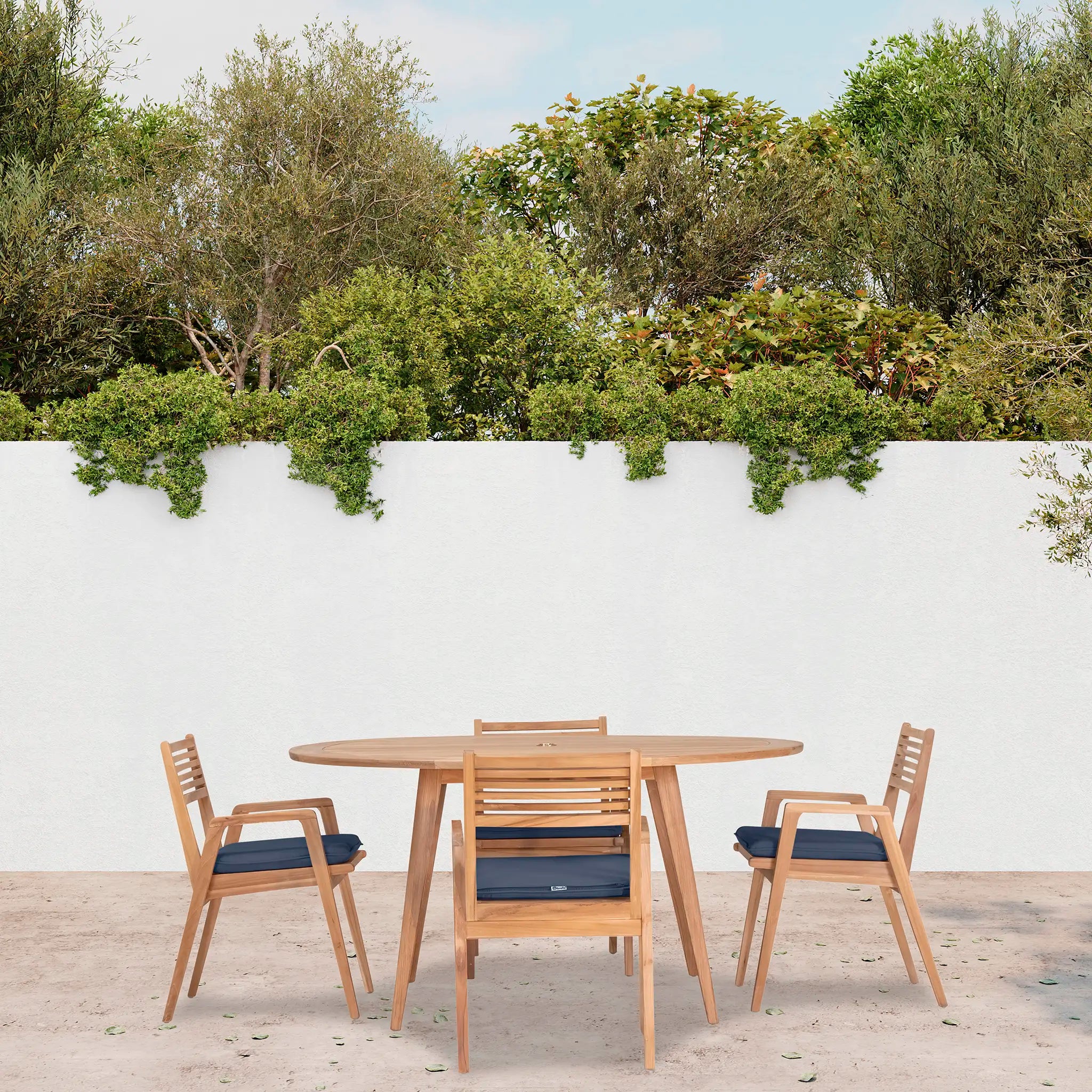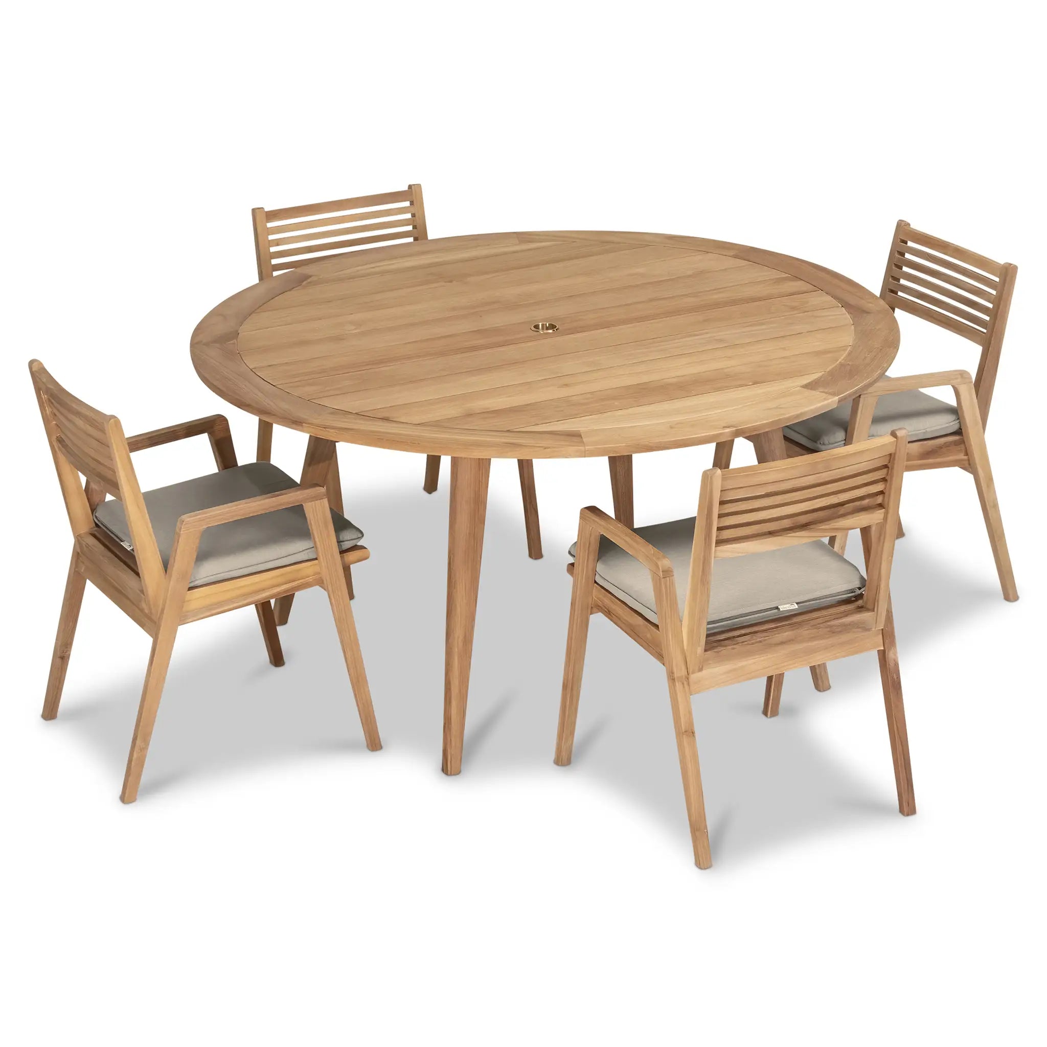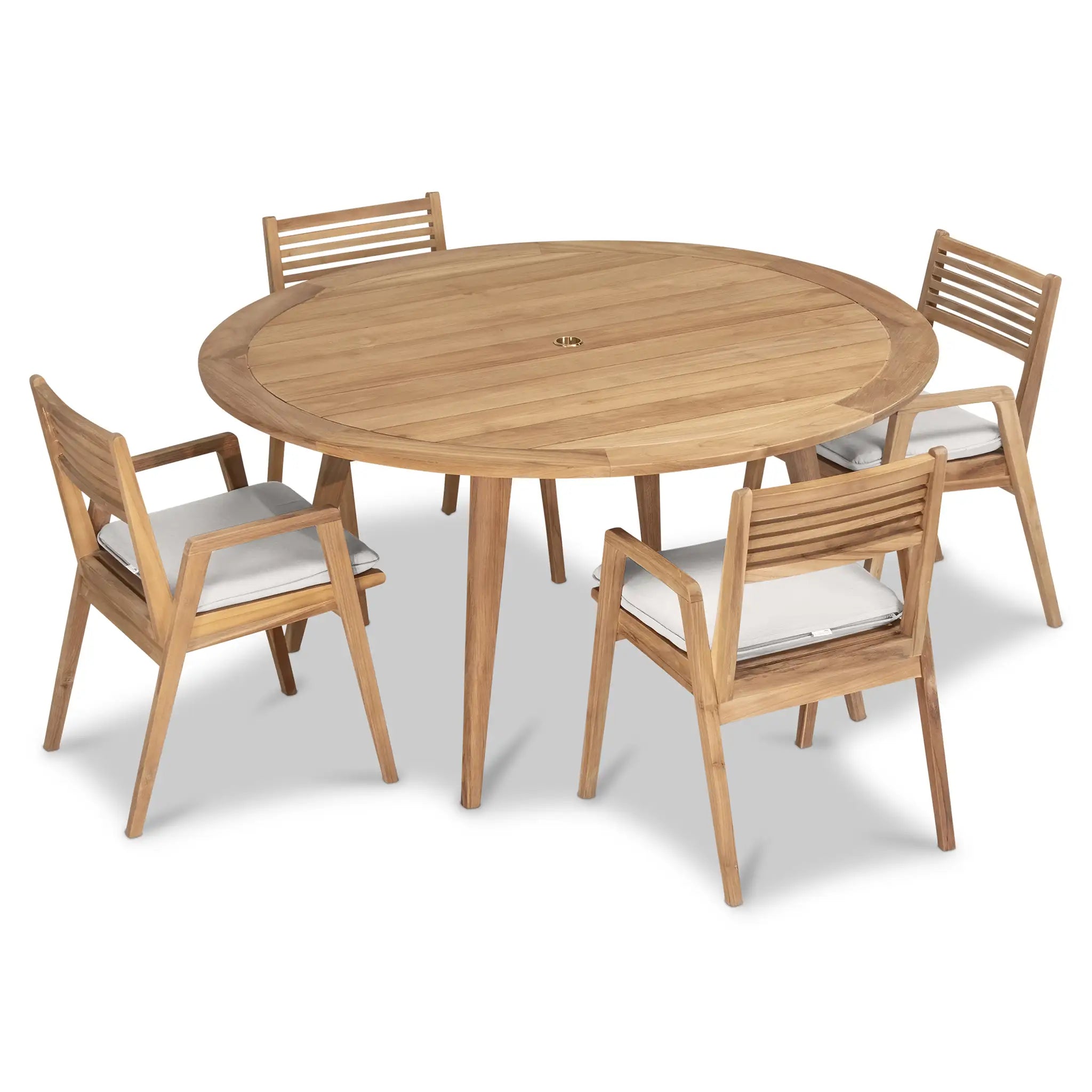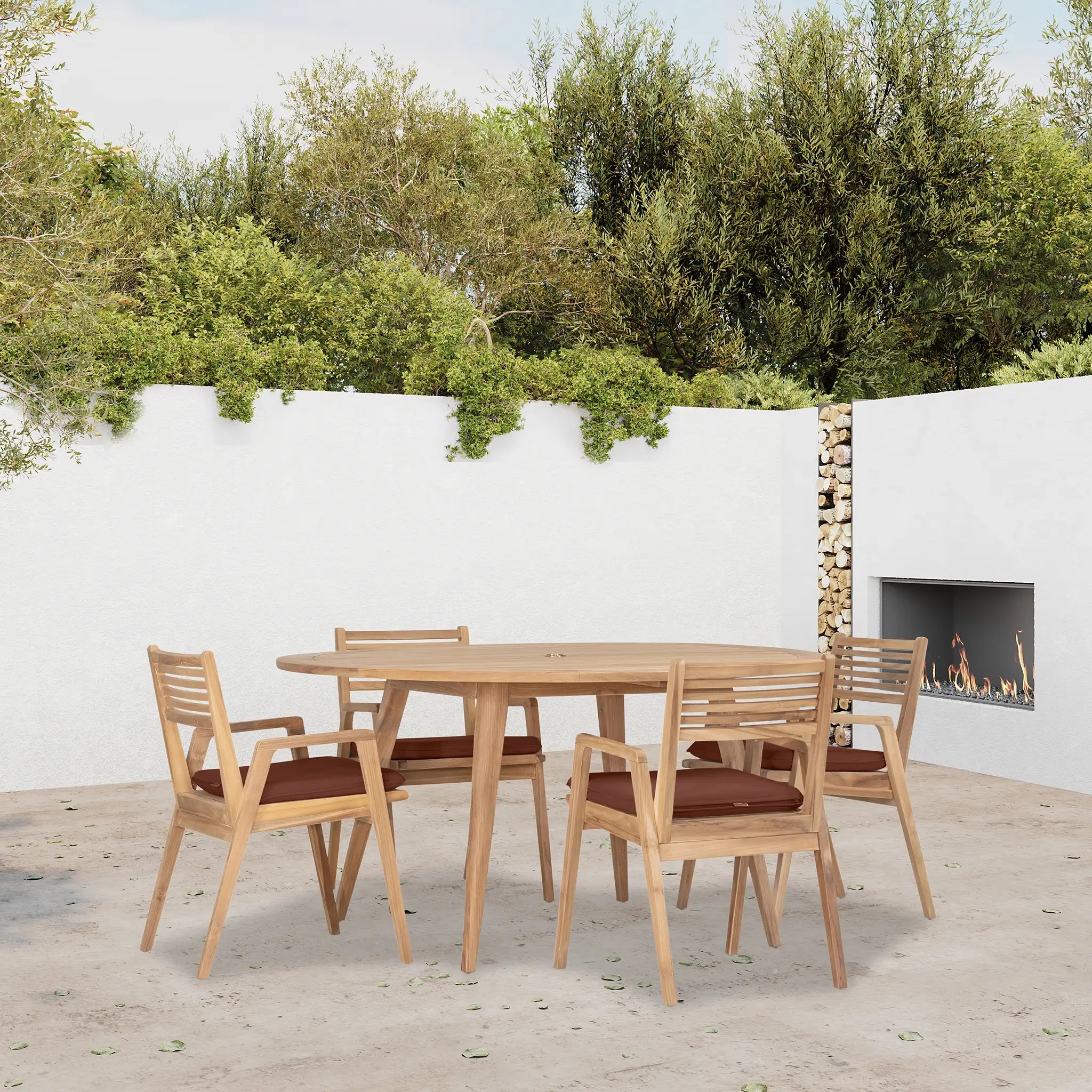 At the heart of this dining set is the Tango Round Dining Table, a beautifully crafted centerpiece with a Mid-Century Modern design that remains both classic and timeless. Constructed from Grade A teak wood, the table is naturally resistant to moisture, rotting, and pests, making it exceptionally well-suited for a variety of climates. The teak's rich natural grain and warm tone bring an organic, inviting feel to the space, while its sturdy construction ensures lasting strength and stability. Designed for both casual meals and elegant gatherings, the round shape fosters intimate conversation and a welcoming atmosphere, making it an excellent choice for small patios, balconies, or dining nooks.