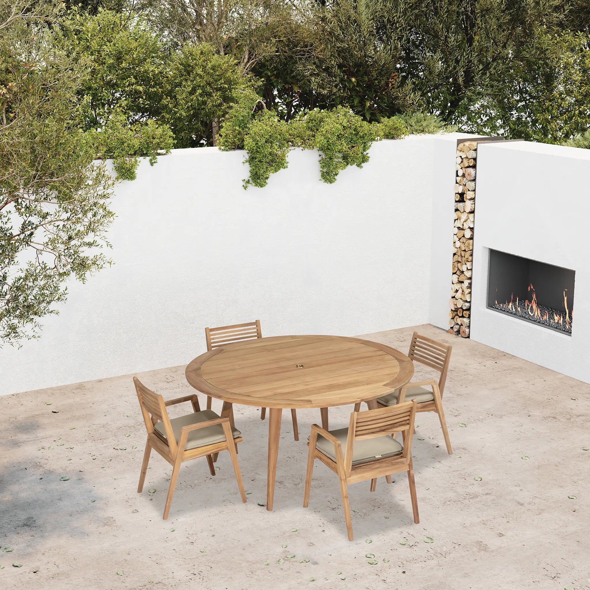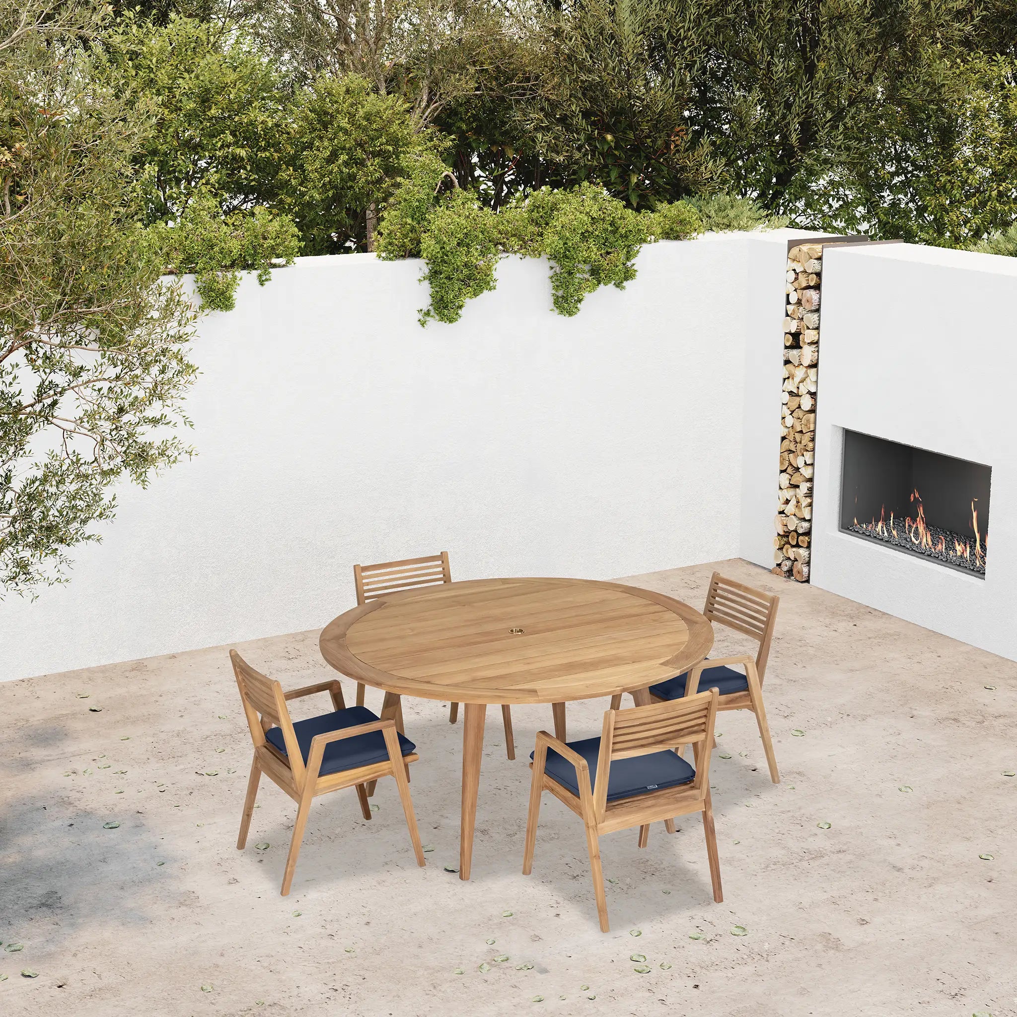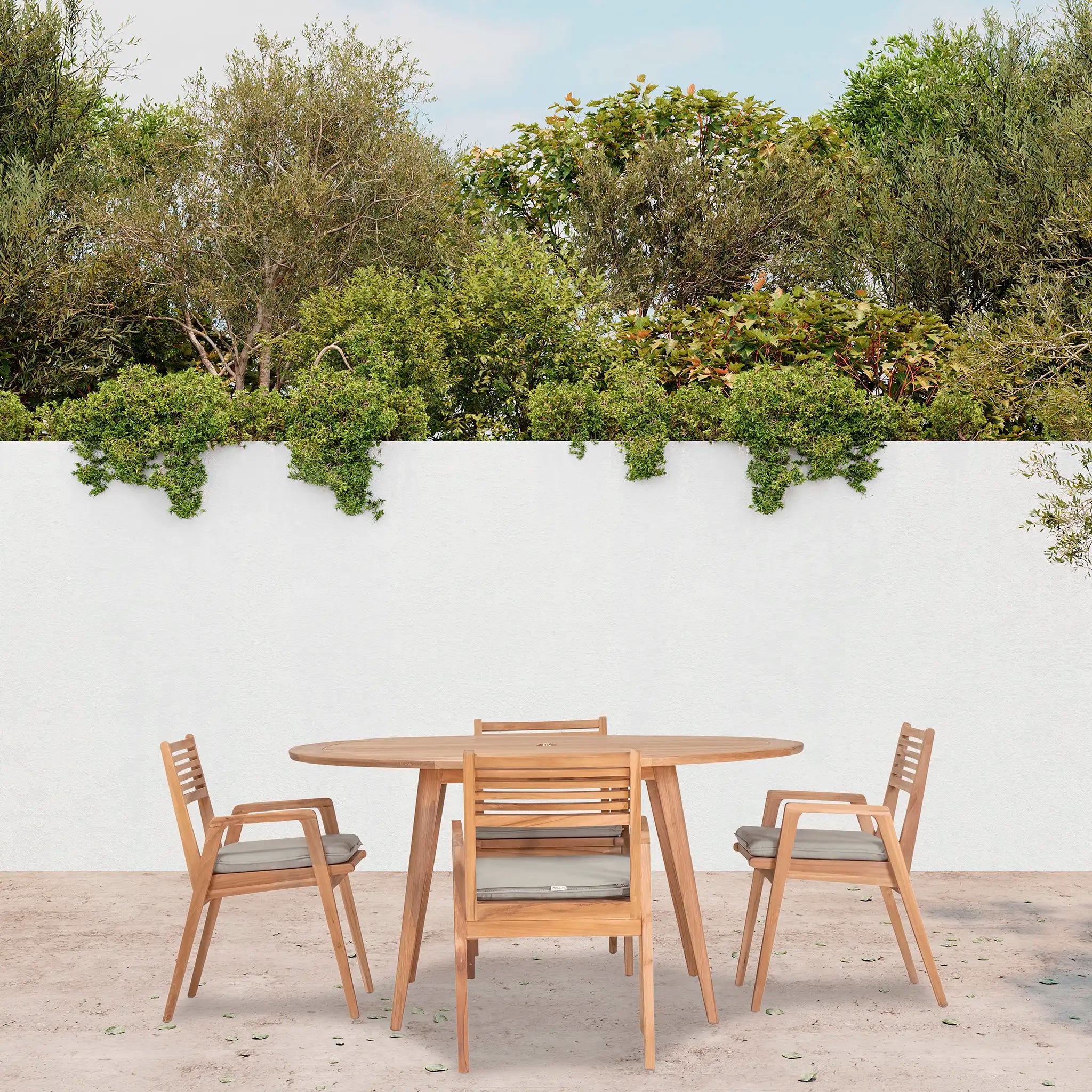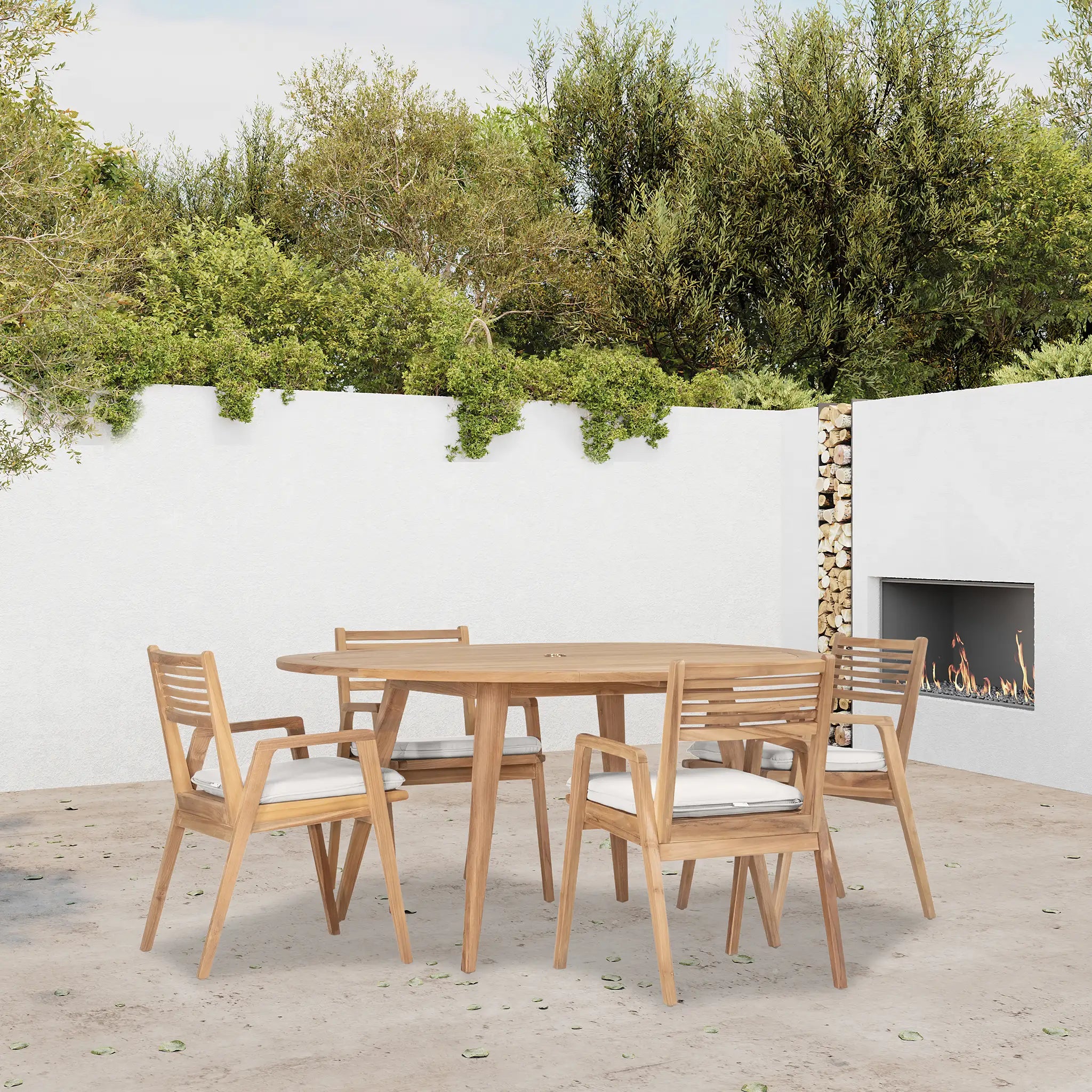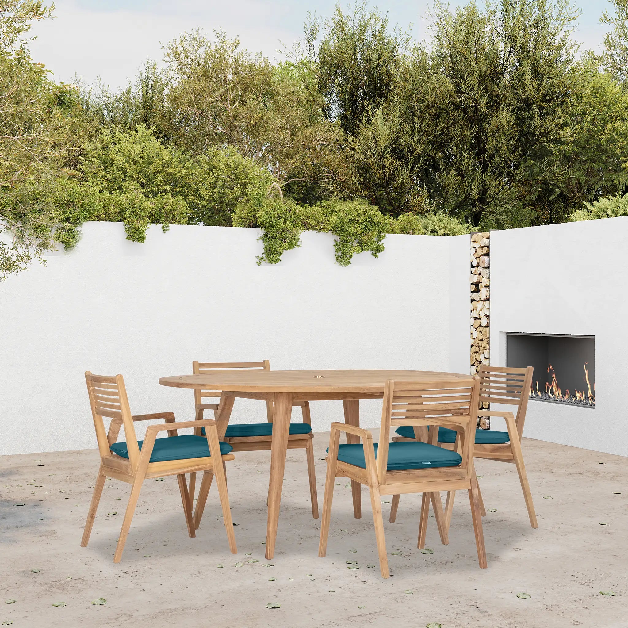 At the heart of this dining set is the Tango Round Dining Table, a beautifully crafted centerpiece with a Mid-Century Modern design that remains both classic and timeless. Constructed from Grade A teak wood, the table is naturally resistant to moisture, rotting, and pests, making it exceptionally well-suited for a variety of climates. The teak's rich natural grain and warm tone bring an organic, inviting feel to the space, while its sturdy construction ensures lasting strength and stability. Designed for both casual meals and elegant gatherings, the round shape fosters intimate conversation and a welcoming atmosphere, making it an excellent choice for small patios, balconies, or dining nooks.
