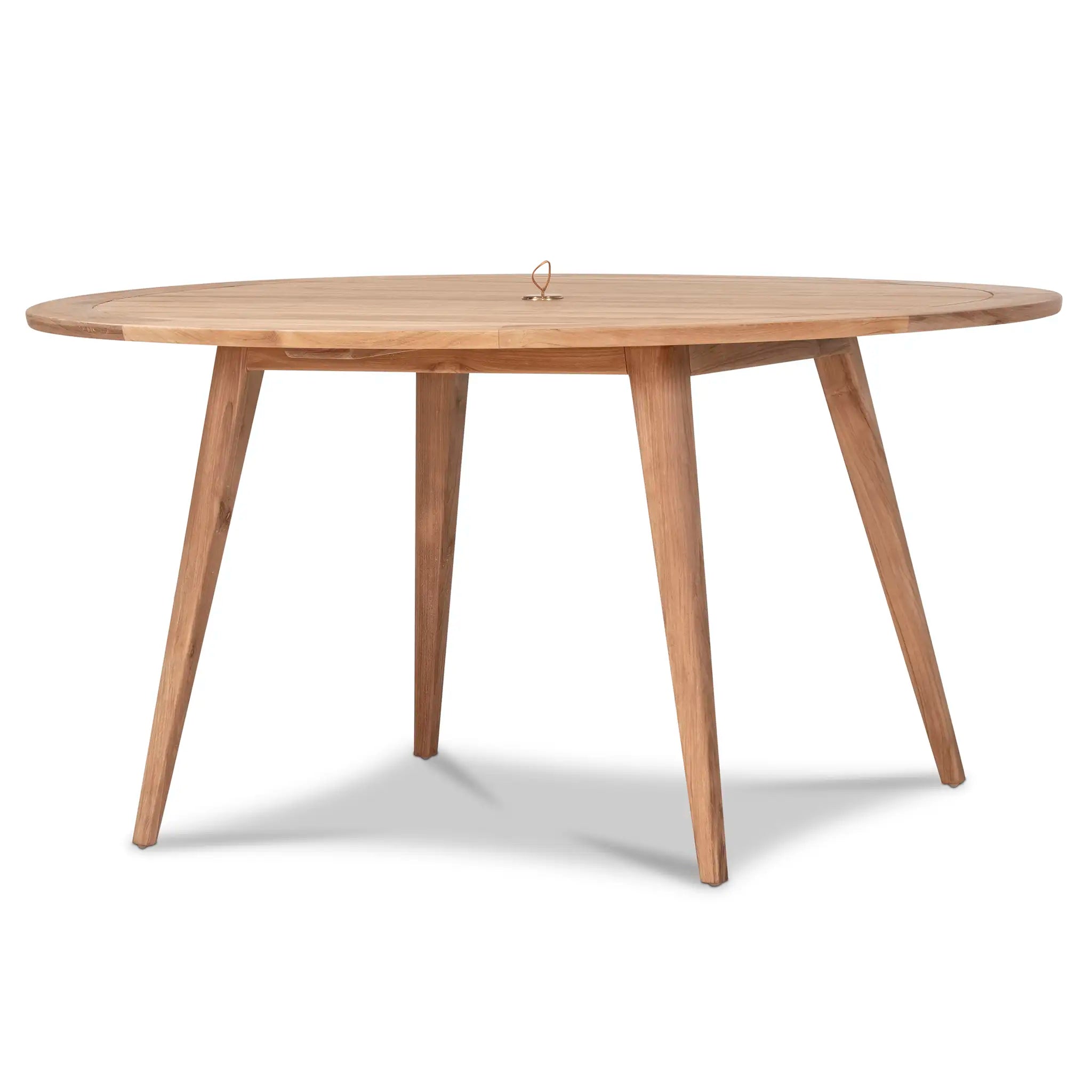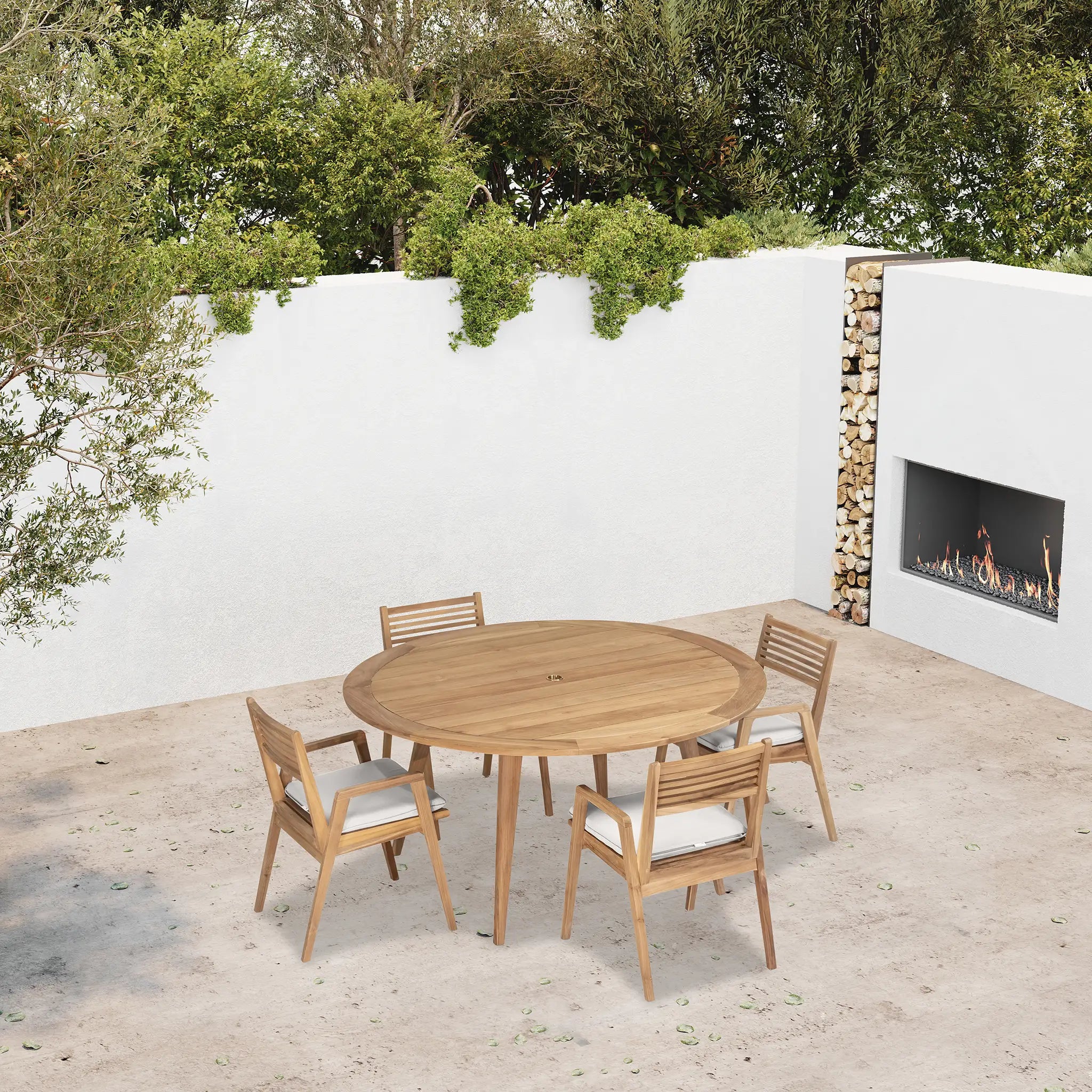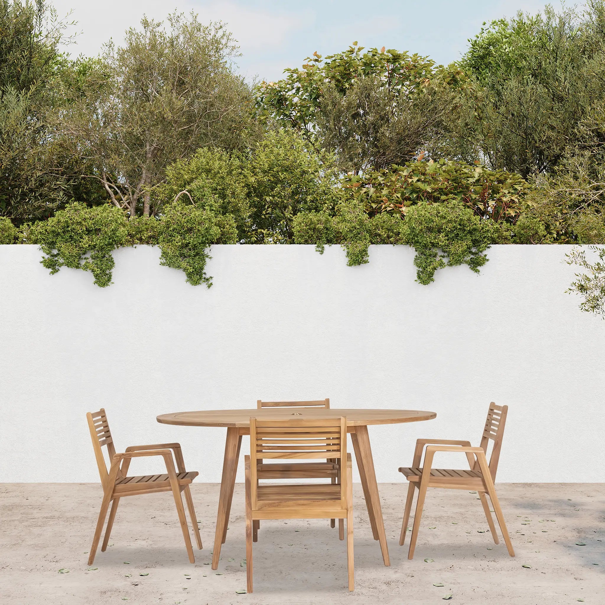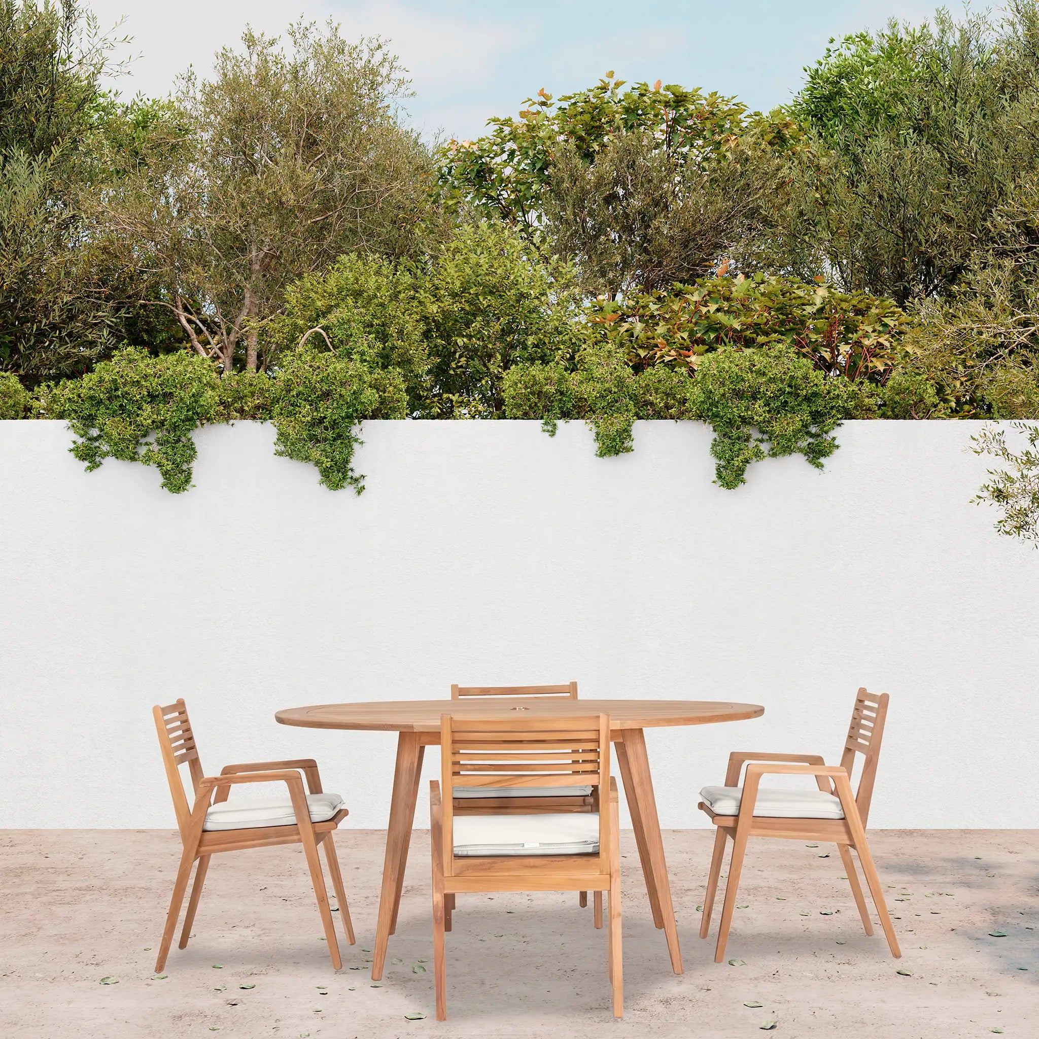 At the heart of this dining set is the Tango Round Dining Table, a beautifully crafted centerpiece with a Mid-Century Modern design that remains both classic and timeless. Constructed from Grade A teak wood, the table is naturally resistant to moisture, rotting, and pests, making it exceptionally well-suited for a variety of climates. The teak's rich natural grain and warm tone bring an organic, inviting feel to the space, while its sturdy construction ensures lasting strength and stability. Designed for both casual meals and elegant gatherings, the round shape fosters intimate conversation and a welcoming atmosphere, making it an excellent choice for small patios, balconies, or dining nooks.