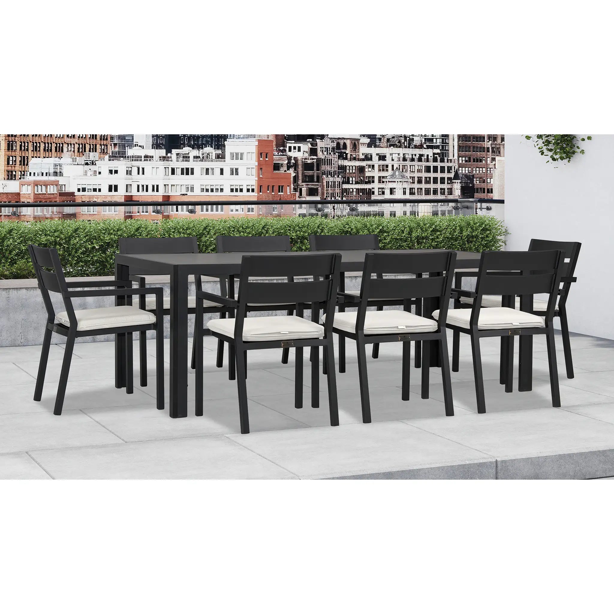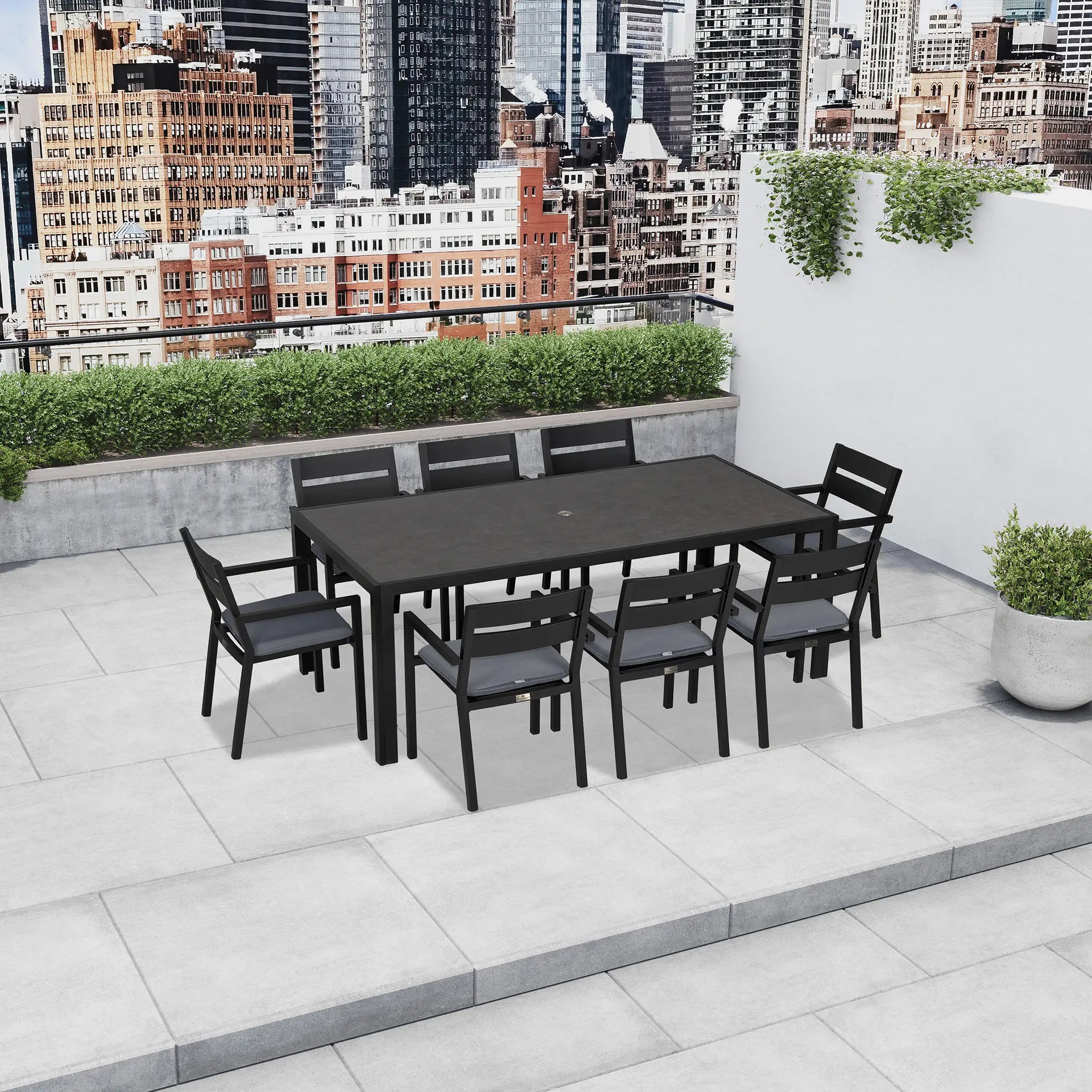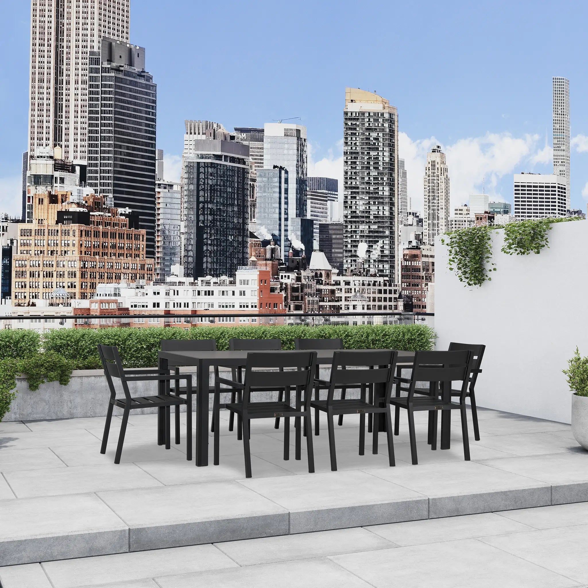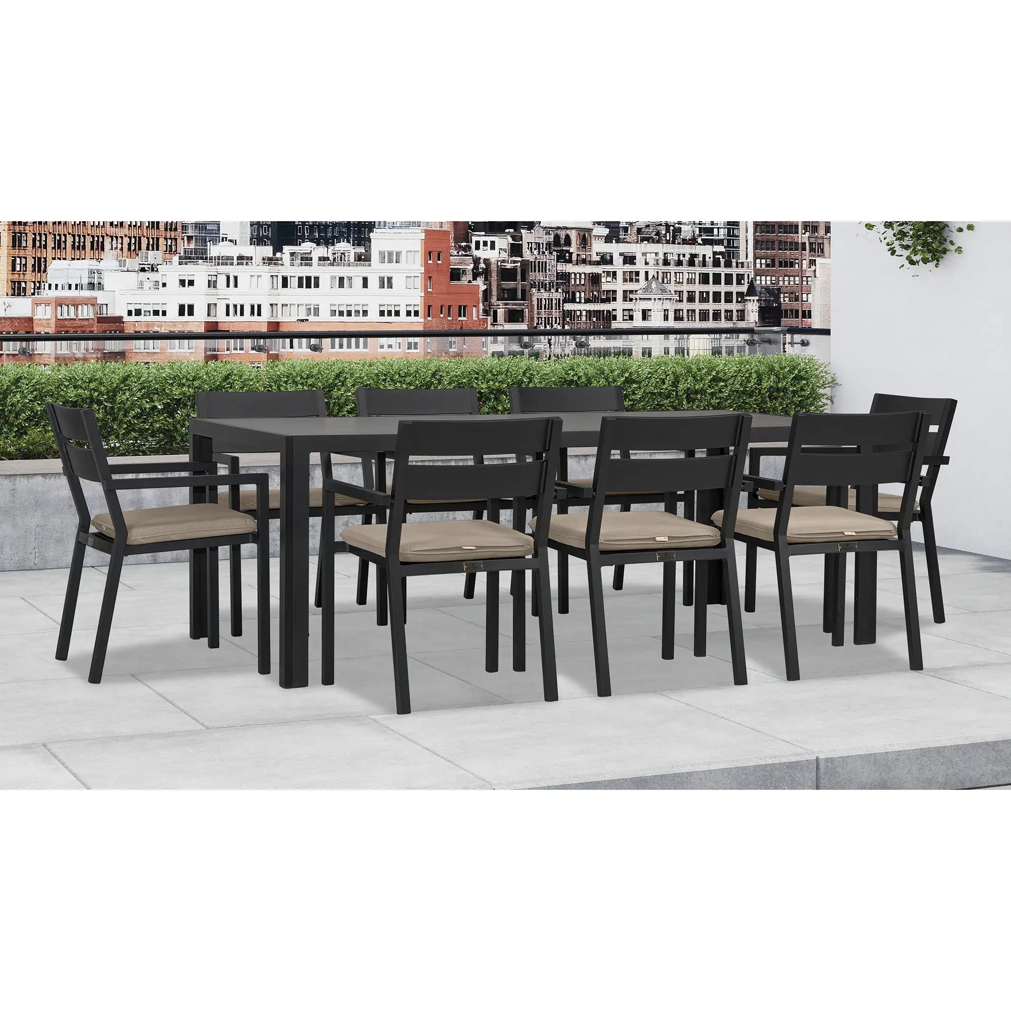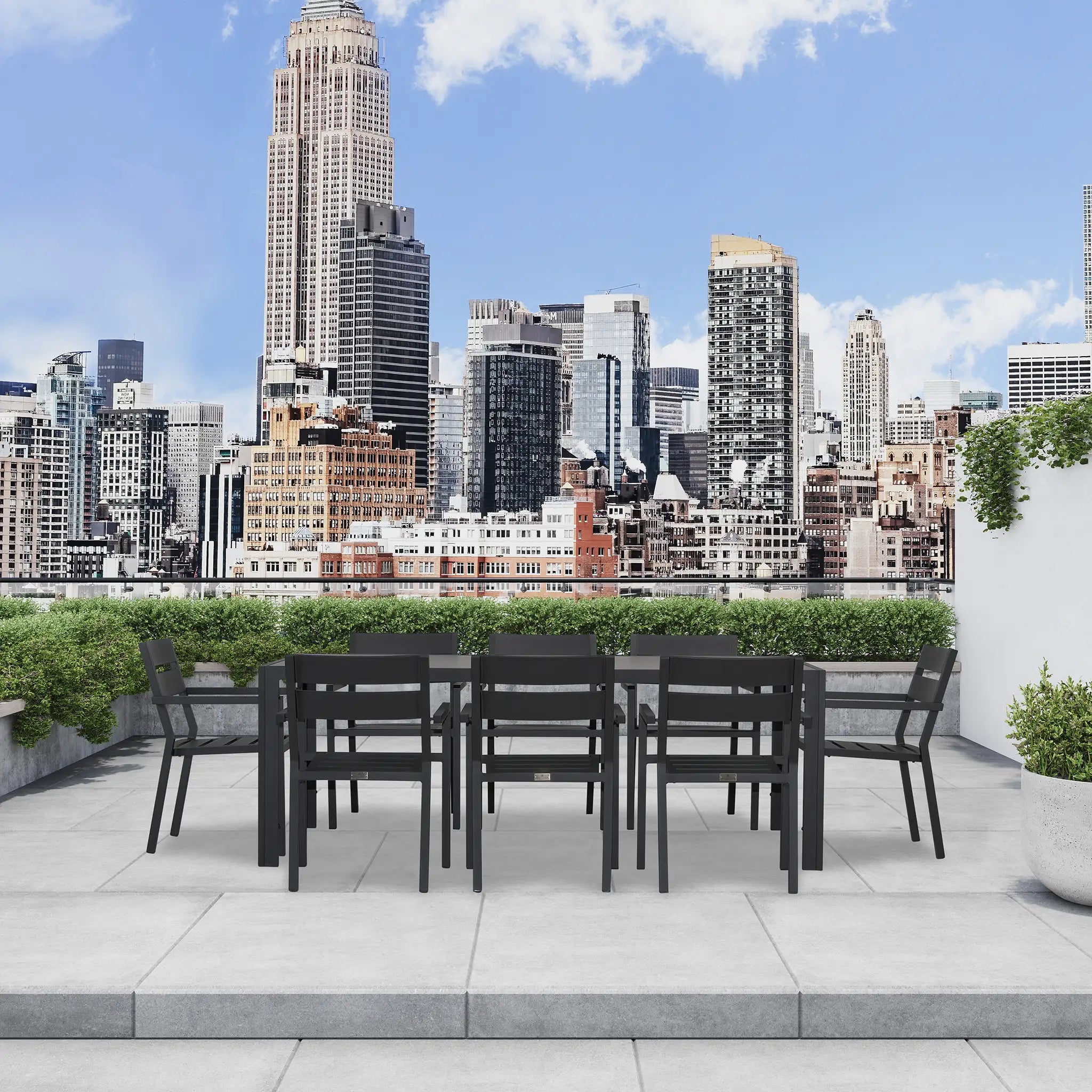 The Harmonia Living Pacifica 8 Seat Aluminum Rectangular Dining Set - Black combines modern design with lasting functionality, making it an excellent choice for your outdoor dining space. Its minimalist aesthetic, featuring plush cushions and gentle angles, brings a touch of refinement that complements patios of all sizes, from intimate settings to larger gatherings. The sleek, contemporary style of this dining set is perfect for anyone looking to elevate their outdoor decor while maintaining a welcoming, comfortable atmosphere.