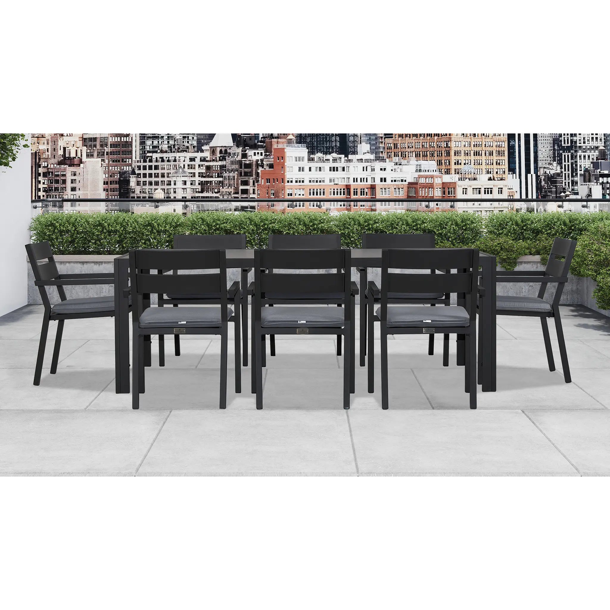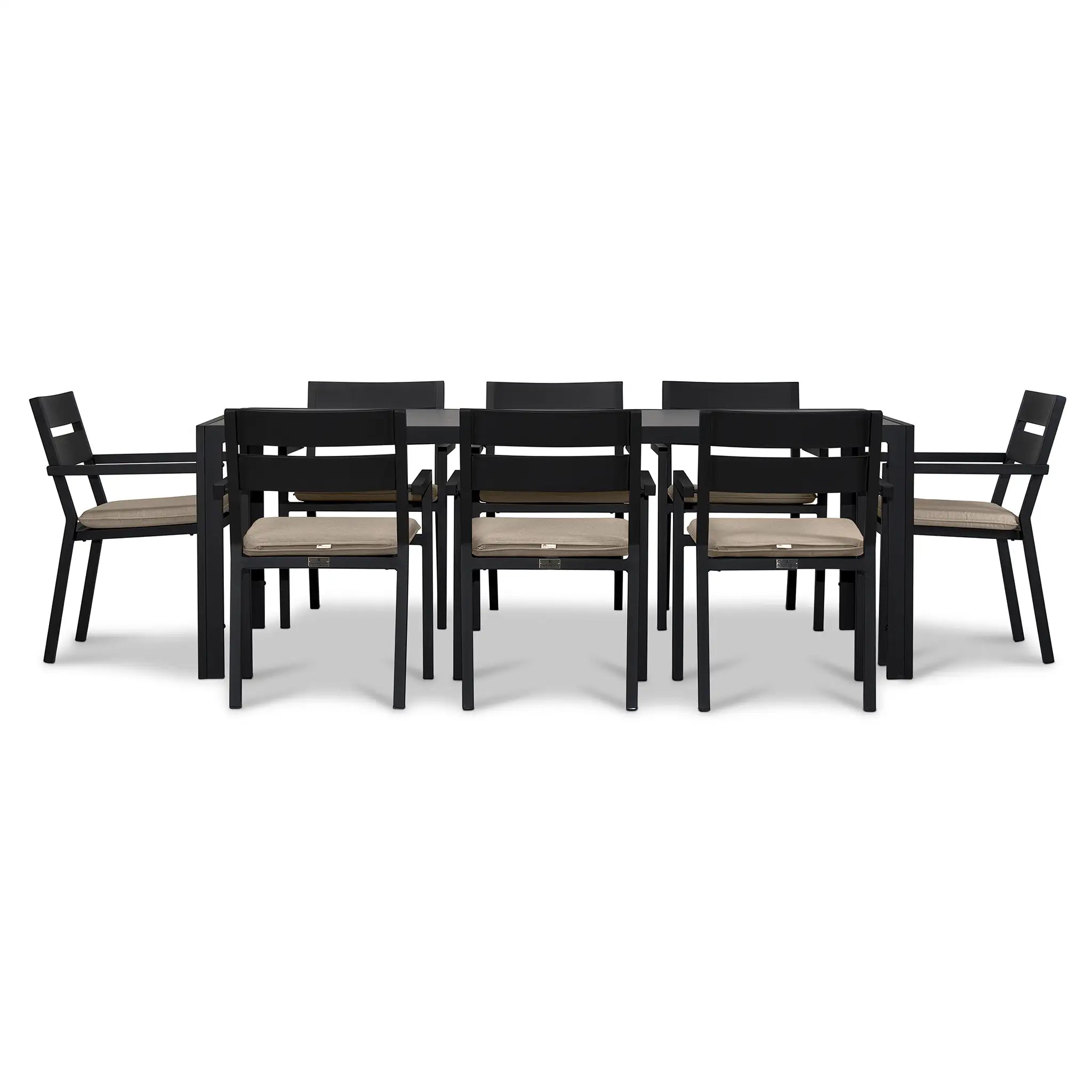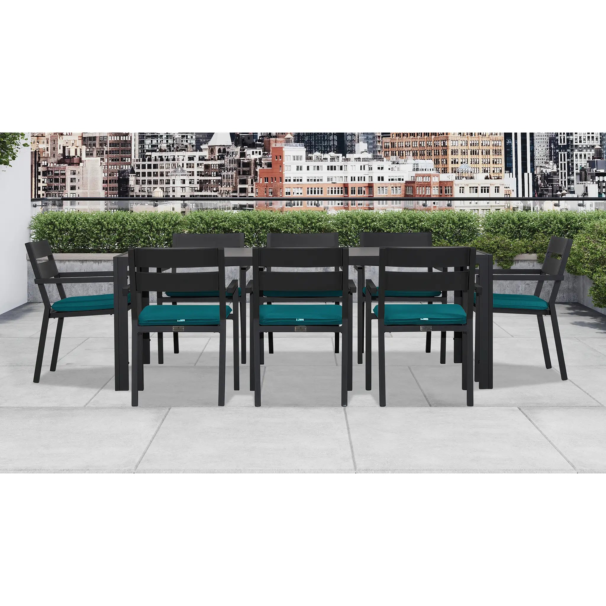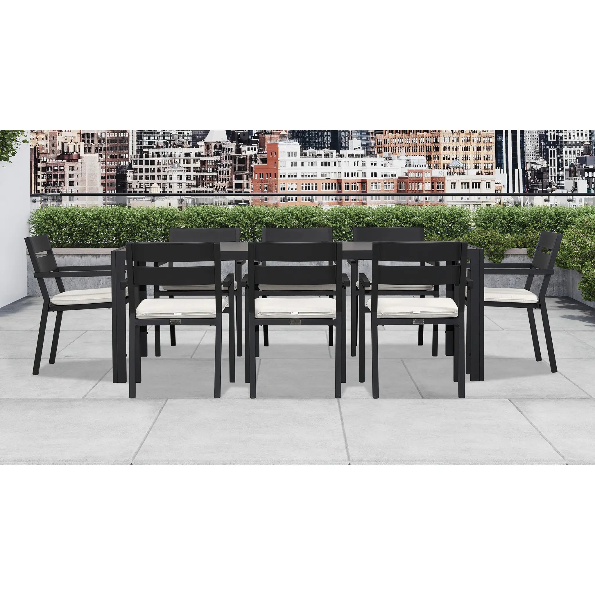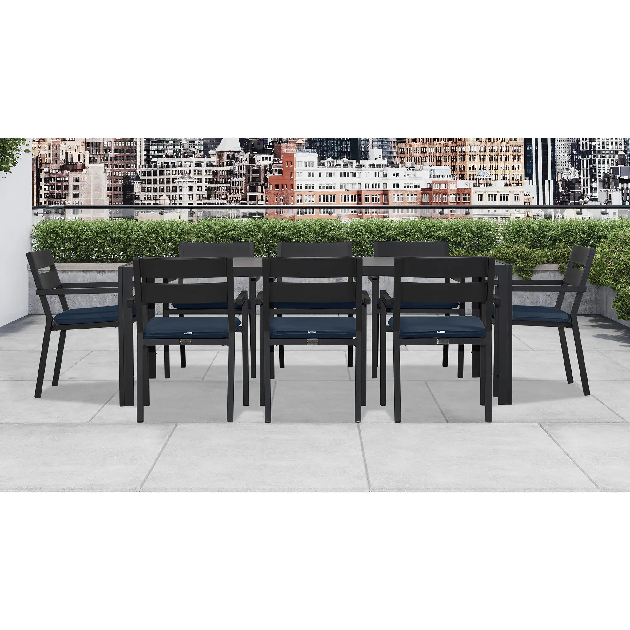 The Harmonia Living Pacifica 8 Seat Aluminum Rectangular Dining Set - Black combines modern design with lasting functionality, making it an excellent choice for your outdoor dining space. Its minimalist aesthetic, featuring plush cushions and gentle angles, brings a touch of refinement that complements patios of all sizes, from intimate settings to larger gatherings. The sleek, contemporary style of this dining set is perfect for anyone looking to elevate their outdoor decor while maintaining a welcoming, comfortable atmosphere.