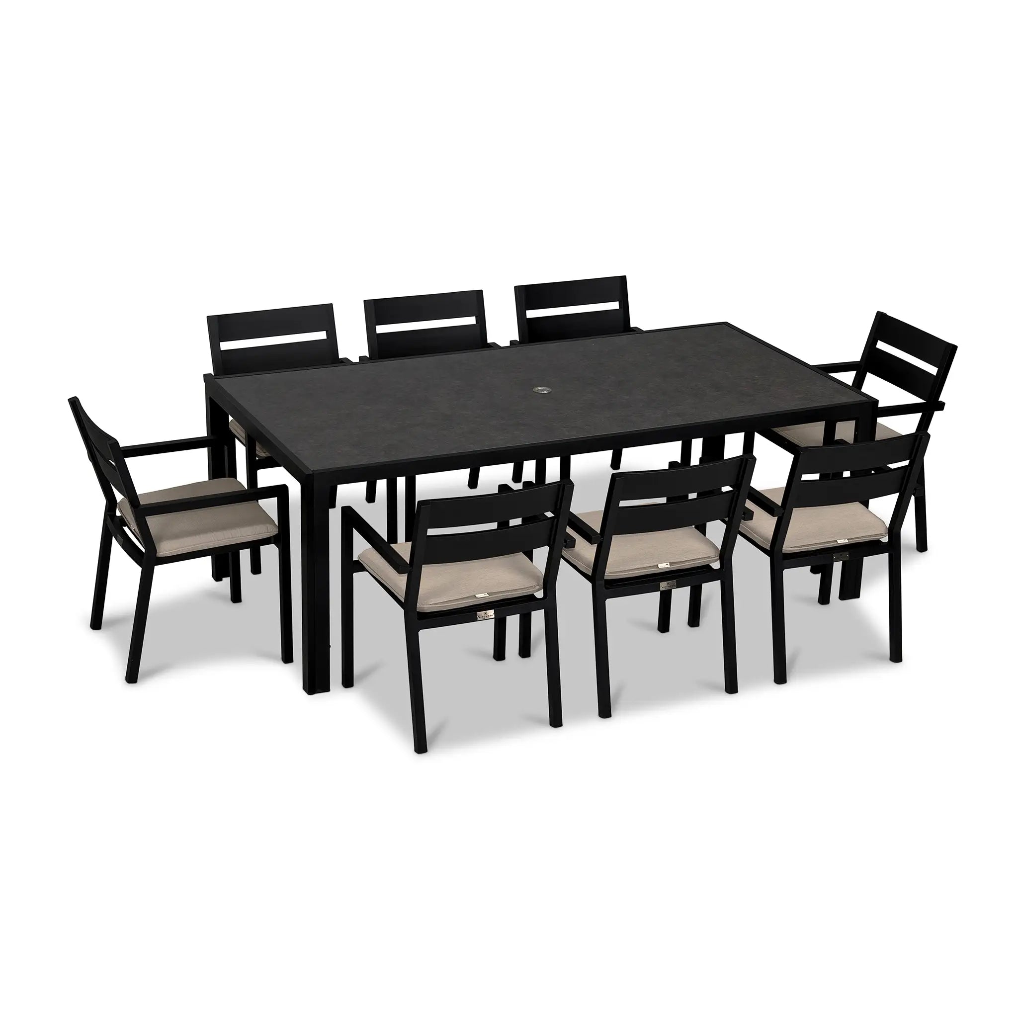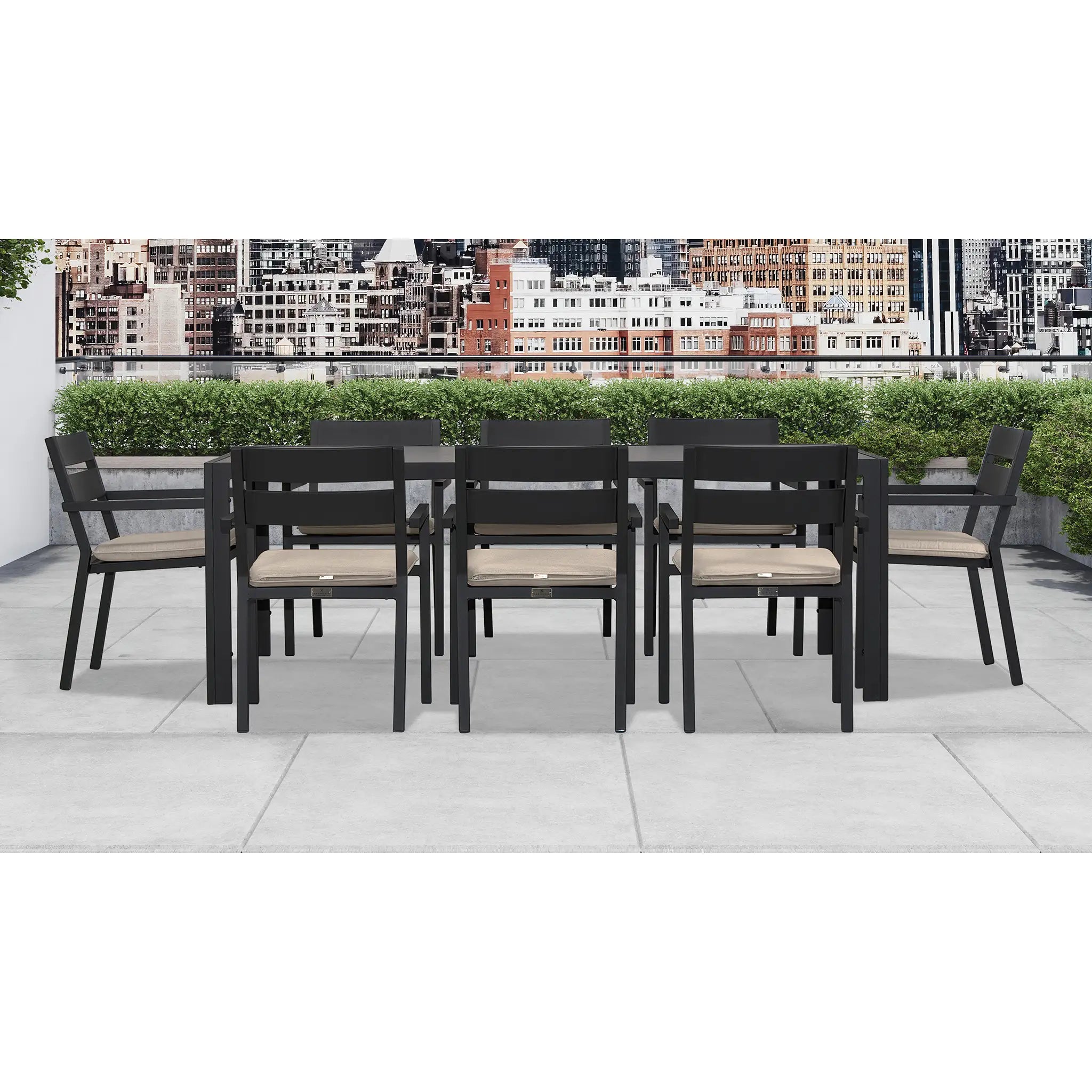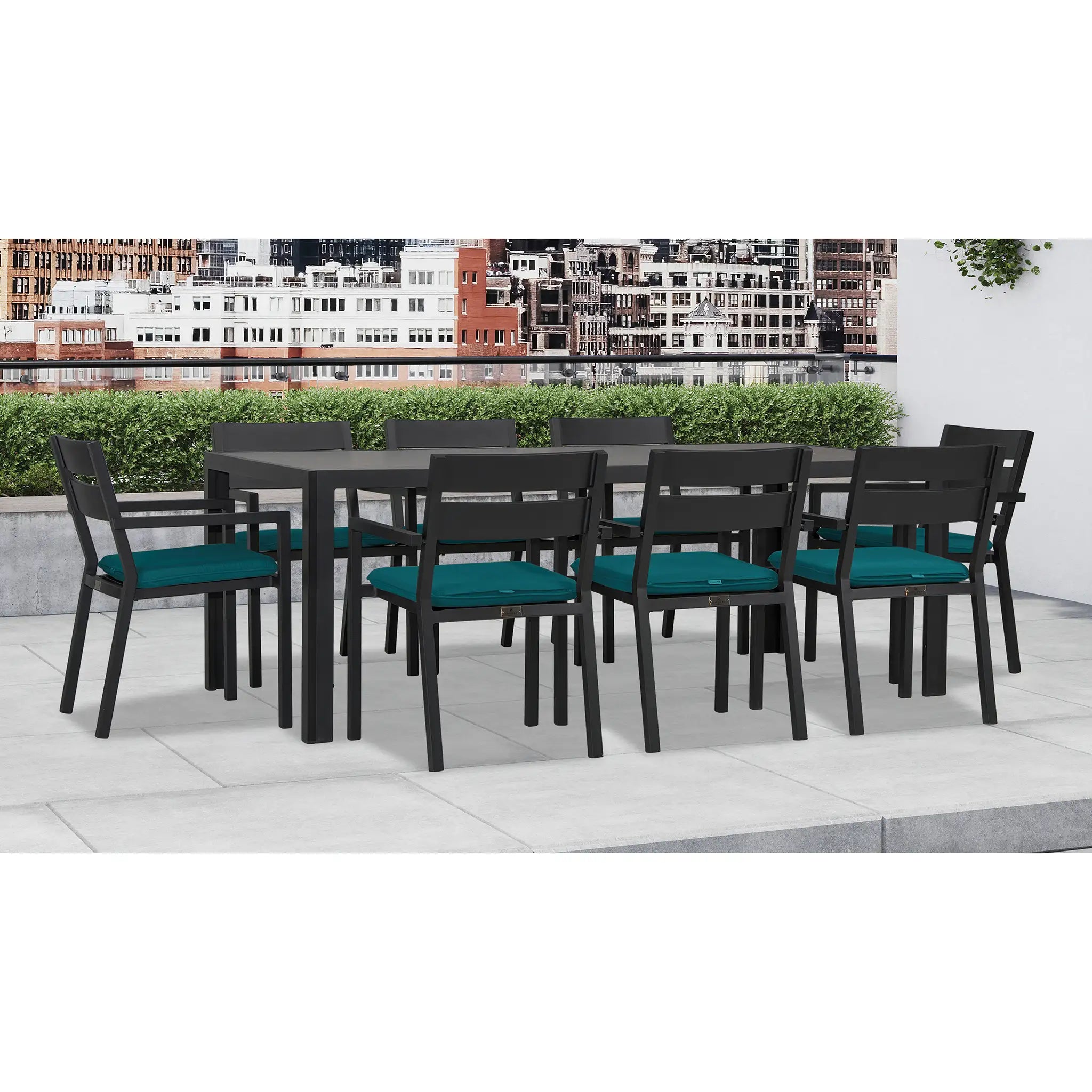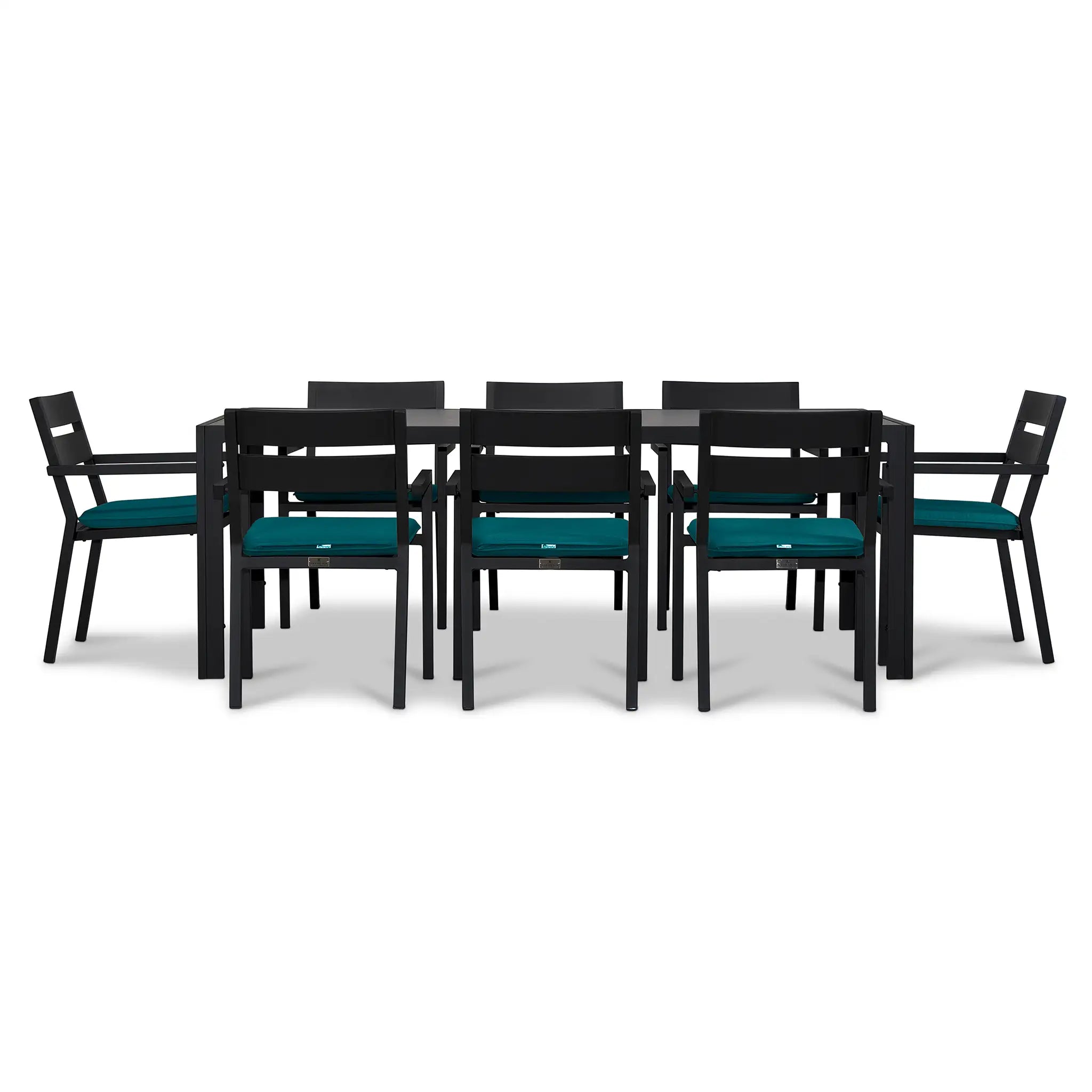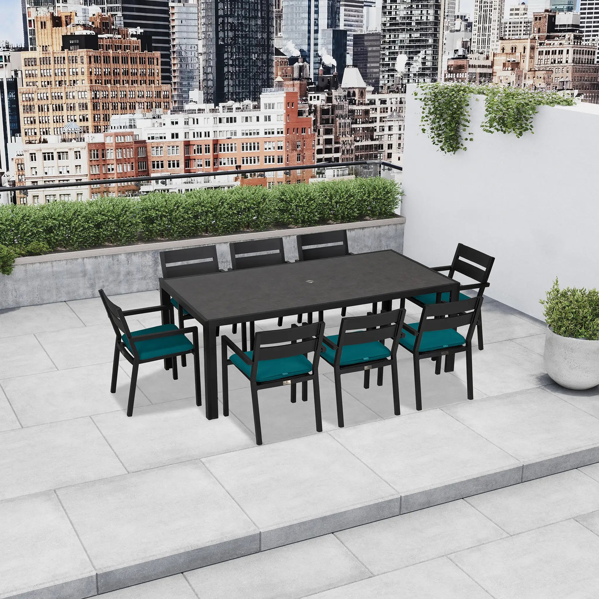 The Harmonia Living Pacifica 8 Seat Aluminum Rectangular Dining Set - Black combines modern design with lasting functionality, making it an excellent choice for your outdoor dining space. Its minimalist aesthetic, featuring plush cushions and gentle angles, brings a touch of refinement that complements patios of all sizes, from intimate settings to larger gatherings. The sleek, contemporary style of this dining set is perfect for anyone looking to elevate their outdoor decor while maintaining a welcoming, comfortable atmosphere.