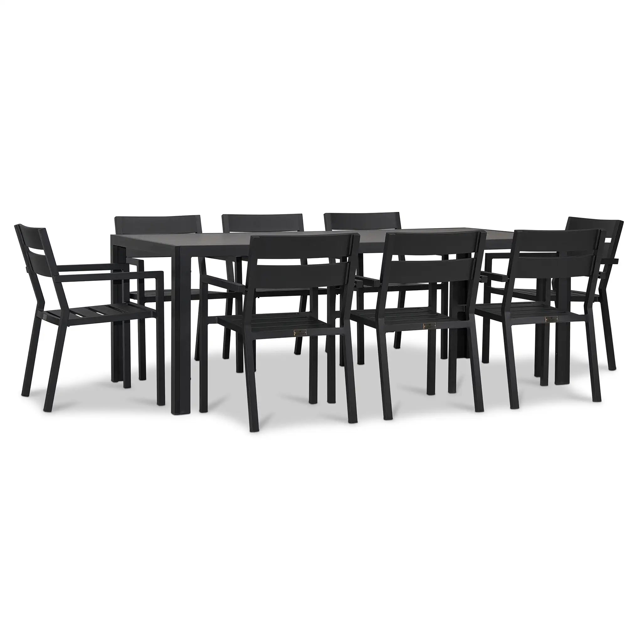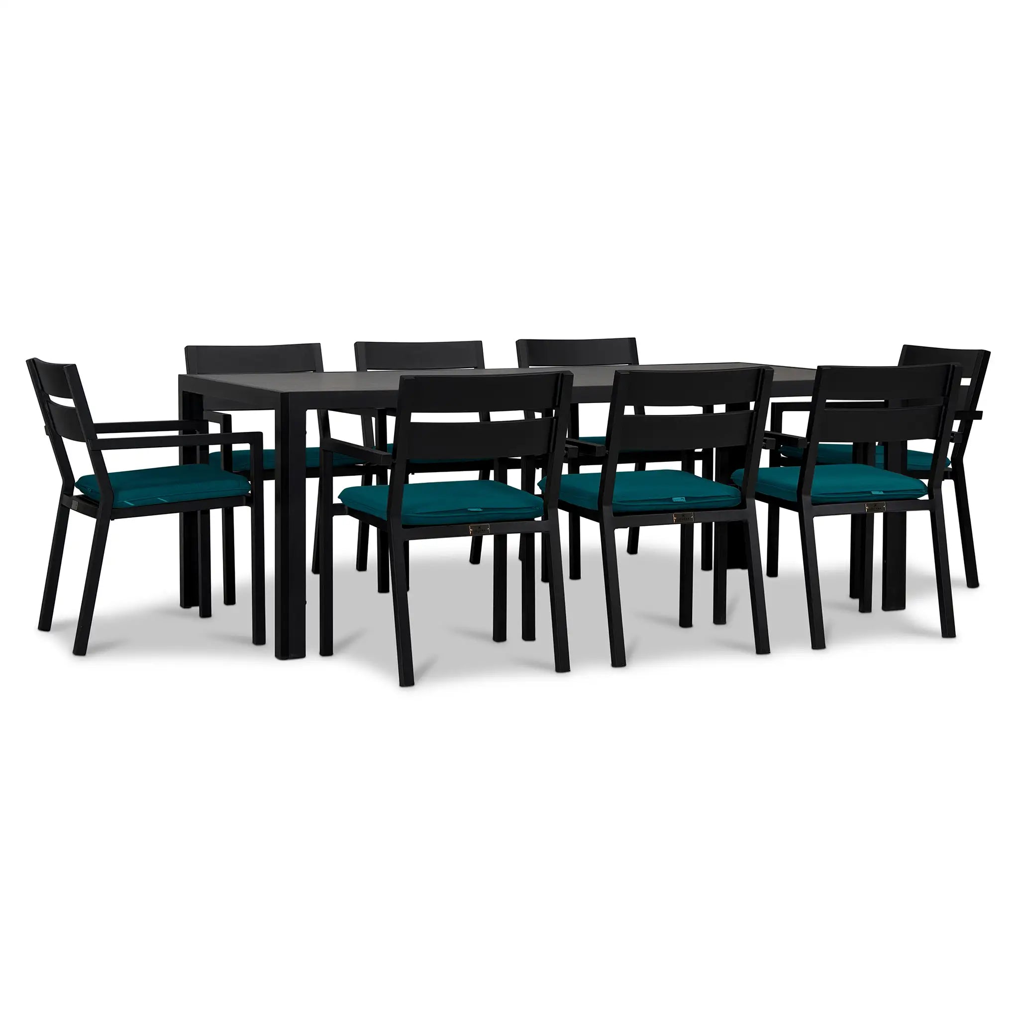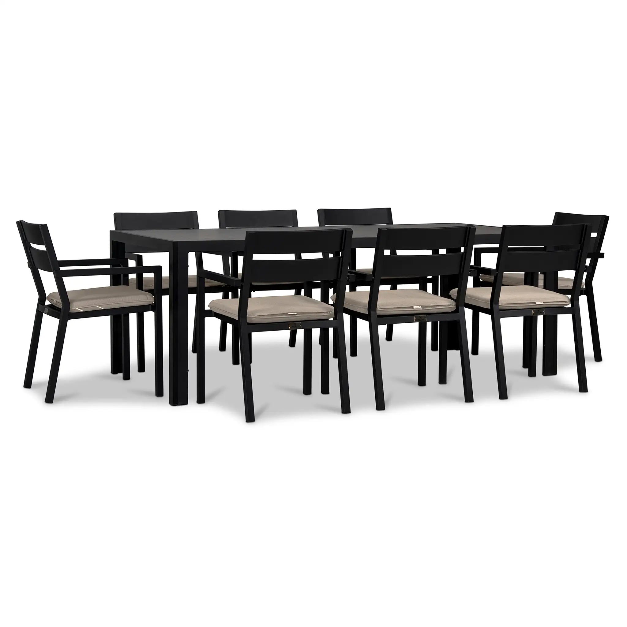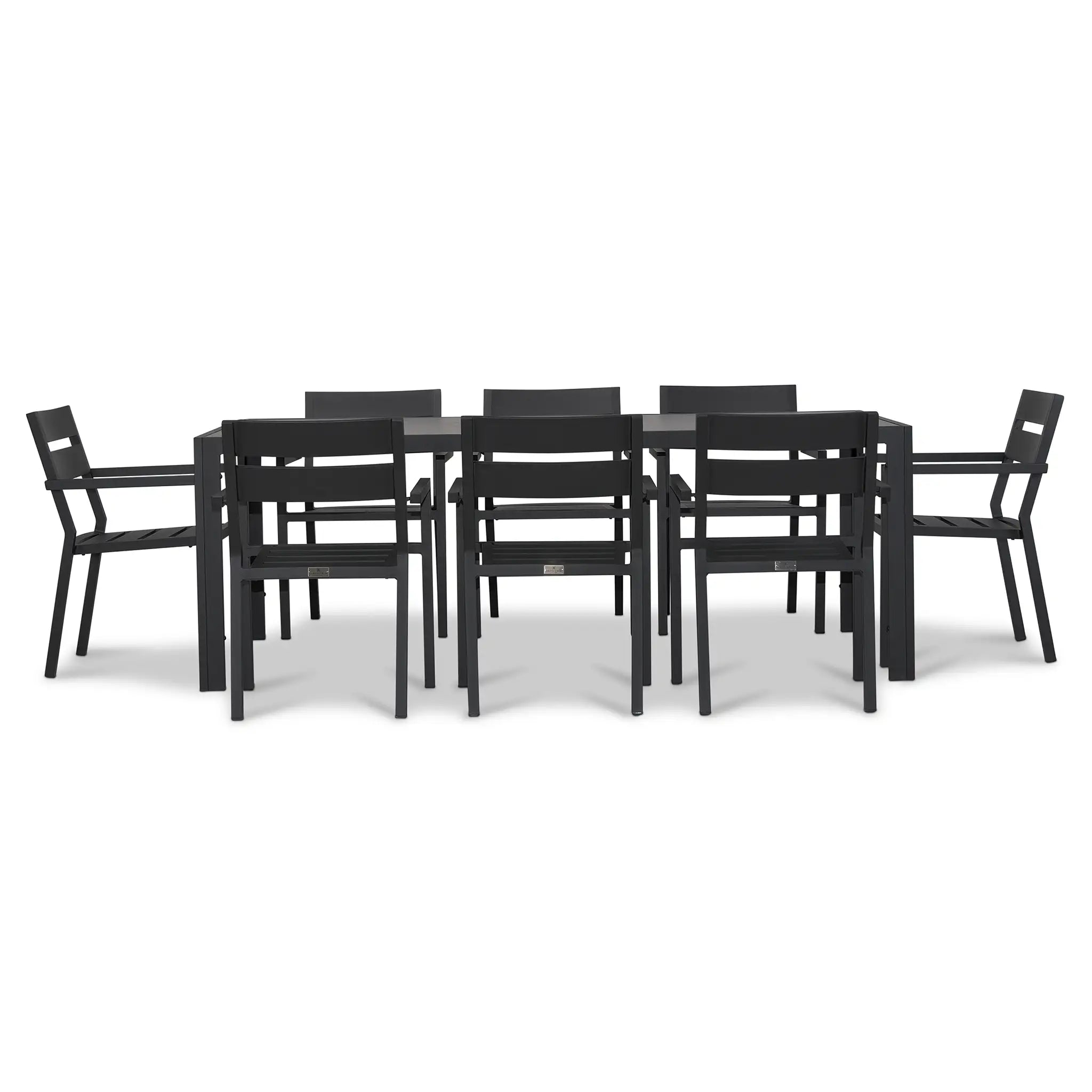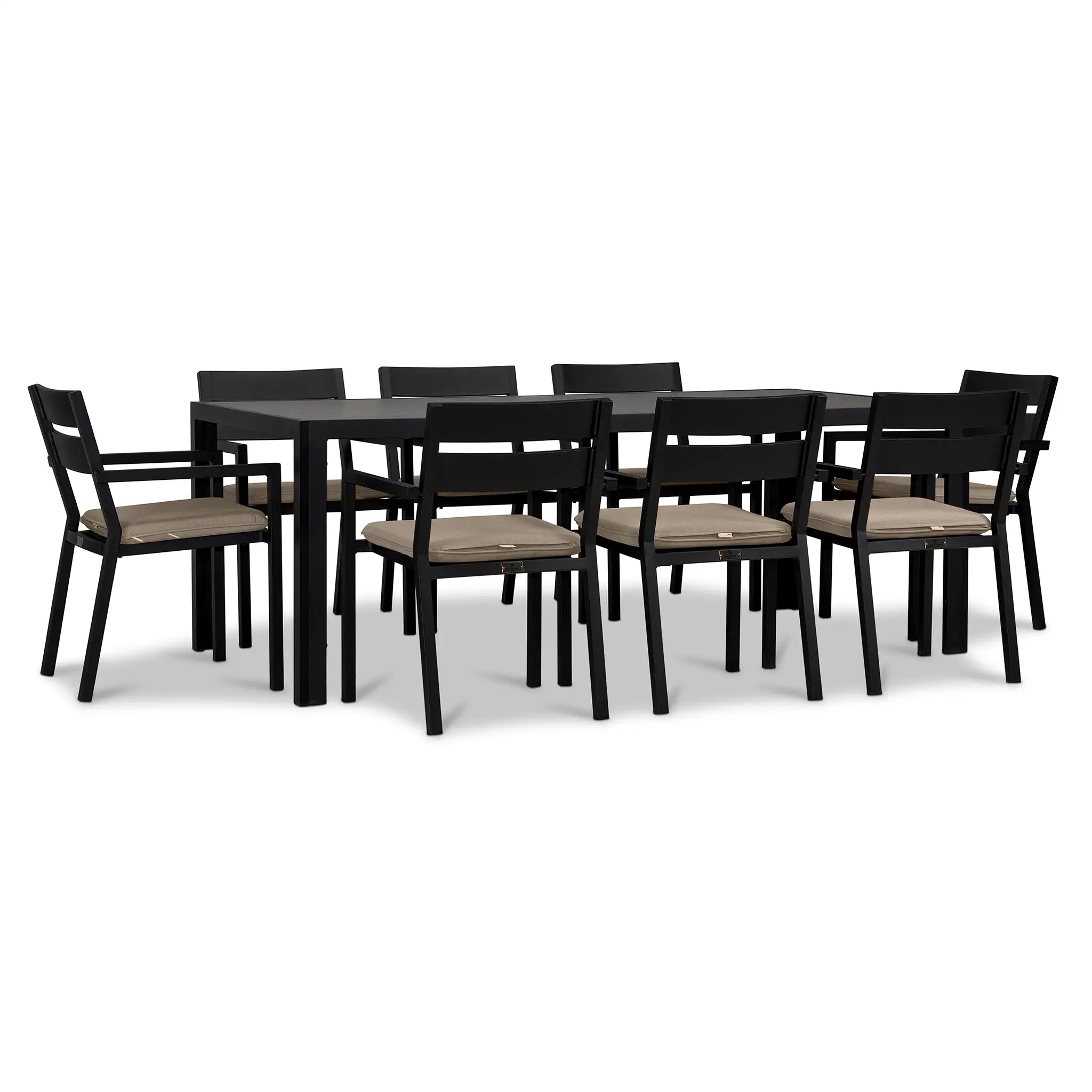 The Harmonia Living Pacifica 8 Seat Aluminum Rectangular Dining Set - Black combines modern design with lasting functionality, making it an excellent choice for your outdoor dining space. Its minimalist aesthetic, featuring plush cushions and gentle angles, brings a touch of refinement that complements patios of all sizes, from intimate settings to larger gatherings. The sleek, contemporary style of this dining set is perfect for anyone looking to elevate their outdoor decor while maintaining a welcoming, comfortable atmosphere.