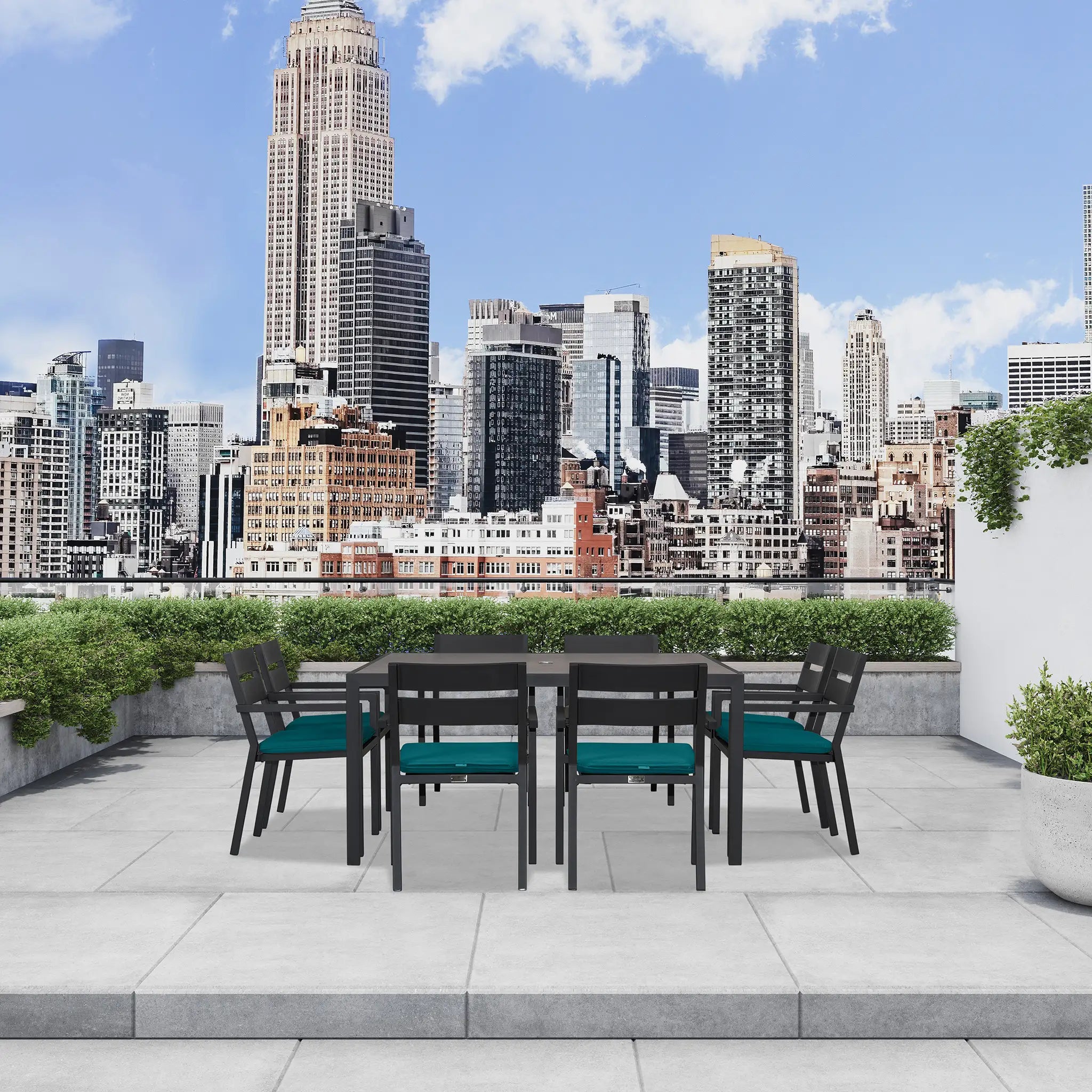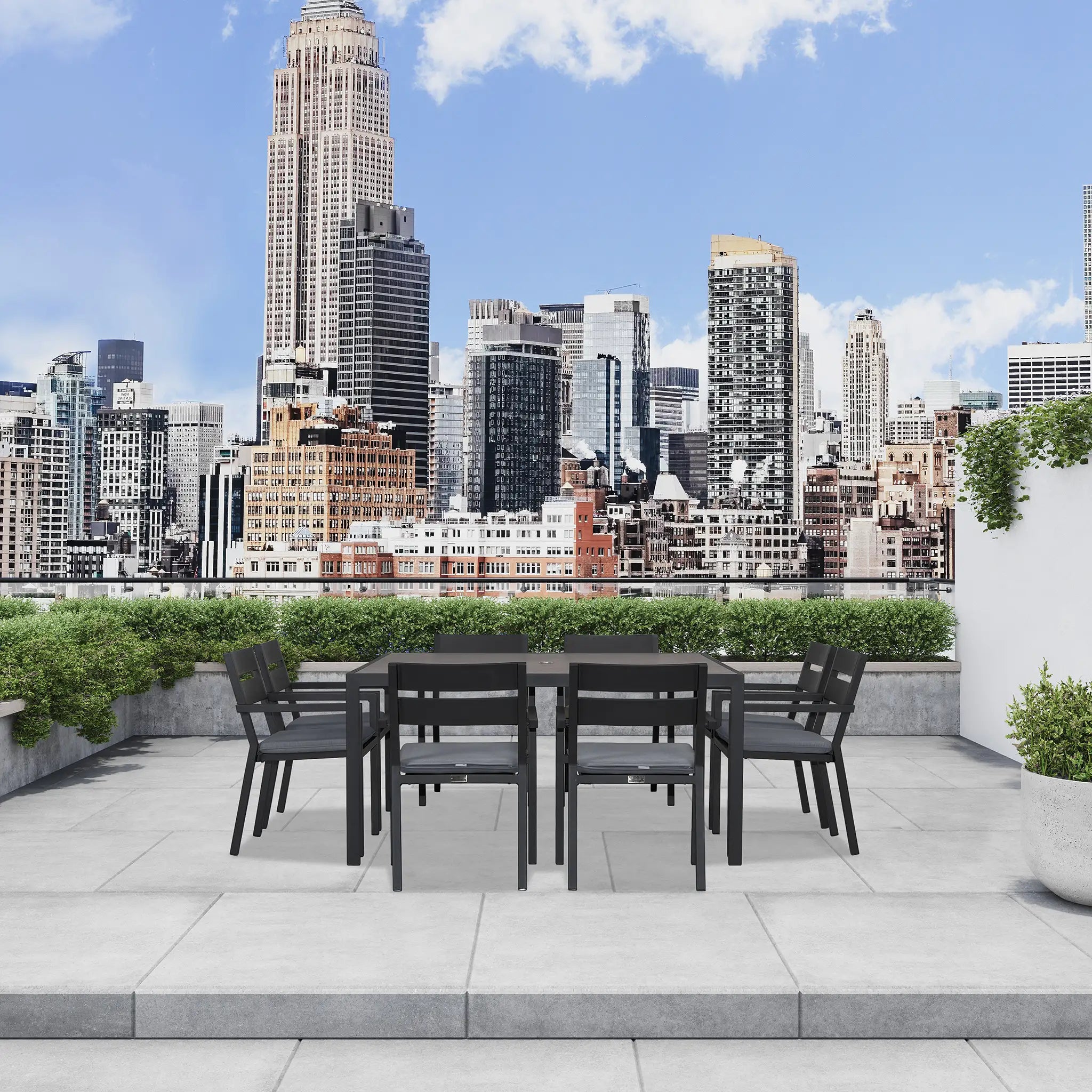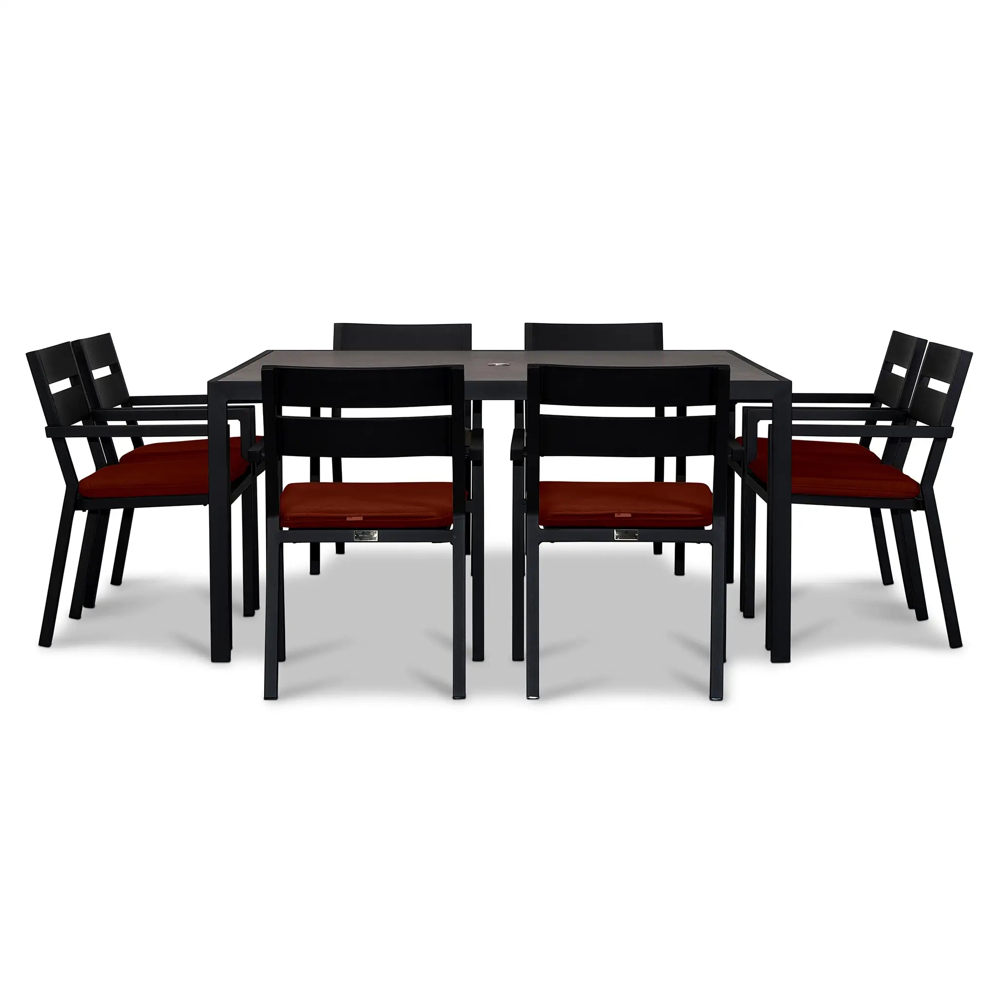 At the heart of this set are eight sleek dining chairs, featuring gentle angles, minimalist silhouettes, and optional plush cushions for enhanced comfort. The chairs are constructed with fully-welded aluminum frames that are powder-coated for superior weather resistance, ensuring they stand up to harsh outdoor conditions without rusting, chipping, or fading.