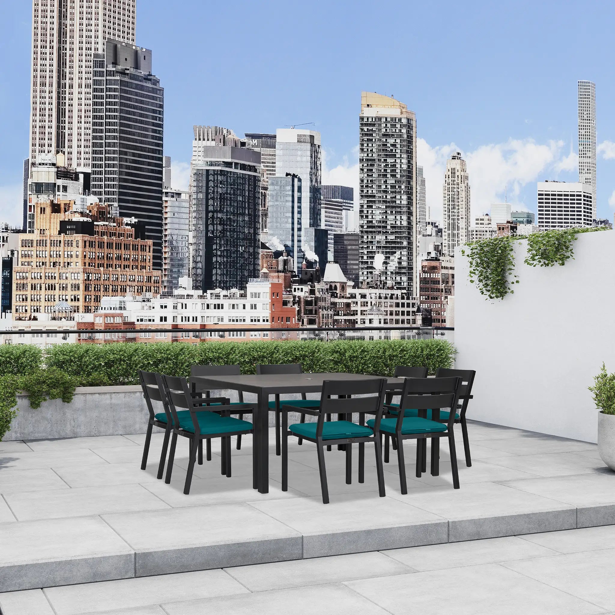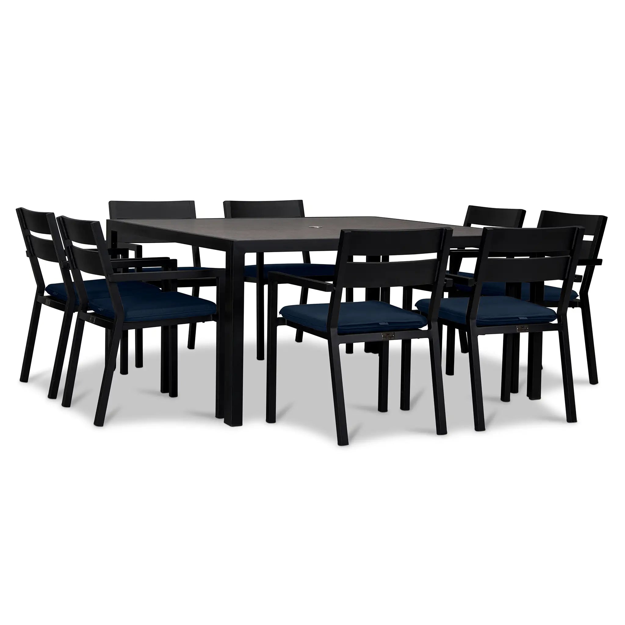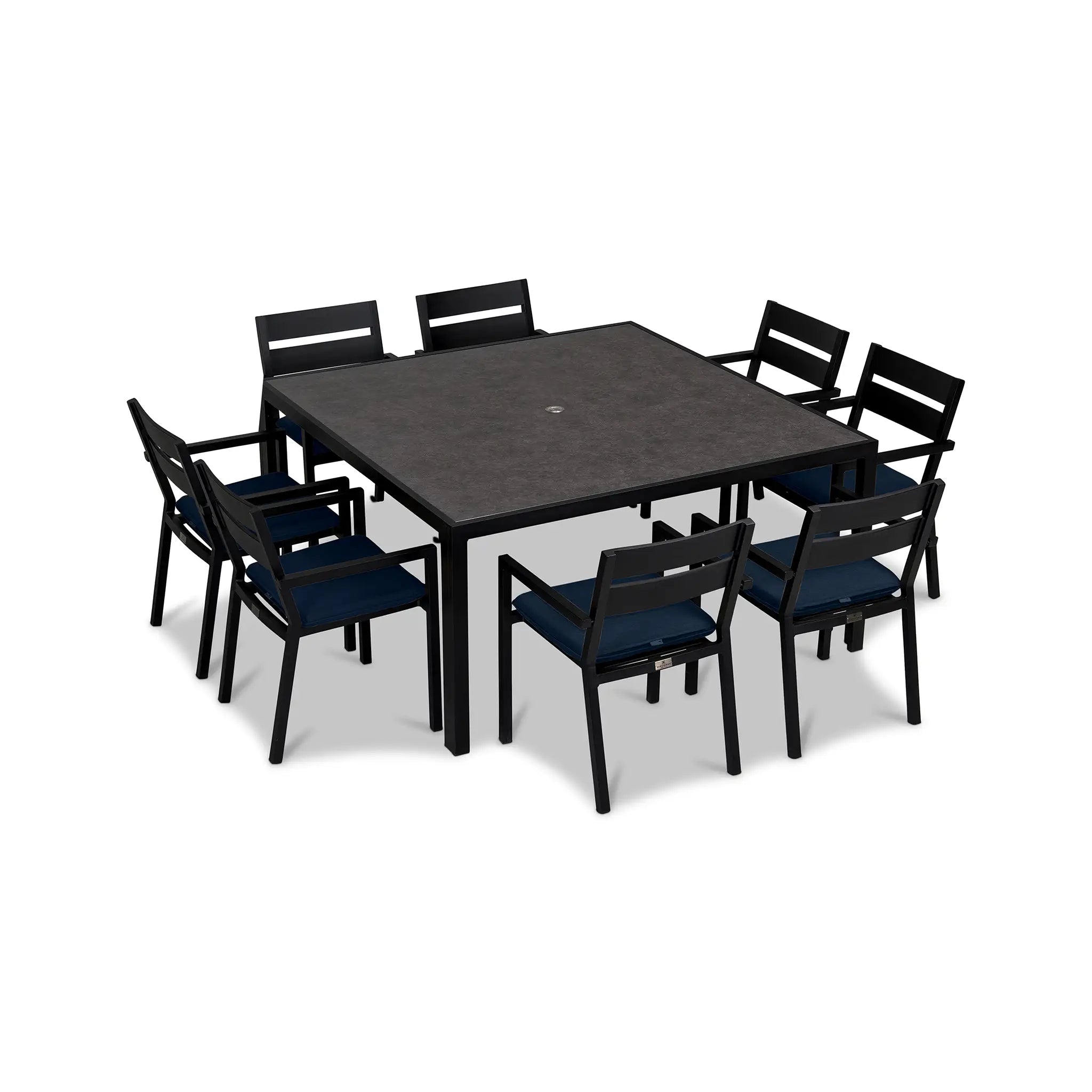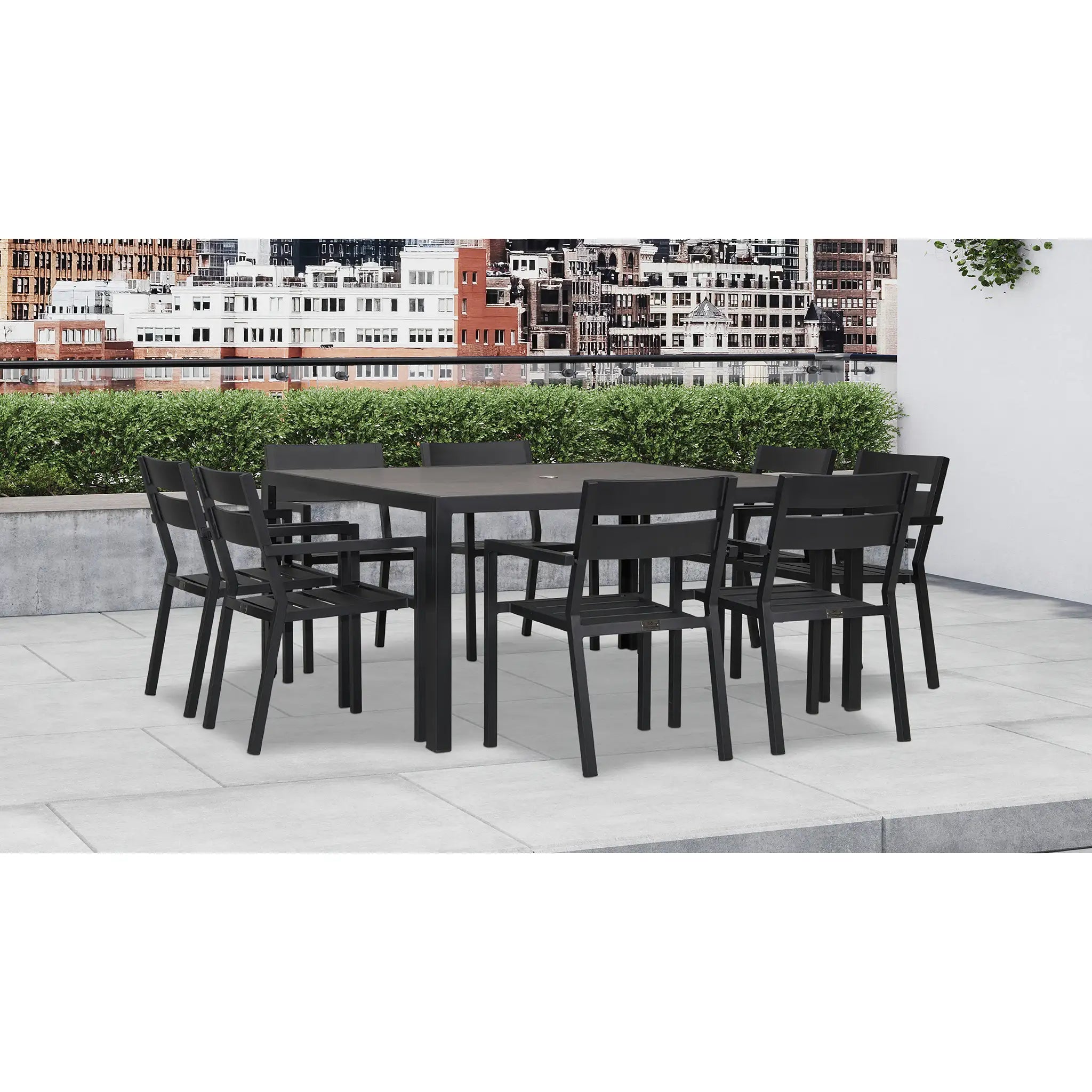 The Harmonia Living Pacifica 9 Piece Aluminum Square Dining Set - Black is a stunning addition to any outdoor dining space, seamlessly blending modern elegance, durability, and comfort. Designed for both residential and commercial settings, this set is perfect for hosting gatherings, al fresco meals, and casual outdoor entertaining.