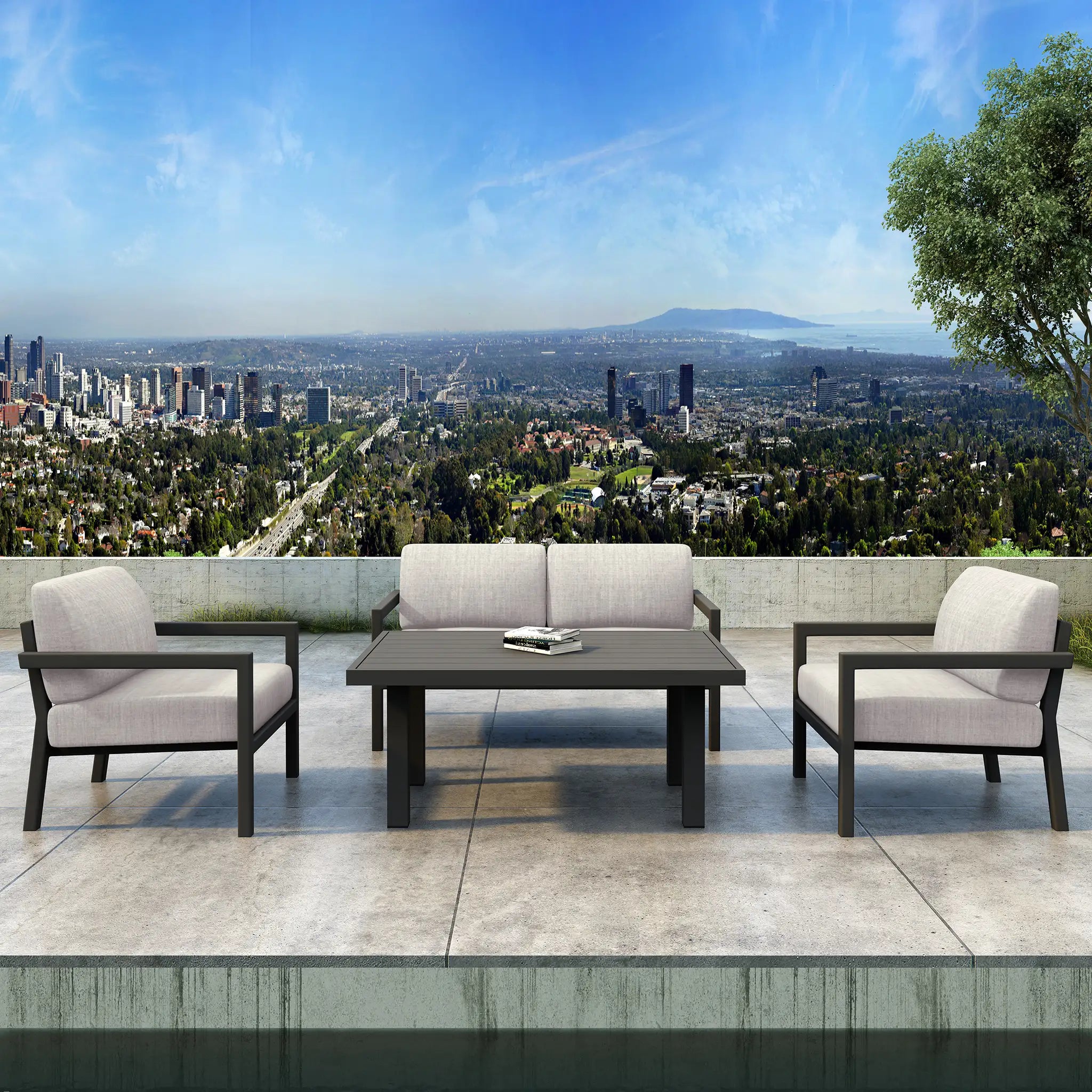 The Harmonia Living Pacifica Classic 4 Piece Aluminum Loveseat Set - Slate brings a perfect blend of refinement, relaxation, and modern simplicity to any outdoor space. With its sleek lines, gentle angles, and plush cushions, this minimalist yet inviting seating arrangement is ideal for both expansive patios and compact balconies. The timeless, contemporary silhouette makes it a versatile addition to any setting, seamlessly enhancing coastal retreats, urban rooftops, and garden terraces alike.