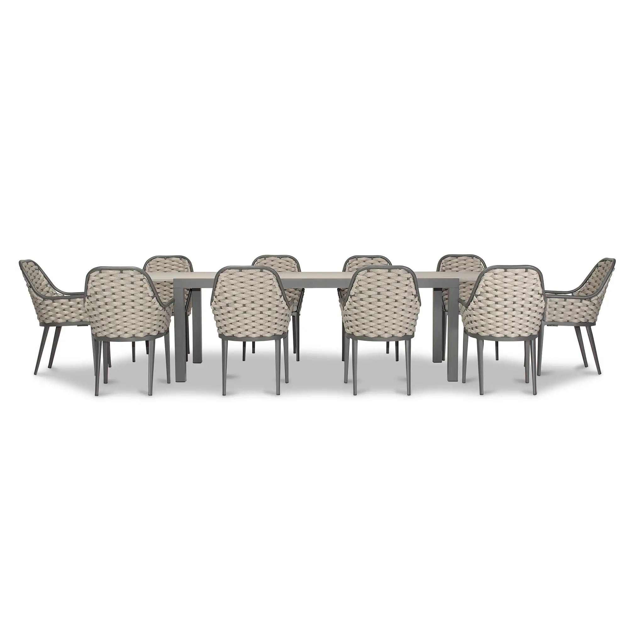 The Harmonia Living Parlor 13 Piece Aluminum Extendable Dining Set - Slate blends the stately traditions of a bygone era with modern colors and materials, creating a timeless yet contemporary outdoor dining experience.
