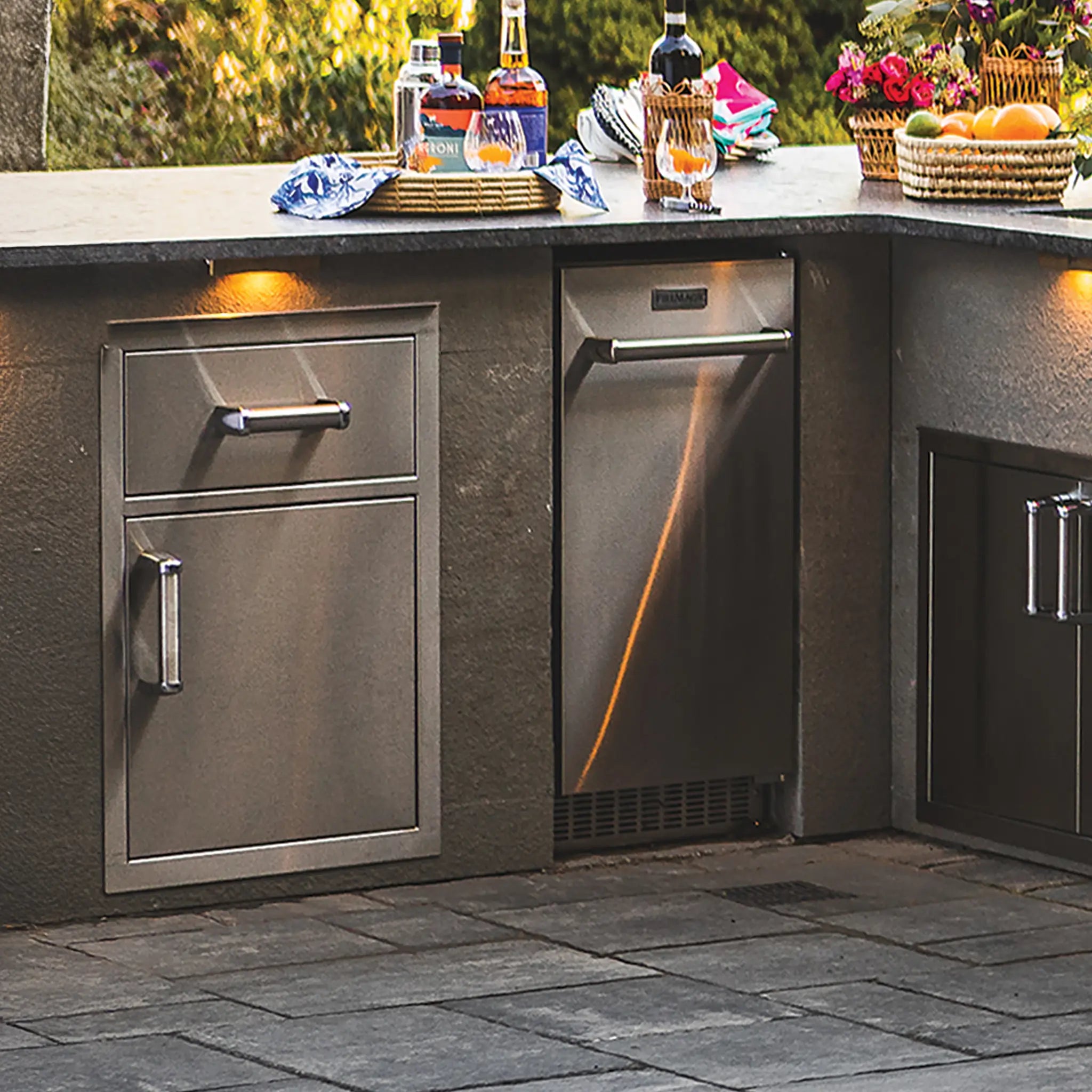 Fire Magic Premium Large Pantry Door and Drawer Combo installed into the counter of a modern outdoor kitchen setup
