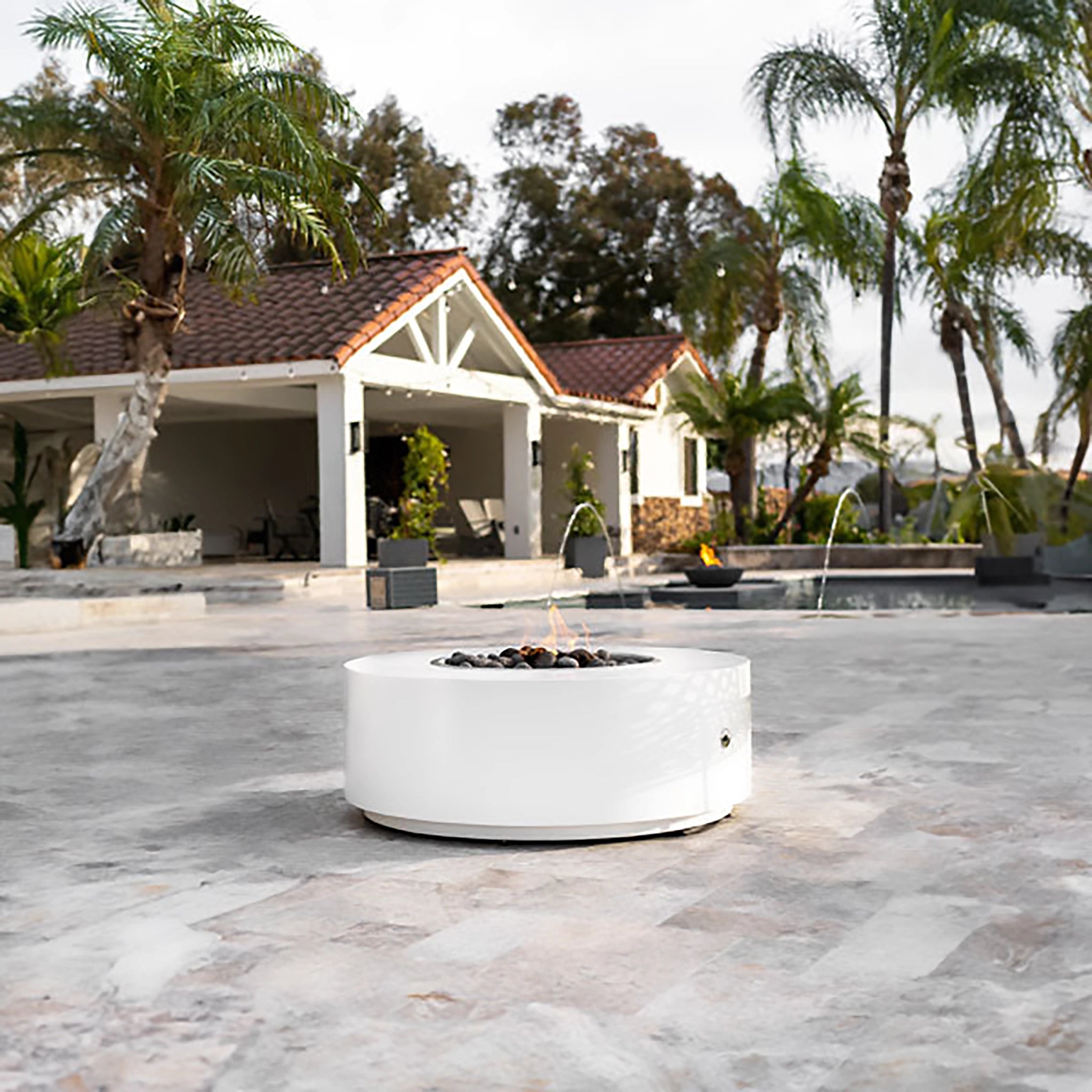 The Outdoor Plus 48-inch Round Unity Fire Pit in a clean white finish, offering a fresh and sleek look. The bright white color stands out in any outdoor environment, creating a refined and contemporary visual appeal that enhances the outdoor experience