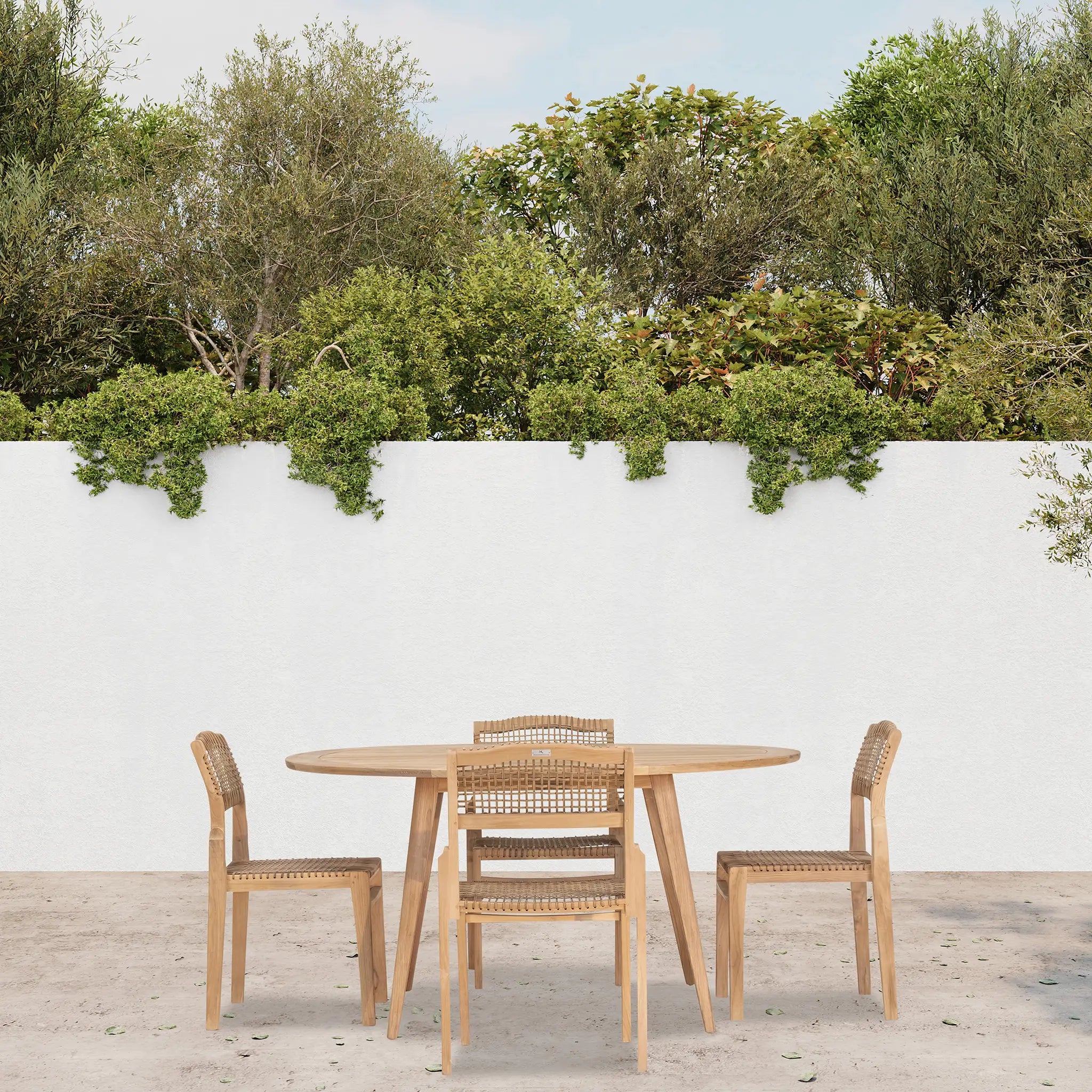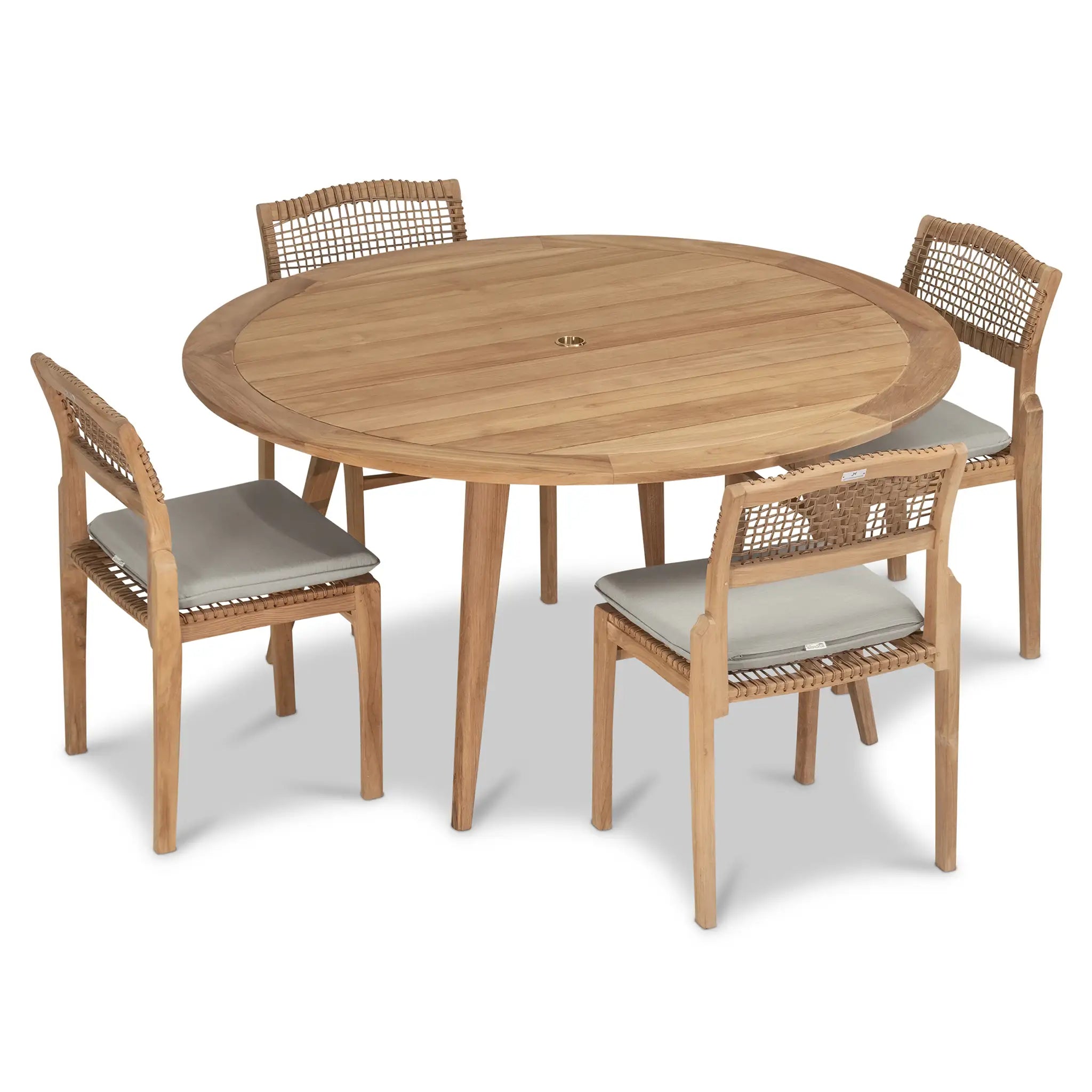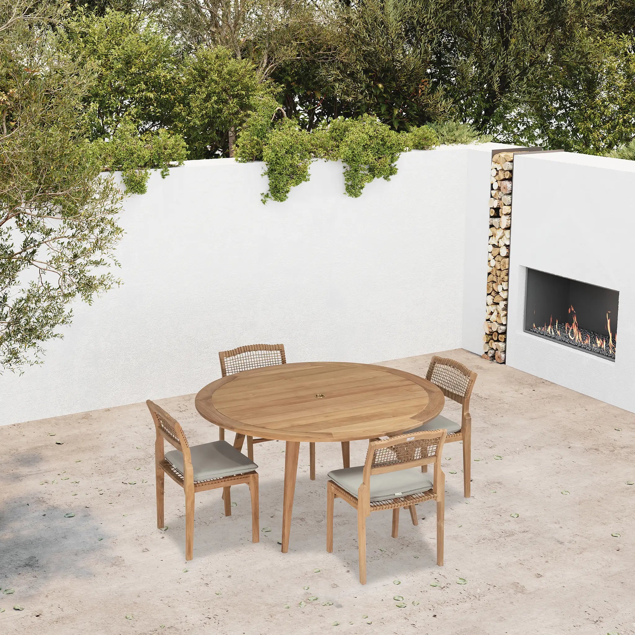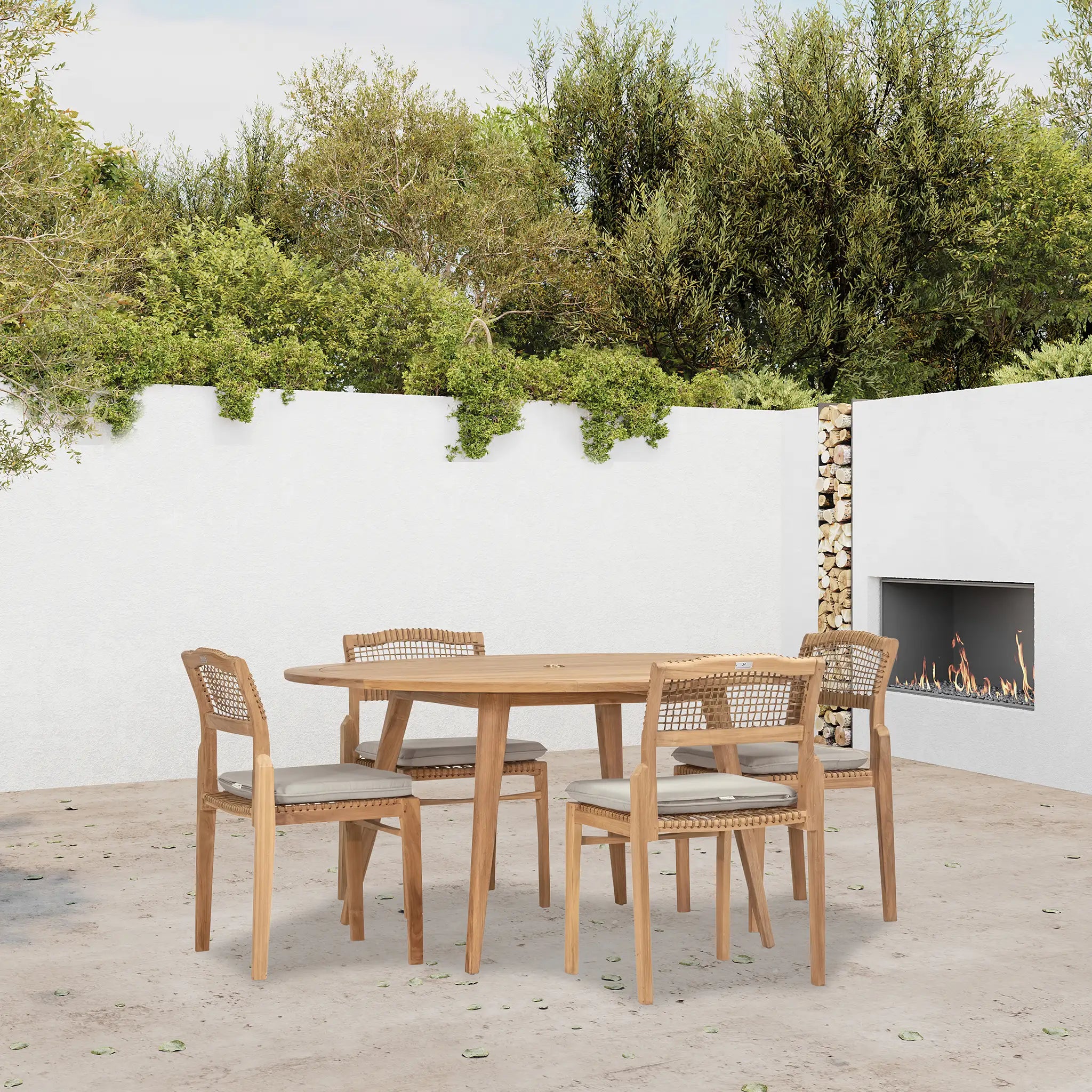 The round dining table showcases a stylish Mid-Century Modern aesthetic, offering a timeless yet contemporary look. Whether placed in a residential backyard or a commercial patio setting, the Sands 5 Piece Dining Set delivers exceptional quality, comfort, and design, making it the perfect addition to any outdoor space.