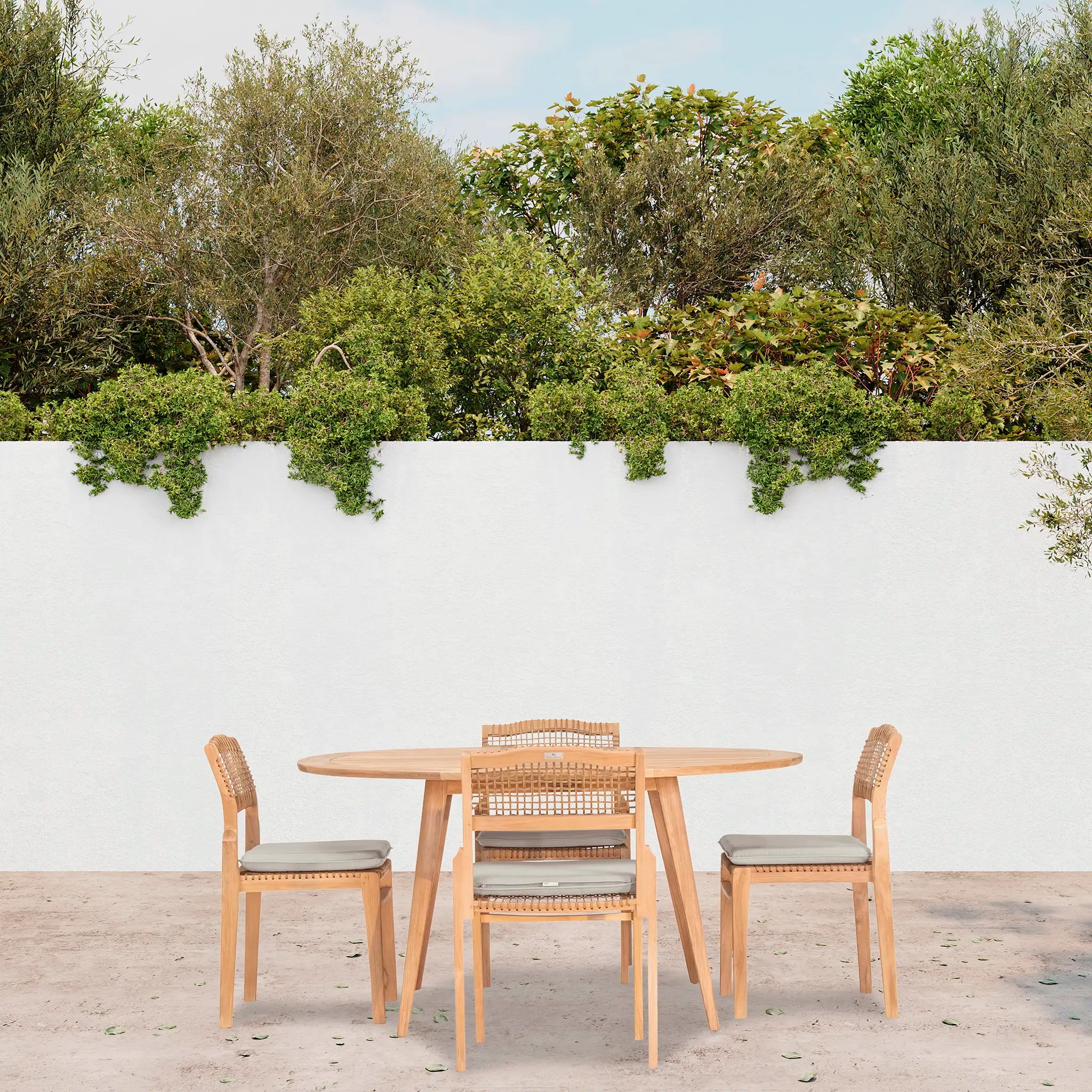 The Harmonia Living Sands 5 Piece Round Dining Set blends mixed materials and architectural accents, creating a stylish yet practical outdoor dining solution.