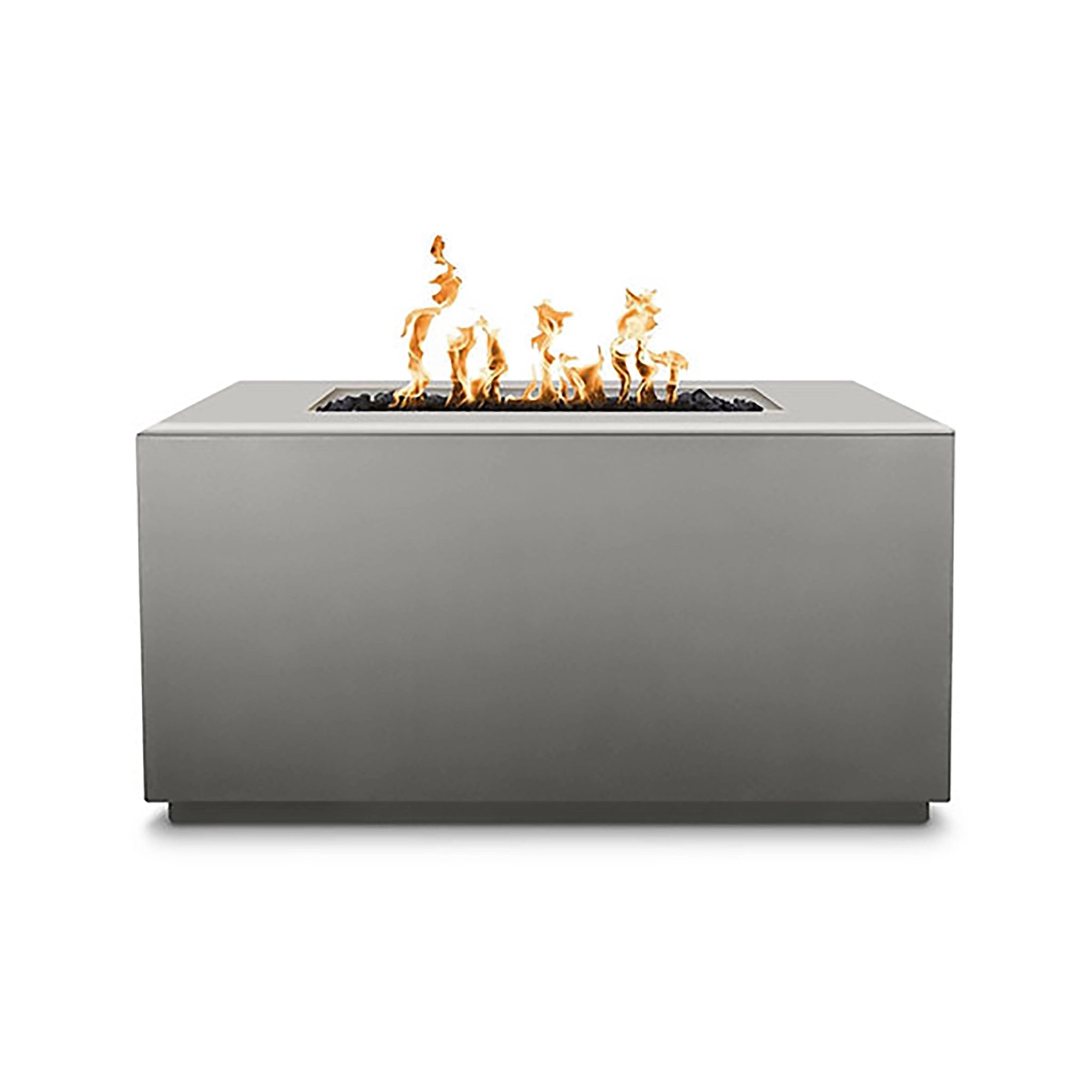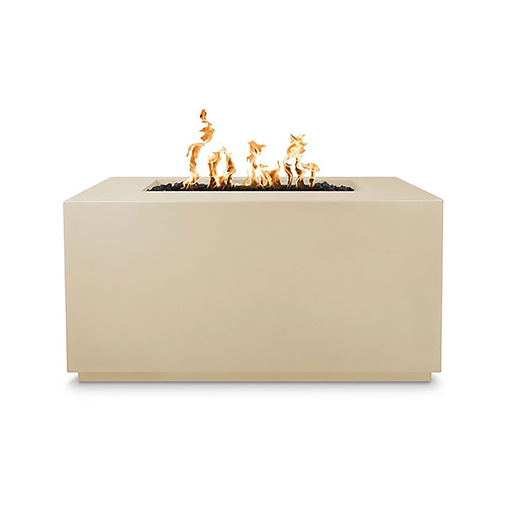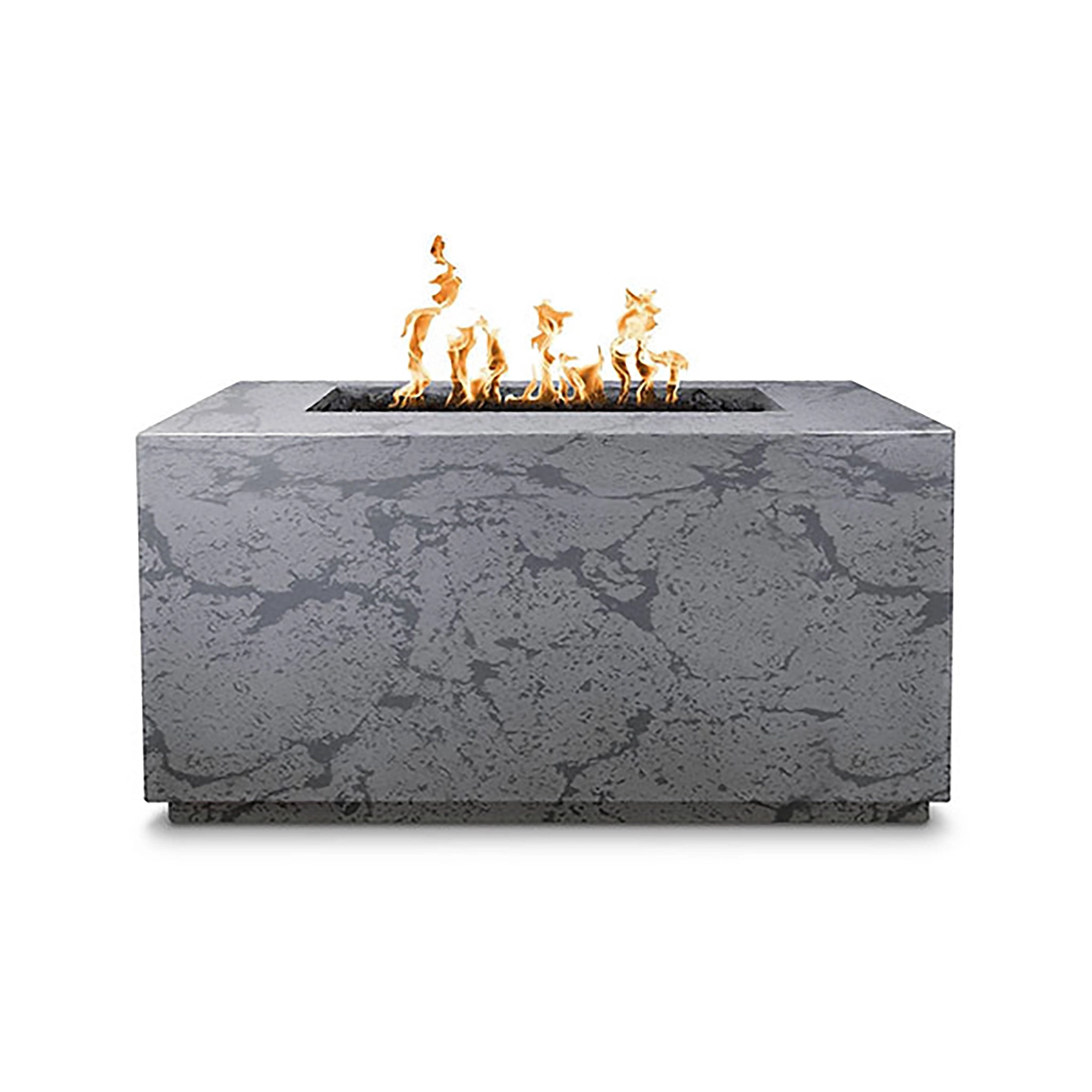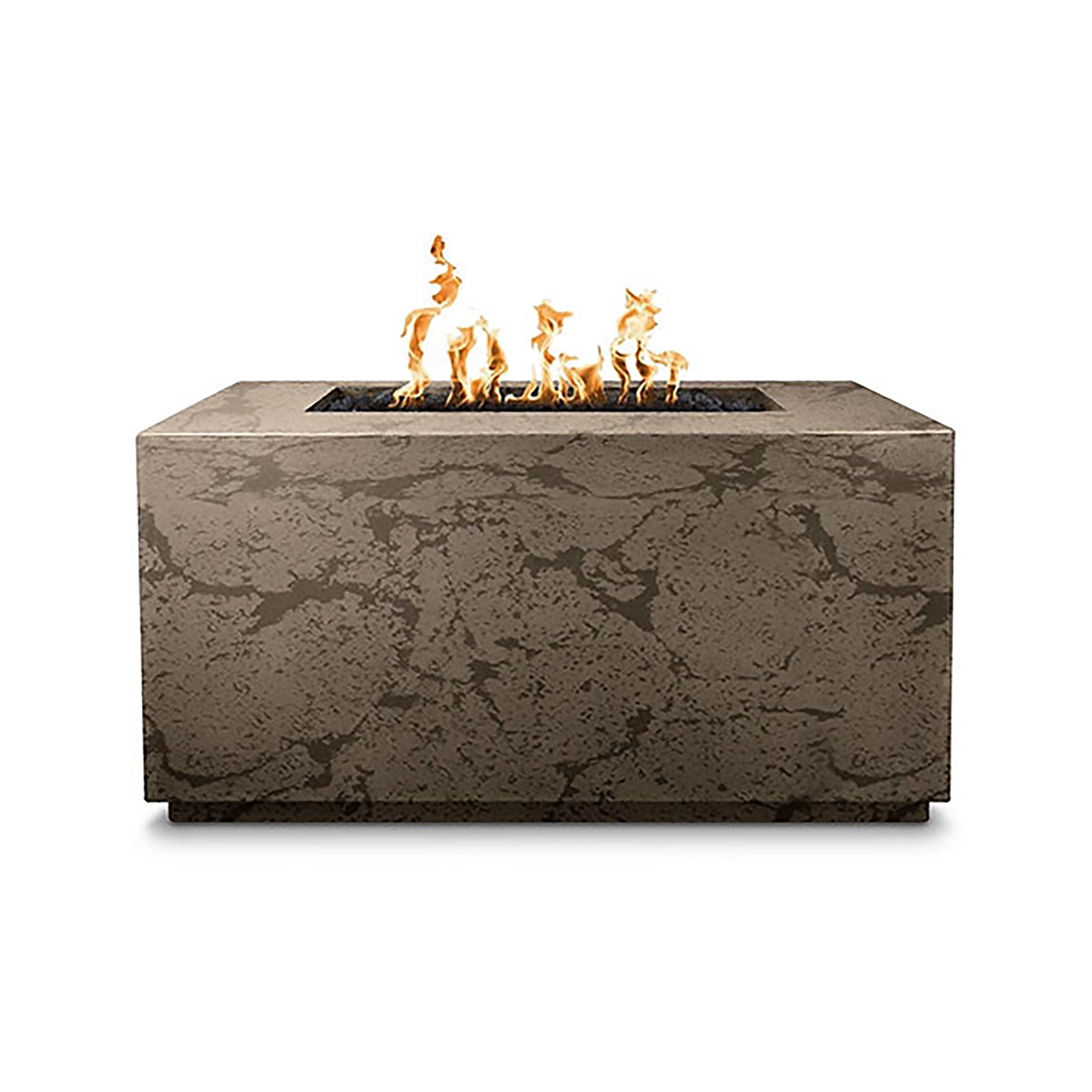 The Outdoor Plus 48-inch Pismo Concrete Gas Fire Pit in bronze finish, featuring a polished look that complements both rustic and modern outdoor settings. The fire pit's rectangular burner is filled with black lava rock, creating a beautiful flame presentation. Its durable concrete construction ensures longevity and resistance to outdoor elements, making it a stunning centerpiece for outdoor spaces.