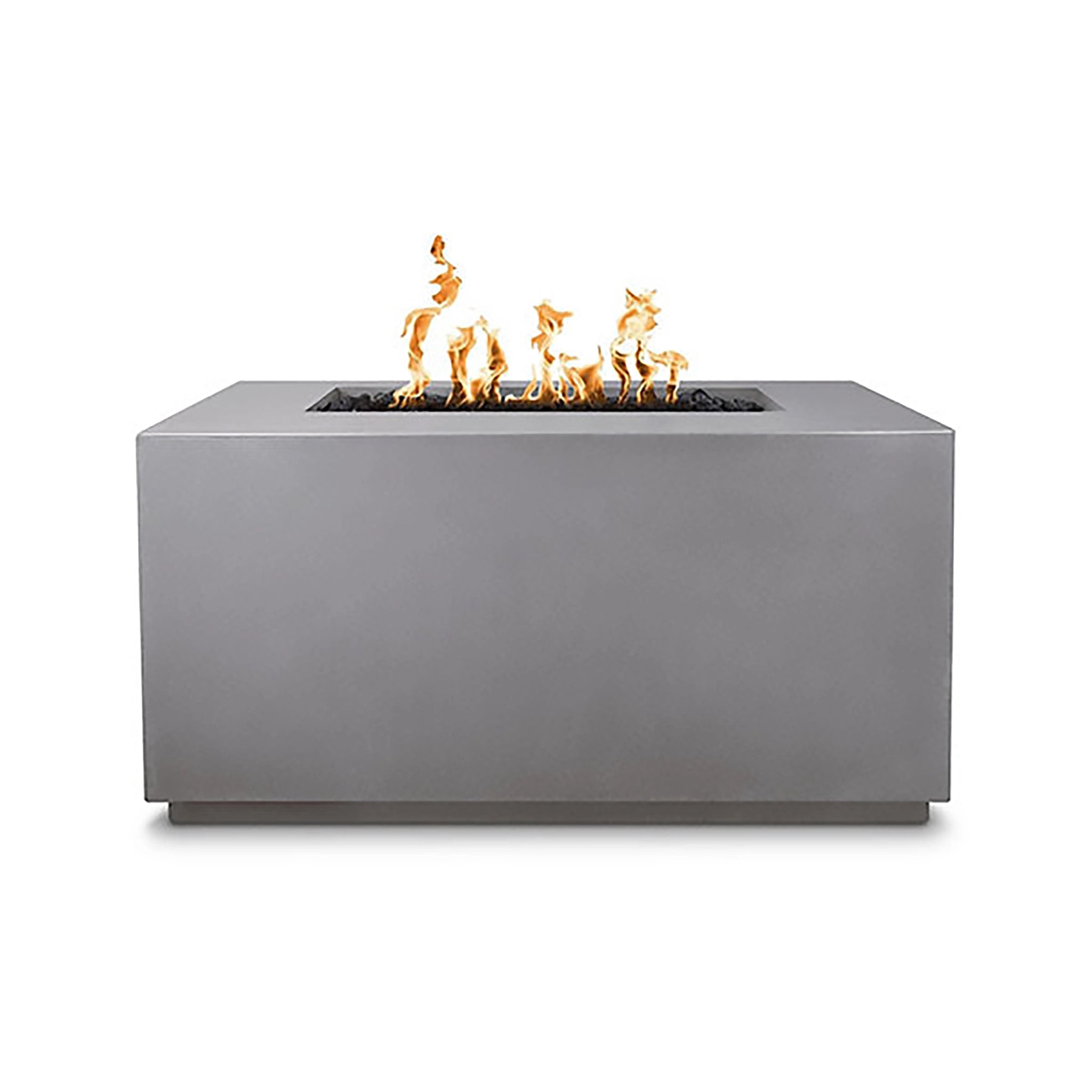 The Outdoor Plus 48-inch Pismo Concrete Gas Fire Pit in ash finish, showcasing a sleek and minimalist rectangular design. This premium concrete fire pit features a center rectangular burner filled with black lava rock and an extended flame pattern, creating a warm and inviting atmosphere for any outdoor space. Ideal for contemporary patio settings, this luxury fire pit offers both functionality and style for modern backyard aesthetics.
