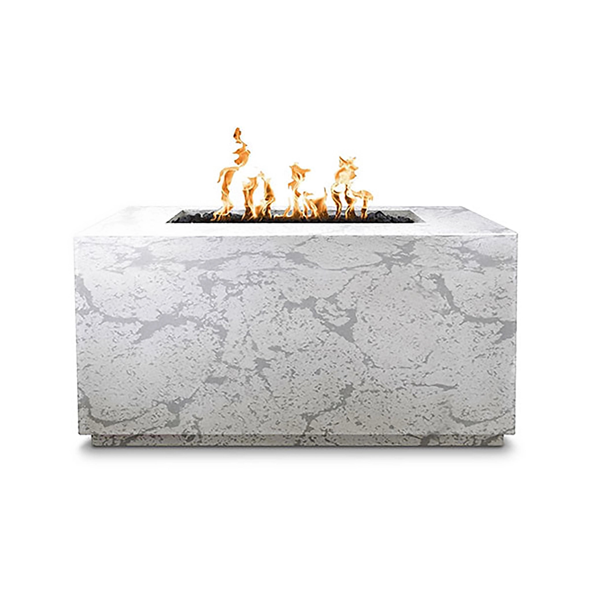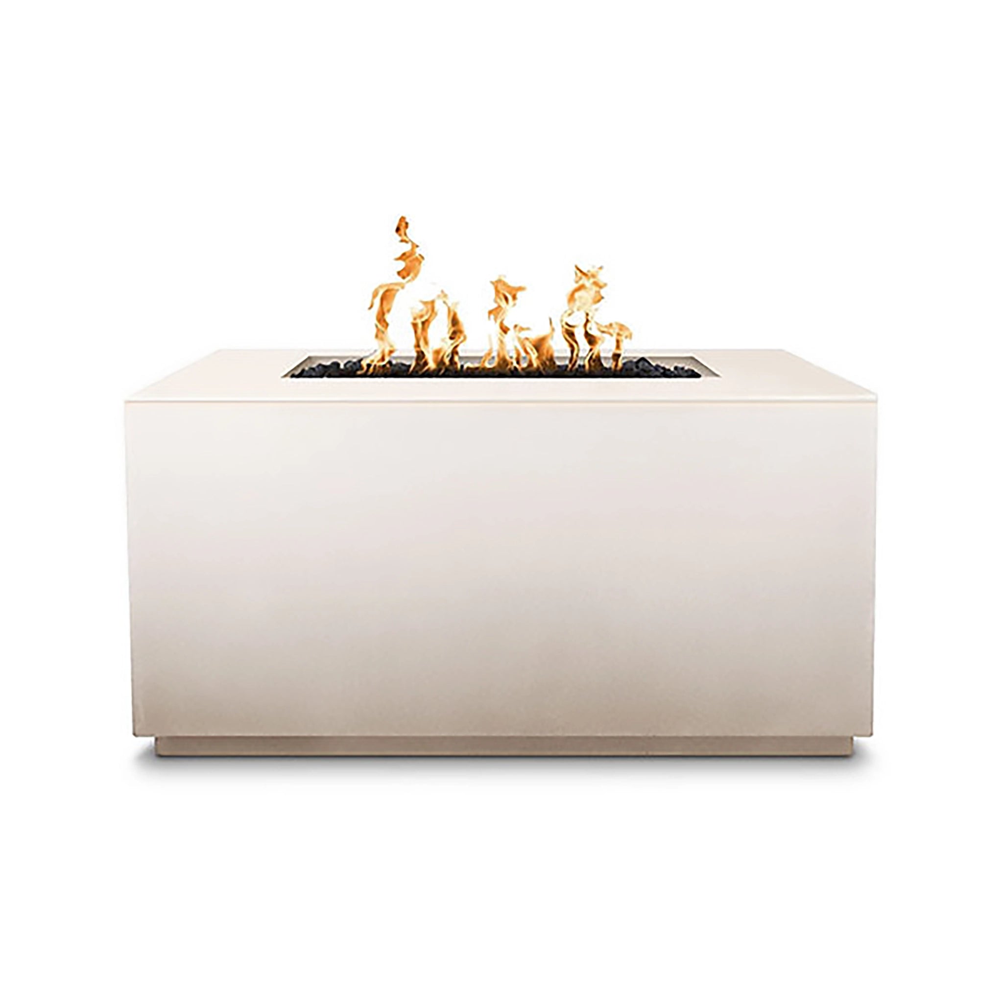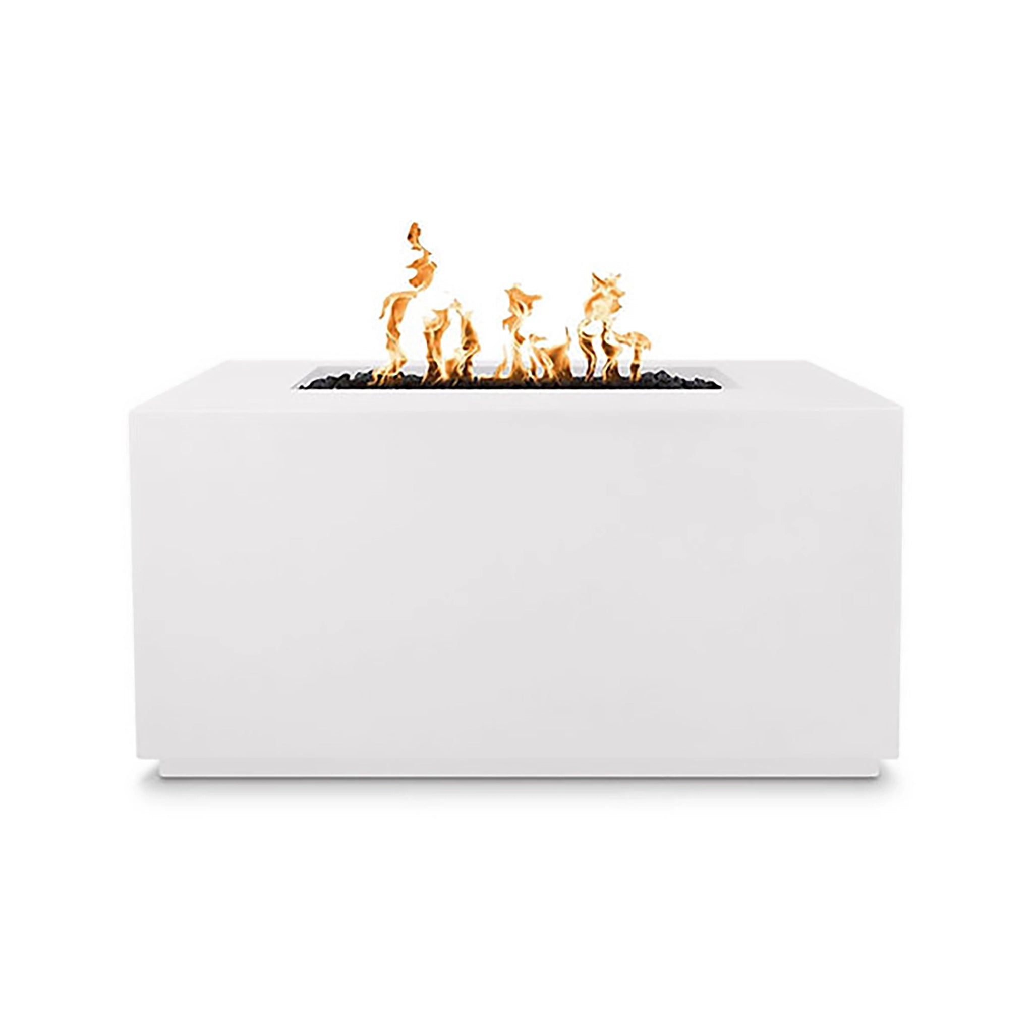 The Outdoor Plus 48-inch Pismo Concrete Gas Fire Pit in modern white finish, featuring a rectangular design, displayed in an outdoor garden setting with sleek landscaping. This fire pit is perfect for contemporary outdoor spaces, adding warmth and style to any patio or backyard with its elegant concrete body and powerful flame. Ideal for enhancing ambiance and functionality in luxury outdoor living spaces.