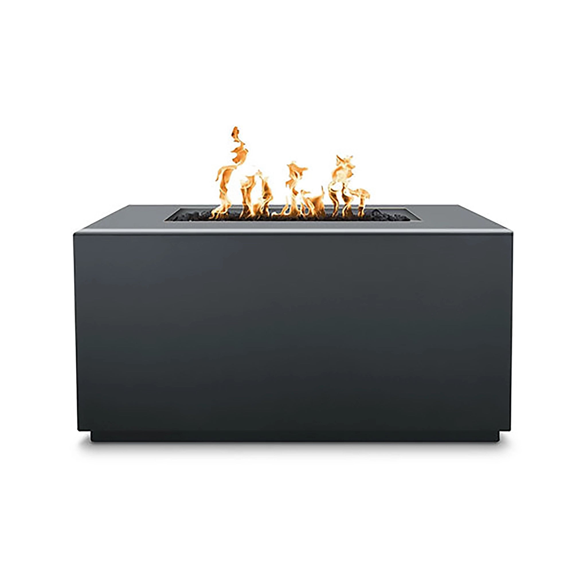 The Outdoor Plus 48-inch Pismo Concrete Gas Fire Pit in black finish, highlighting its elegant and modern aesthetic. This rectangular fire pit is constructed with high-quality concrete and features a center burner filled with black lava rock, providing a striking visual contrast. Perfect for evening gatherings and outdoor entertaining, this fire pit adds a sophisticated touch to any patio or backyard.