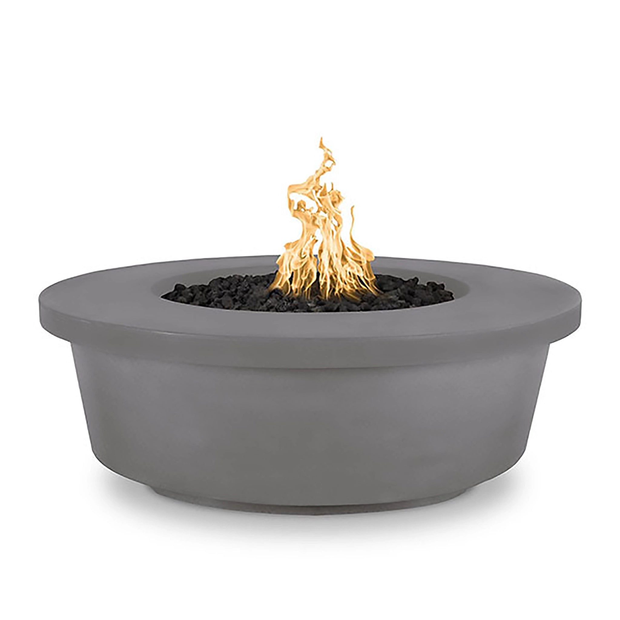The Outdoor Plus 48-inch Tempe Concrete Gas Fire Pit in Gray finish. This contemporary fire pit in a soft gray tone adds a sleek and minimalist look to outdoor areas. Its wide-rimmed bowl shape and solid concrete construction make it a durable and stylish centerpiece for any patio or garden. The natural gray color blends seamlessly with a variety of outdoor décors, enhancing the overall aesthetic.