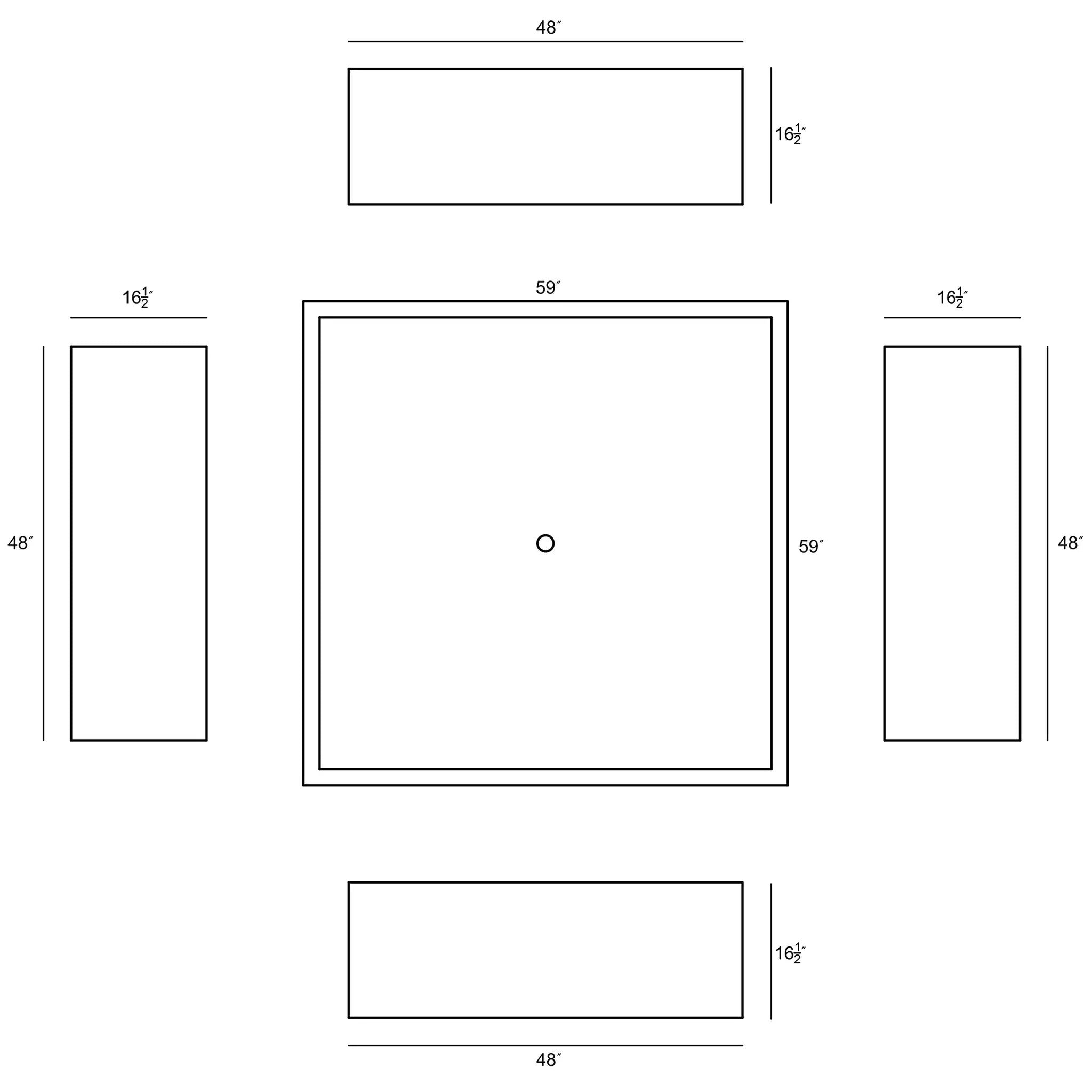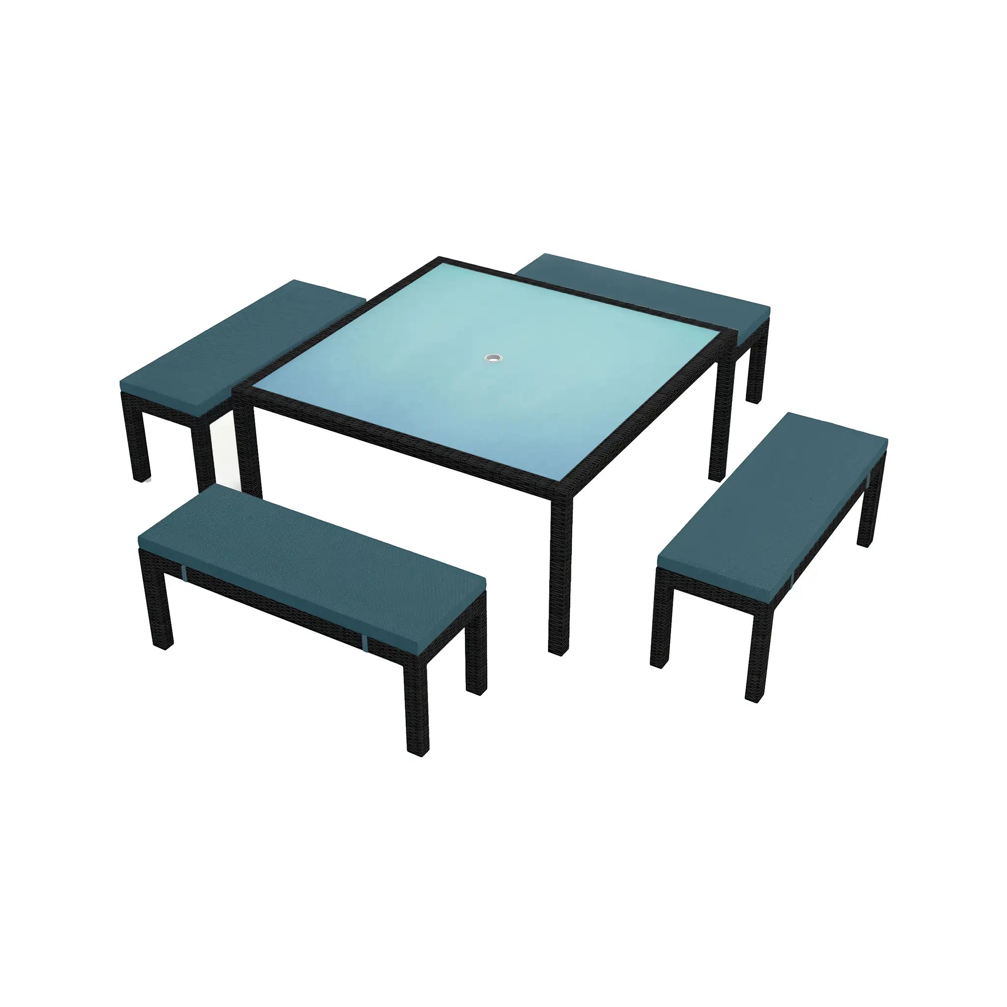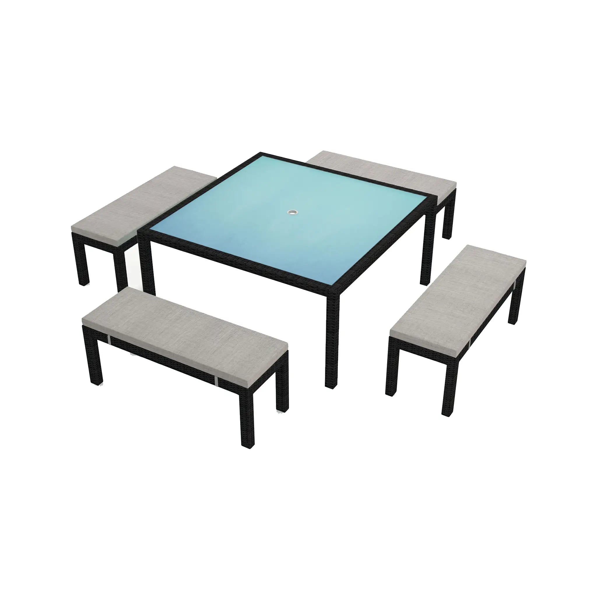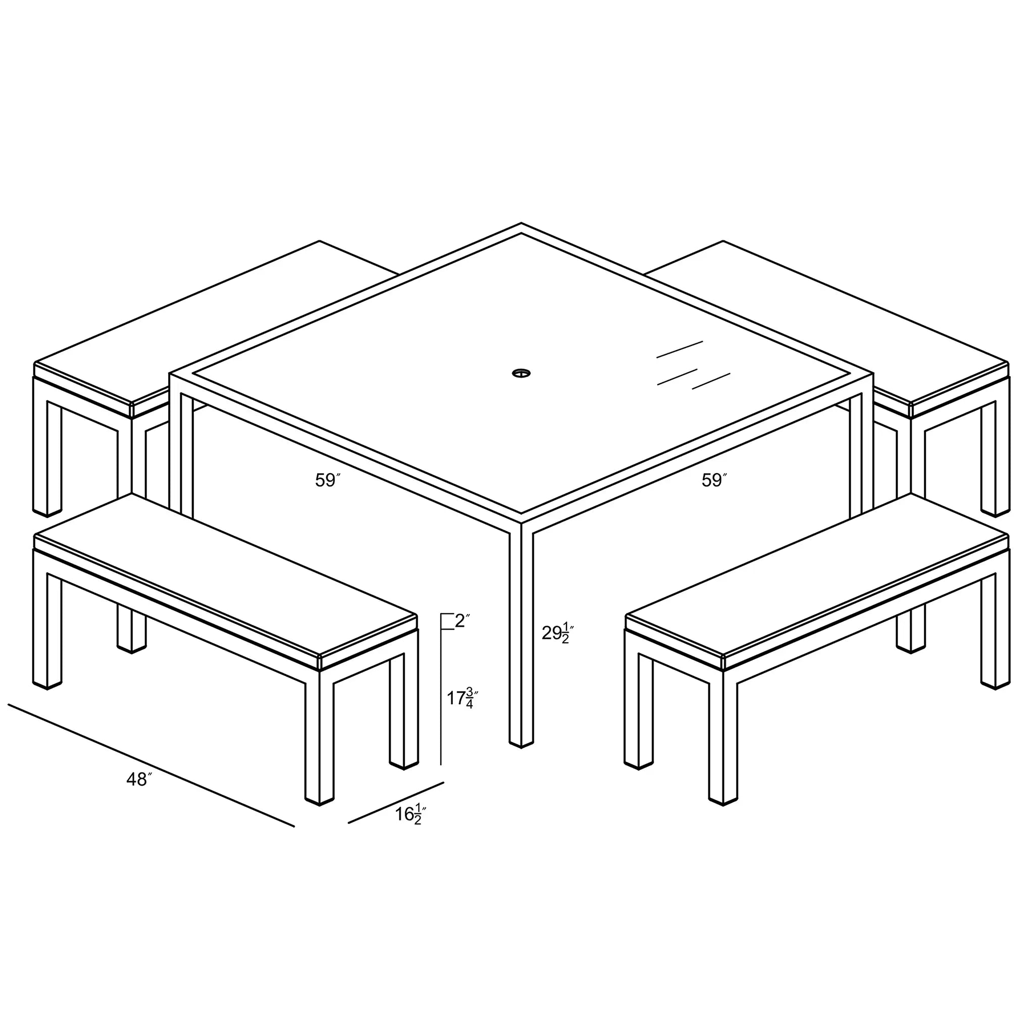 The dining table is topped with extra-strong tempered glass, delivering a sleek, easy-to-clean surface that is perfect for both casual meals and formal outdoor dining. Whether hosting large family gatherings, outdoor dinner parties, or daily alfresco meals, the Urbana 5 Piece 8-Seat Bench Square Dining Set offers a versatile, stylish, and functional addition to any modern outdoor space.