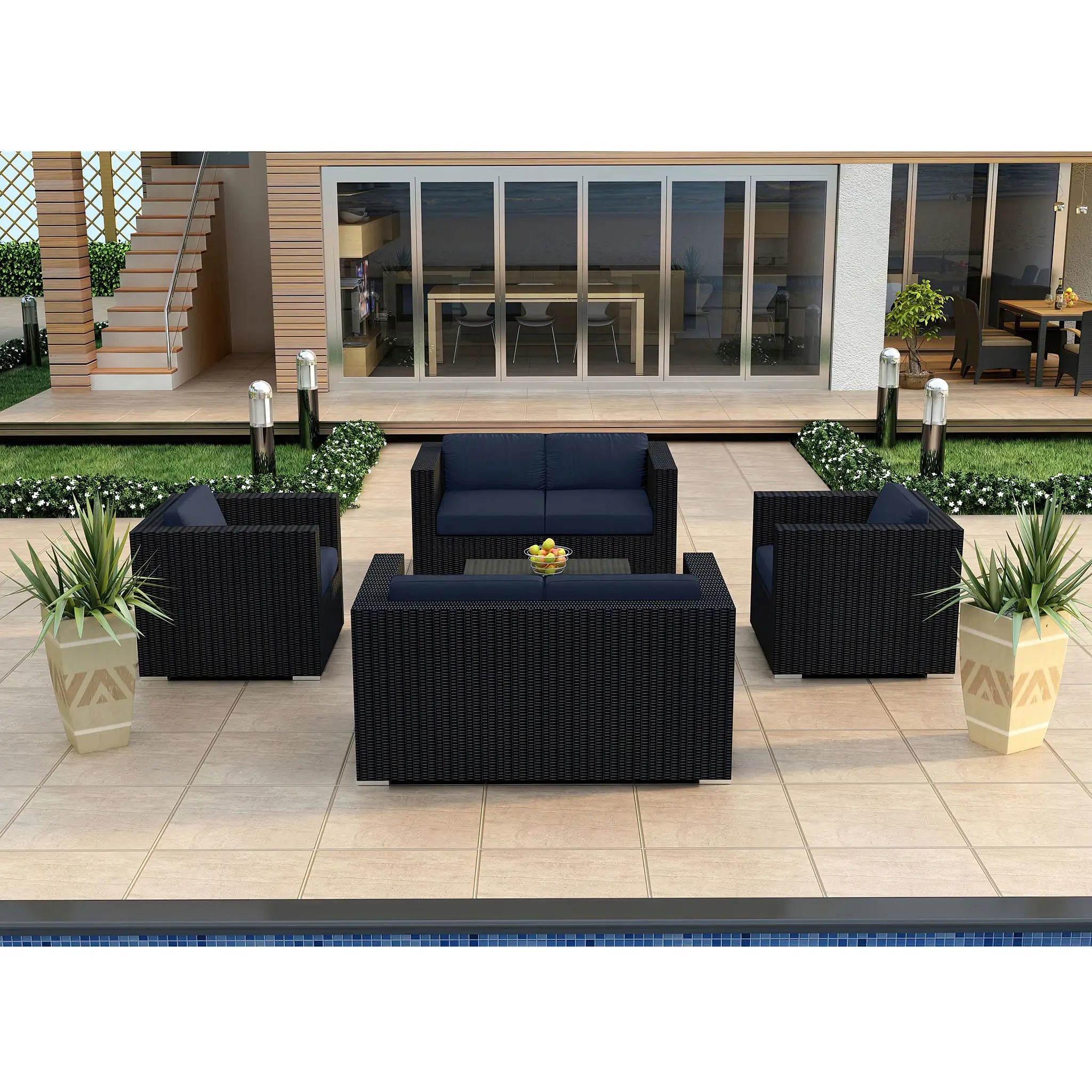 The Harmonia Living Urbana 5 Piece Aluminum Double Loveseat Set is designed to bring sophisticated style and luxurious comfort to your outdoor living space. With a modern, streamlined design, this set includes two loveseats, a coffee table, and two club chairs, making it perfect for intimate gatherings or relaxing evenings outdoors.