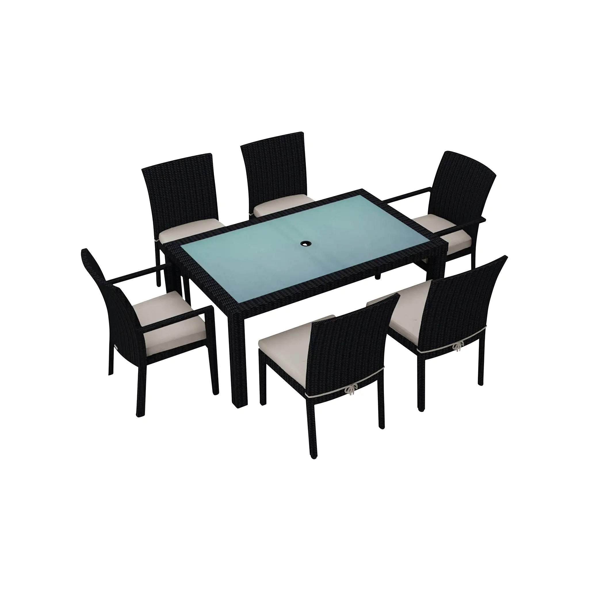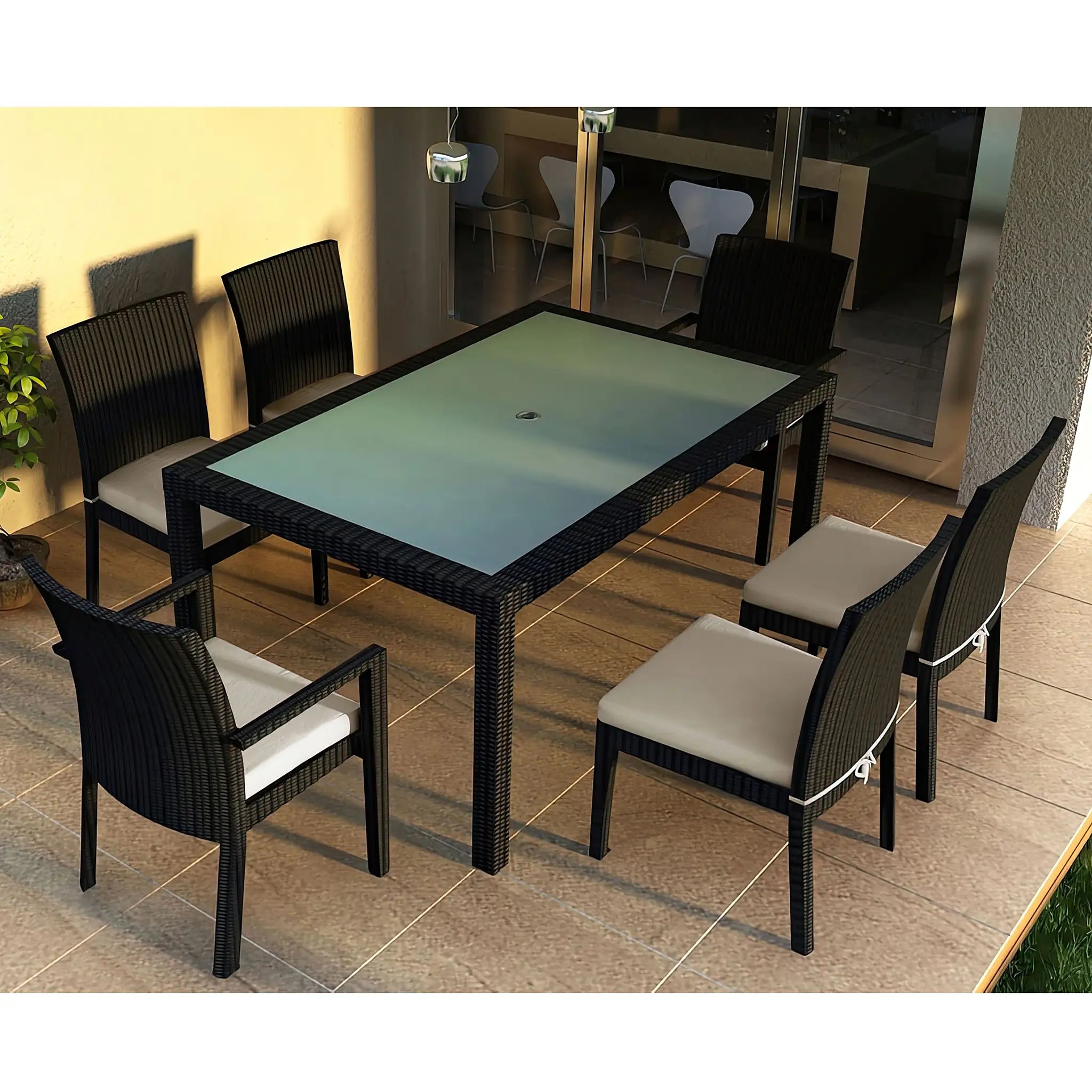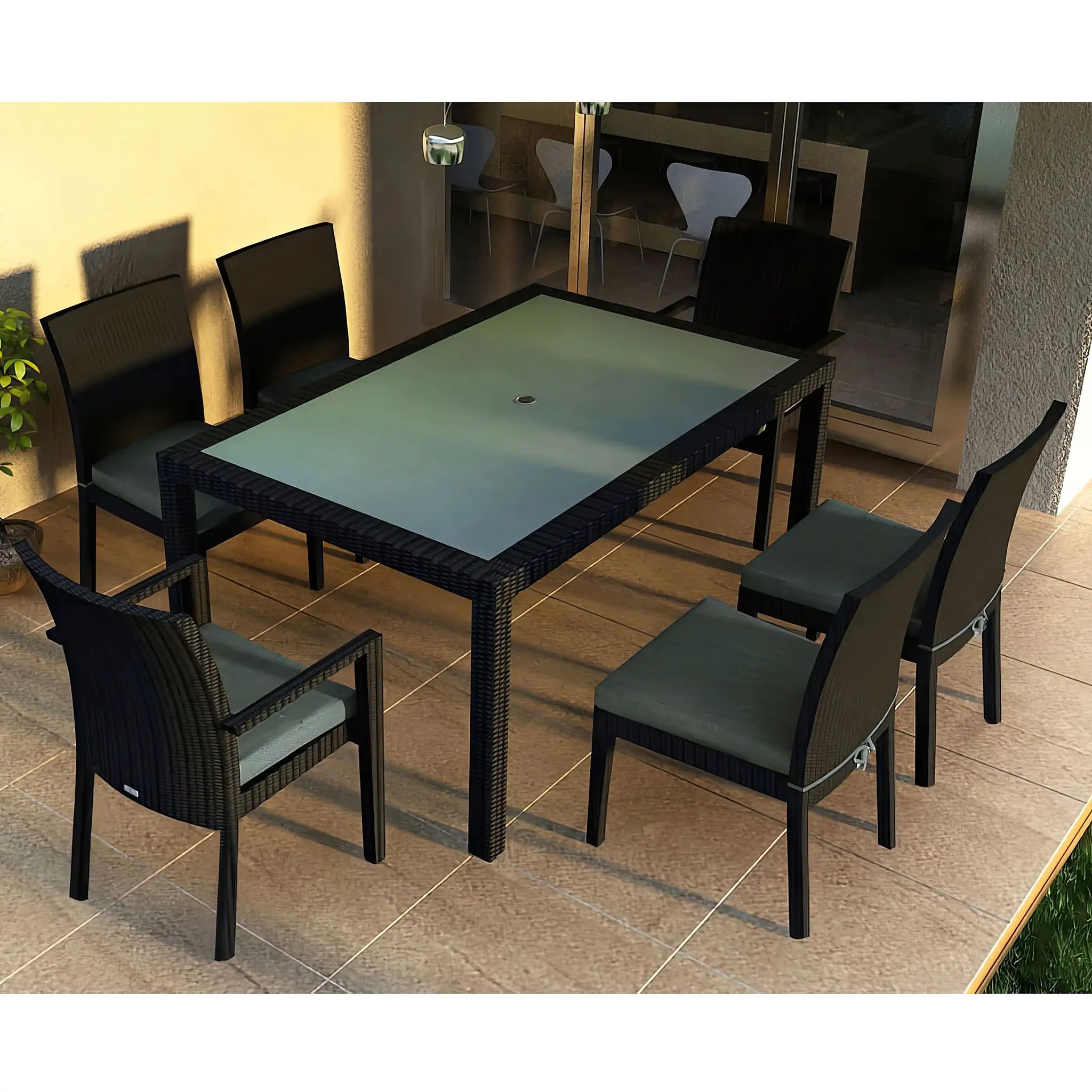 The dining table is topped with extra-strong tempered glass, providing a sleek and durable surface that is easy to clean and ideal for frequent gatherings. Whether hosting casual family meals, formal outdoor dinners, or weekend brunches, this versatile dining set is designed to accommodate both residential and commercial spaces. Pair it with other pieces from the Urbana Collection to create a cohesive and inviting outdoor dining area that blends style, function, and durability for years of enjoyment.