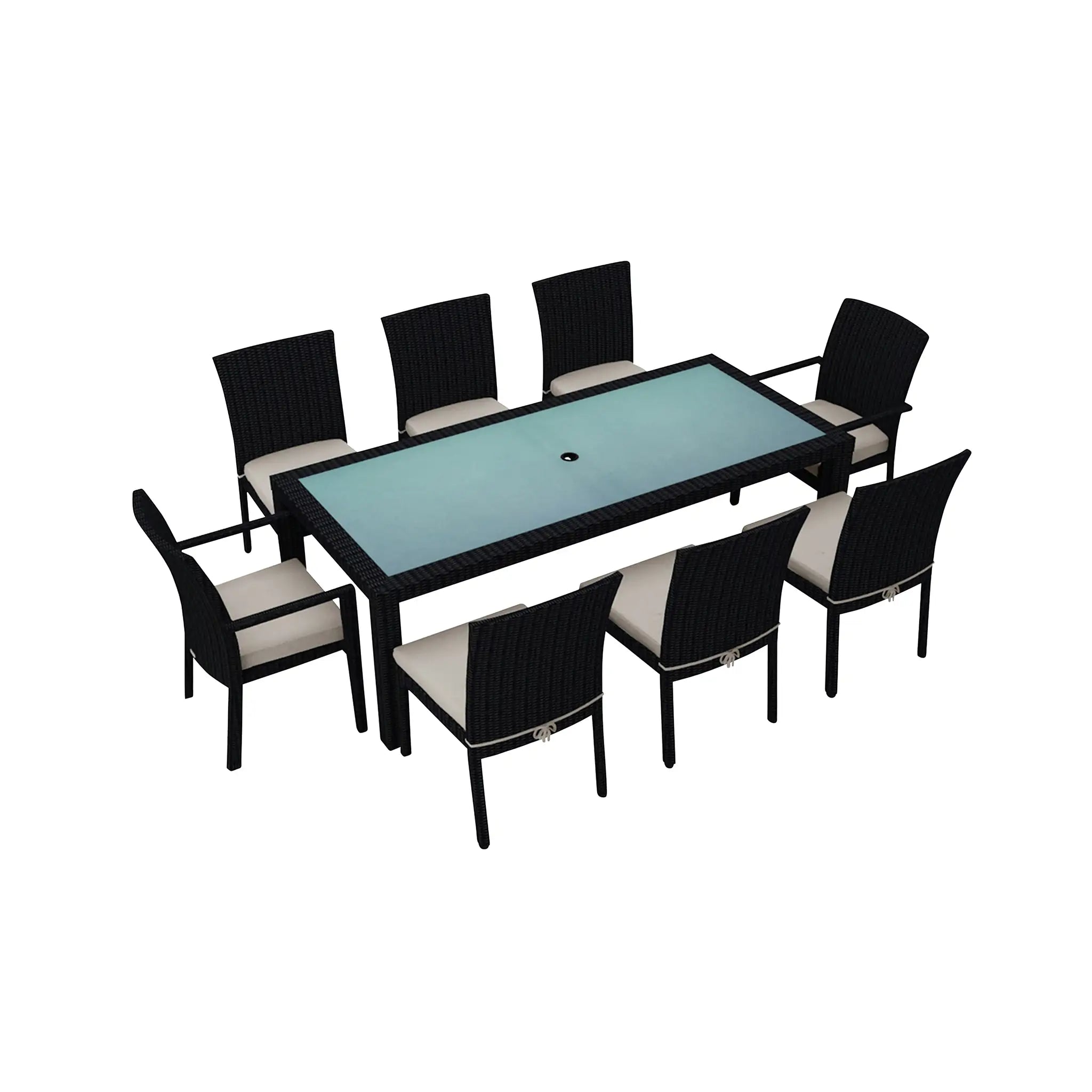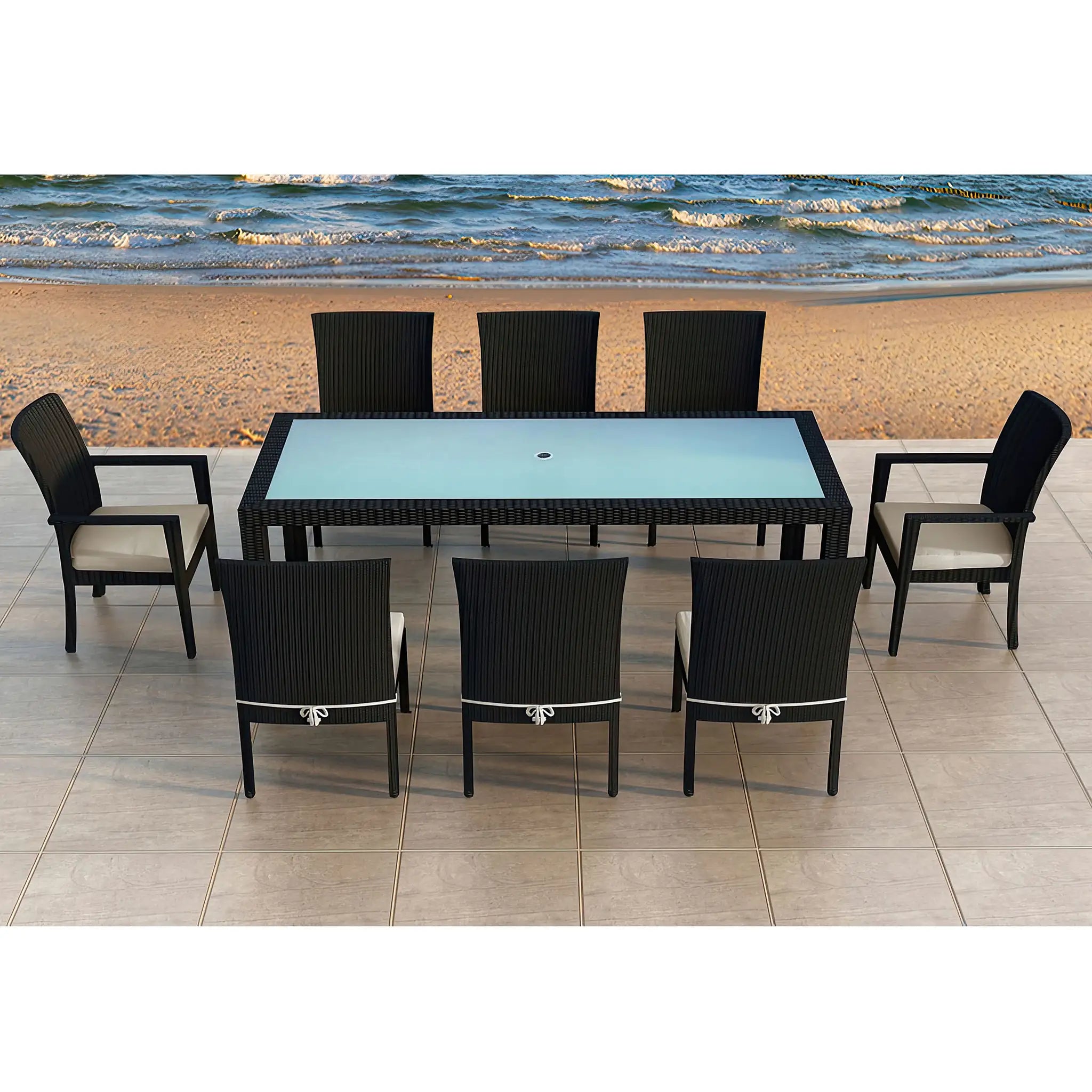 The dining table is topped with tempered glass, adding a sleek, polished finish while providing a sturdy and easy-to-clean surface that is ideal for daily use. Whether hosting intimate dinners or lively gatherings, the Urbana 9 Piece Dining Set delivers a balance of style, durability, and comfort, making it an exceptional choice for modern outdoor living.